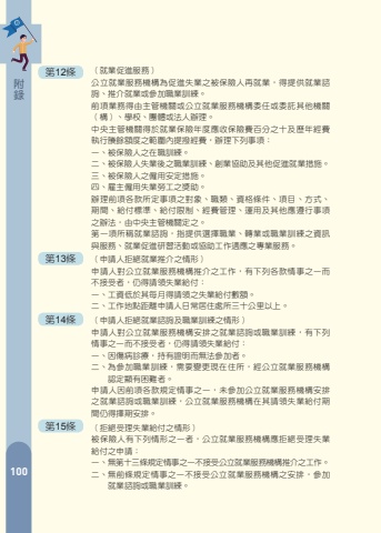 088%u9644%u9304130%u7b2c12%u689d %u3000%uff08%u5c31%u696d%u4fc3%u9032%u670d%u52d9%uff09%u516c%u7acb%u5c31%u696d%u670d%u52d9%u6a5f%u69cb%u70ba%u4fc3%u9032%u5931%u696d%u4e4b%u88ab%u4fdd%u96aa%u4eba%u518d%u5c31%u696d%uff0c%u5f97%u63d0%u4f9b%u5c31%u696d%u8aee%u8a62%u3001%u63a8%u4ecb%u5c31%u696d%u6216%u53c3%u52a0%u8077%u696d%u8a13%u7df4%u3002%u524d%u9805%u696d%u52d9%u5f97%u7531%u4e3b%u7ba1%u6a5f%u95dc%u6216%u516c%u7acb%u5c31%u696d%u670d%u52d9%u6a5f%u69cb%u59d4%u4efb%u6216%u59d4%u8a17%u5176%u4ed6%u6a5f%u95dc%uff08%u69cb%uff09%u3001%u5b78%u6821%u3001%u5718%u9ad4%u6216%u6cd5%u4eba%u8fa6%u7406%u3002%u4e2d%u592e%u4e3b%u7ba1%u6a5f%u95dc%u5f97%u65bc%u5c31%u696d%u4fdd%u96aa%u5e74%u5ea6%u61c9%u6536%u4fdd%u96aa%u8cbb%u767e%u5206%u4e4b%u5341%u53ca%u6b77%u5e74%u7d93%u8cbb%u57f7%u884c%u8cf8%u9918%u984d%u5ea6%u4e4b%u7bc4%u570d%u5167%u63d0%u64a5%u7d93%u8cbb%uff0c%u8fa6%u7406%u4e0b%u5217%u4e8b%u9805%uff1a%u4e00%u3001%u88ab%u4fdd%u96aa%u4eba%u4e4b%u5728%u8077%u8a13%u7df4%u3002%u4e8c%u3001%u88ab%u4fdd%u96aa%u4eba%u5931%u696d%u5f8c%u4e4b%u8077%u696d%u8a13%u7df4%u3001%u5275%u696d%u5354%u52a9%u53ca%u5176%u4ed6%u4fc3%u9032%u5c31%u696d%u63aa%u65bd%u3002%u4e09%u3001%u88ab%u4fdd%u96aa%u4eba%u4e4b%u50f1%u7528%u5b89%u5b9a%u63aa%u65bd%u3002%u56db%u3001%u96c7%u4e3b%u50f1%u7528%u5931%u696d%u52de%u5de5%u4e4b%u734e%u52a9%u3002%u8fa6%u7406%u524d%u9805%u5404%u6b3e%u6240%u5b9a%u4e8b%u9805%u4e4b%u5c0d%u8c61%u3001%u8077%u985e%u3001%u8cc7%u683c%u689d%u4ef6%u3001%u9805%u76ee%u3001%u65b9%u5f0f%u3001%u671f%u9593%u3001%u7d66%u4ed8%u6a19%u6e96%u3001%u7d66%u4ed8%u9650%u5236%u3001%u7d93%u8cbb%u7ba1%u7406%u3001%u904b%u7528%u53ca%u5176%u4ed6%u61c9%u9075%u884c%u4e8b%u9805%u4e4b%u8fa6%u6cd5%uff0c%u7531%u4e2d%u592e%u4e3b%u7ba1%u6a5f%u95dc%u5b9a%u4e4b%u3002%u7b2c%u4e00%u9805%u6240%u7a31%u5c31%u696d%u8aee%u8a62%uff0c%u6307%u63d0%u4f9b%u9078%u64c7%u8077%u696d%u3001%u8f49%u696d%u6216%u8077%u696d%u8a13%u7df4%u4e4b%u8cc7%u8a0a%u8207%u670d%u52d9%u3001%u5c31%u696d%u4fc3%u9032%u7814%u7fd2%u6d3b%u52d5%u6216%u5354%u52a9%u5de5%u4f5c%u9069%u61c9%u4e4b%u5c08%u696d%u670d%u52d9%u3002%u7b2c13%u689d %u3000%uff08%u7533%u8acb%u4eba%u62d2%u7d55%u5c31%u696d%u63a8%u4ecb%u4e4b%u60c5%u5f62%uff09%u7533%u8acb%u4eba%u5c0d%u516c%u7acb%u5c31%u696d%u670d%u52d9%u6a5f%u69cb%u63a8%u4ecb%u4e4b%u5de5%u4f5c%uff0c%u6709%u4e0b%u5217%u5404%u6b3e%u60c5%u4e8b%u4e4b%u4e00%u800c%u4e0d%u63a5%u53d7%u8005%uff0c%u4ecd%u5f97%u8acb%u9818%u5931%u696d%u7d66%u4ed8%uff1a%u4e00%u3001%u5de5%u8cc7%u4f4e%u65bc%u5176%u6bcf%u6708%u5f97%u8acb%u9818%u4e4b%u5931%u696d%u7d66%u4ed8%u6578%u984d%u3002%u4e8c%u3001%u5de5%u4f5c%u5730%u9ede%u8ddd%u96e2%u7533%u8acb%u4eba%u65e5%u5e38%u5c45%u4f4f%u8655%u6240%u4e09%u5341%u516c%u91cc%u4ee5%u4e0a%u3002%u7b2c14%u689d %u3000%uff08%u7533%u8acb%u4eba%u62d2%u7d55%u5c31%u696d%u8aee%u8a62%u53ca%u8077%u696d%u8a13%u7df4%u4e4b%u60c5%u5f62%uff09%u7533%u8acb%u4eba%u5c0d%u516c%u7acb%u5c31%u696d%u670d%u52d9%u6a5f%u69cb%u5b89%u6392%u4e4b%u5c31%u696d%u8aee%u8a62%u6216%u8077%u696d%u8a13%u7df4%uff0c%u6709%u4e0b%u5217%u60c5%u4e8b%u4e4b%u4e00%u800c%u4e0d%u63a5%u53d7%u8005%uff0c%u4ecd%u5f97%u8acb%u9818%u5931%u696d%u7d66%u4ed8%uff1a%u4e00%u3001%u56e0%u50b7%u75c5%u8a3a%u7642%uff0c%u6301%u6709%u8b49%u660e%u800c%u7121%u6cd5%u53c3%u52a0%u8005%u3002%u4e8c%u3001%u70ba%u53c3%u52a0%u8077%u696d%u8a13%u7df4%uff0c%u9700%u8981%u8b8a%u66f4%u73fe%u5728%u4f4f%u6240%uff0c%u7d93%u516c%u7acb%u5c31%u696d%u670d%u52d9%u6a5f%u69cb%u8a8d%u5b9a%u986f%u6709%u56f0%u96e3%u8005%u3002%u7533%u8acb%u4eba%u56e0%u524d%u9805%u5404%u6b3e%u898f%u5b9a%u60c5%u4e8b%u4e4b%u4e00%uff0c%u672a%u53c3%u52a0%u516c%u7acb%u5c31%u696d%u670d%u52d9%u6a5f%u69cb%u5b89%u6392%u4e4b%u5c31%u696d%u8aee%u8a62%u6216%u8077%u696d%u8a13%u7df4%uff0c%u516c%u7acb%u5c31%u696d%u670d%u52d9%u6a5f%u69cb%u5728%u5176%u8acb%u9818%u5931%u696d%u7d66%u4ed8%u671f%u9593%u4ecd%u5f97%u64c7%u671f%u5b89%u6392%u3002%u7b2c15%u689d %u3000%uff08%u62d2%u7d55%u53d7%u7406%u5931%u696d%u7d66%u4ed8%u4e4b%u60c5%u5f62%uff09%u88ab%u4fdd%u96aa%u4eba%u6709%u4e0b%u5217%u60c5%u5f62%u4e4b%u4e00%u8005%uff0c%u516c%u7acb%u5c31%u696d%u670d%u52d9%u6a5f%u69cb%u61c9%u62d2%u7d55%u53d7%u7406%u5931%u696d%u7d66%u4ed8%u4e4b%u7533%u8acb%uff1a%u4e00%u3001%u7121%u7b2c%u5341%u4e09%u689d%u898f%u5b9a%u60c5%u4e8b%u4e4b%u4e00%u4e0d%u63a5%u53d7%u516c%u7acb%u5c31%u696d%u670d%u52d9%u6a5f%u69cb%u63a8%u4ecb%u4e4b%u5de5%u4f5c%u3002%u4e8c%u3001%u7121%u524d%u689d%u898f%u5b9a%u60c5%u4e8b%u4e4b%u4e00%u4e0d%u63a5%u53d7%u516c%u7acb%u5c31%u696d%u670d%u52d9%u6a5f%u69cb%u4e4b%u5b89%u6392%uff0c%u53c3%u52a0%u5c31%u696d%u8aee%u8a62%u6216%u8077%u696d%u8a13%u7df4%u3002089%u7b2c16%u689d %u3000%uff08%u5931%u696d%u7d66%u4ed8%u6a19%u6e96%u3001%u671f%u9593%u53ca%u5e74%u8cc7%u8a08%u7b97%uff09%u9644%u9304 %u5931%u696d%u7d66%u4ed8%u6309%u7533%u8acb%u4eba%u96e2%u8077%u8fa6%u7406%u672c%u4fdd%u96aa%u9000%u4fdd%u4e4b%u7576%u6708%u8d77%u524d%u516d%u500b%u6708%u5e73%u5747%u6708%u6295%u4fdd%u85aa%u8cc7%u767e%u5206%u4e4b%u516d%u5341%u6309%u6708%u767c%u7d66%uff0c%u6700%u9577%u767c%u7d66%u516d%u500b%u6708%u3002%u4f46%u7533%u8acb%u4eba%u96e2%u8077%u8fa6%u7406%u672c%u4fdd%u96aa%u9000%u4fdd%u6642%u5df2%u5e74%u6eff%u56db%u5341%u4e94%u6b72%u6216%u9818%u6709%u793e%u653f%u4e3b%u7ba1%u6a5f%u95dc%u6838%u767c%u4e4b%u8eab%u5fc3%u969c%u7919%u8b49%u660e%u8005%uff0c%u6700%u9577%u767c%u7d66%u4e5d%u500b%u6708%u3002%u4e2d%u592e%u4e3b%u7ba1%u6a5f%u95dc%u65bc%u7d93%u6fdf%u4e0d%u666f%u6c23%u81f4%u5927%u91cf%u5931%u696d%u6216%u5176%u4ed6%u7dca%u6025%u60c5%u4e8b%u6642%uff0c%u65bc%u5be9%u914c%u5931%u696d%u7387%u53ca%u5176%u4ed6%u60c5%u5f62%u5f8c%uff0c%u5f97%u5ef6%u9577%u524d%u9805%u4e4b%u7d66%u4ed8%u671f%u9593%u6700%u9577%u81f3%u4e5d%u500b%u6708%uff0c%u5fc5%u8981%u6642%u5f97%u518d%u5ef6%u9577%u4e4b%uff0c%u4f46%u6700%u9577%u4e0d%u5f97%u8d85%u904e%u5341%u4e8c%u500b%u6708%u3002%u4f46%u5ef6%u9577%u7d66%u4ed8%u671f%u9593%u4e0d%u9069%u7528%u7b2c%u5341%u4e09%u689d%u53ca%u7b2c%u5341%u516b%u689d%u4e4b%u898f%u5b9a%u3002%u524d%u9805%u5ef6%u9577%u5931%u696d%u7d66%u4ed8%u671f%u9593%u4e4b%u8a8d%u5b9a%u6a19%u6e96%u3001%u8acb%u9818%u5c0d%u8c61%u3001%u8acb%u9818%u689d%u4ef6%u3001%u5be