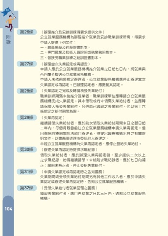 092%u9644%u9304130%u7b2c26%u689d %u3000%uff08%u8fa6%u7406%u63a8%u4ecb%u53ca%u5b89%u6392%u8a13%u7df4%u5f97%u8981%u6c42%u63d0%u4f9b%u6587%u4ef6%uff09%u516c%u7acb%u5c31%u696d%u670d%u52d9%u6a5f%u69cb%u70ba%u8fa6%u7406%u63a8%u4ecb%u5c31%u696d%u53ca%u5b89%u6392%u8077%u696d%u8a13%u7df4%u6240%u9700%uff0c%u5f97%u8981%u6c42%u7533%u8acb%u4eba%u63d0%u4f9b%u4e0b%u5217%u6587%u4ef6%uff1a%u4e00%u3001%u6700%u9ad8%u5b78%u6b77%u53ca%u7d93%u6b77%u8b49%u66f8%u5f71%u672c%u3002%u4e8c%u3001%u5c08%u9580%u8077%u696d%u53ca%u6280%u8853%u4eba%u54e1%u8b49%u7167%u6216%u57f7%u696d%u57f7%u7167%u5f71%u672c%u3002%u4e09%u3001%u66fe%u63a5%u53d7%u8077%u696d%u8a13%u7df4%u4e4b%u7d50%u8a13%u8b49%u66f8%u5f71%u672c%u3002%u7b2c27%u689d %u3000%uff08%u8fa6%u7406%u7576%u6b21%u5931%u696d%u8a8d%u5b9a%u6216%u518d%u8a8d%u5b9a%uff09%u7533%u8acb%u4eba%u61c9%u65bc%u516c%u7acb%u5c31%u696d%u670d%u52d9%u6a5f%u69cb%u63a8%u4ecb%u5c31%u696d%u4e4b%u65e5%u8d77%u4e03%u65e5%u5167%uff0c%u5c07%u5c31%u696d%u8207%u5426%u56de%u8986%u5361%u6aa2%u9001%u516c%u7acb%u5c31%u696d%u670d%u52d9%u6a5f%u69cb%u3002%u7533%u8acb%u4eba%u672a%u4f9d%u524d%u9805%u898f%u5b9a%u8fa6%u7406%u8005%uff0c%u516c%u7acb%u5c31%u696d%u670d%u52d9%u6a5f%u69cb%u61c9%u505c%u6b62%u8fa6%u7406%u7576%u6b21%u5931%u696d%u8a8d%u5b9a%u6216%u518d%u8a8d%u5b9a%u3002%u5df2%u8fa6%u7406%u8a8d%u5b9a%u8005%uff0c%u61c9%u64a4%u92b7%u5176%u8a8d%u5b9a%u3002%u7b2c28%u689d %u3000%uff08%u5931%u696d%u8a8d%u5b9a%u4e4b%u5b8c%u6210%u53ca%u8f49%u8acb%u6838%u767c%u5931%u696d%u7d66%u4ed8%uff09%u8077%u696d%u8a13%u7df4%u671f%u6eff%u672a%u80fd%u63a8%u4ecb%u5c31%u696d%u8005%uff0c%u8077%u696d%u8a13%u7df4%u55ae%u4f4d%u61c9%u8f49%u8acb%u516c%u7acb%u5c31%u696d%u670d%u52d9%u6a5f%u69cb%u5b8c%u6210%u5931%u696d%u8a8d%u5b9a%uff1b%u5176%u672a%u9818%u53d6%u6216%u5c1a%u672a%u9818%u6eff%u5931%u696d%u7d66%u4ed8%u8005%uff0c%u4e26%u61c9%u8f49%u8acb%u4fdd%u96aa%u4eba%u6838%u767c%u5931%u696d%u7d66%u4ed8%uff0c%u5408%u4f75%u539f%u5df2%u9818%u53d6%u4e4b%u5931%u696d%u7d66%u4ed8%uff0c%u4ecd%u4ee5%u7b2c%u5341%u516d%u689d%u898f%u5b9a%u4e4b%u7d66%u4ed8%u671f%u9593%u70ba%u9650%u3002%u7b2c29%u689d %u3000%uff08%u5931%u696d%u518d%u8a8d%u5b9a%uff09%u7e7c%u7e8c%u8acb%u9818%u5931%u696d%u7d66%u4ed8%u8005%uff0c%u61c9%u65bc%u524d%u6b21%u9818%u53d6%u5931%u696d%u7d66%u4ed8%u671f%u9593%u672b%u65e5%u4e4b%u7fcc%u65e5%u8d77%u4e8c%u5e74%u5167%uff0c%u6bcf%u500b%u6708%u89aa%u81ea%u524d%u5f80%u516c%u7acb%u5c31%u696d%u670d%u52d9%u6a5f%u69cb%u7533%u8acb%u5931%u696d%u518d%u8a8d%u5b9a%u3002%u4f46%u56e0%u50b7%u75c5%u8a3a%u7642%u671f%u9593%u7121%u6cd5%u89aa%u81ea%u8fa6%u7406%u8005%uff0c%u5f97%u63d0%u51fa%u91ab%u7642%u6a5f%u69cb%u51fa%u5177%u4e4b%u76f8%u95dc%u8b49%u660e%u6587%u4ef6%uff0c%u4ee5%u66f8%u9762%u9673%u8ff0%u7406%u7531%u59d4%u8a17%u4ed6%u4eba%u8fa6%u7406%u4e4b%u3002%u672a%u7d93%u516c%u7acb%u5c31%u696d%u670d%u52d9%u6a5f%u69cb%u70ba%u5931%u696d%u518d%u8a8d%u5b9a%u8005%uff0c%u61c9%u505c%u6b62%u767c%u7d66%u5931%u696d%u7d66%u4ed8%u3002%u7b2c30%u689d %u3000%uff08%u8fa6%u7406%u5931%u696d%u518d%u8a8d%u5b9a%u6642%u63d0%u4f9b%u6c42%u8077%u7d00%u9304%uff09%u9818%u53d6%u5931%u696d%u7d66%u4ed8%u8005%uff0c%u61c9%u65bc%u8fa6%u7406%u5931%u696d%u518d%u8a8d%u5b9a%u6642%uff0c%u81f3%u5c11%u63d0%u4f9b%u4e8c%u6b21%u4ee5%u4e0a%u4e4b%u6c42%u8077%u7d00%u9304%uff0c%u59cb%u5f97%u7e7c%u7e8c%u8acb%u9818%u3002%u672a%u6aa2%u9644%u6c42%u8077%u7d00%u9304%u8005%uff0c%u61c9%u65bc%u4e03%u65e5%u5167%u88dc%u6b63%uff1b%u5c46%u671f%u672a%u88dc%u6b63%u8005%uff0c%u505c%u6b62%u767c%u7d66%u5931%u696d%u7d66%u4ed8%u3002%u7b2c31%u689d %u3000%uff08%u7533%u8acb%u5931%u696d%u8a8d%u5b9a%u6216%u518d%u8a8d%u5b9a%u6642%u4e4b%u544a%u77e5%u7fa9%u52d9%uff09%u5931%u696d%u671f%u9593%u6216%u53d7%u9818%u5931%u696d%u7d66%u4ed8%u671f%u9593%u53e6%u6709%u5176%u4ed6%u5de5%u4f5c%u6536%u5165%u8005%uff0c%u61c9%u65bc%u7533%u8acb%u5931%u696d%u8a8d%u5b9a%u6216%u8fa6%u7406%u5931%u696d%u518d%u8a8d%u5b9a%u6642%uff0c%u544a%u77e5%u516c%u7acb%u5c31%u696d%u670d%u52d9%u6a5f%u69cb%u3002%u7b2c32%u689d %u3000%uff08%u53d7%u9818%u5931%u696d%u7d66%u4ed8%u8005%u5c31%u696d%u56de%u5831%u4e4b%u7fa9%u52d9%uff09%u9818%u53d6%u5931%u696d%u7d66%u4ed8%u8005%uff0c%u61c9%u81ea%u518d%u5c31%u696d%u4e4b%u65e5%u8d77%u4e09%u65e5%u5167%uff0c%u901a%u77e5%u516c%u7acb%u5c31%u696d%u670d%u52d9%u6a5f%u69cb%u3002093%u7b2c%u516d%u7ae0 - %u57fa%u91d1%u53ca%u884c%u653f%u7d93%u8cbb%u9644%u9304%u7b2c33%u689d %u3000%uff08%u5c31%u696d%u4fdd%u96aa%u57fa%u91d1%u4e4b%u4f86%u6e90%uff09%u5c31%u696d%u4fdd%u96aa%u57fa%u91d1%u4e4b%u4f86%u6e90%u5982%u4e0b%uff1a%u4e00%u3001%u672c%u4fdd%u96aa%u958b%u8fa6%u6642%uff0c%u4e2d%u592e%u4e3b%u7ba1%u6a5f%u95dc%u81ea%u52de%u5de5%u4fdd%u96aa%u57fa%u91d1%u63d0%u64a5%u4e4b%u5c08%u6b3e%u3002%u4e8c%u3001%u4fdd%u96aa%u8cbb%u8207%u5176%u5b73%u606f%u6536%u5165%u53ca%u4fdd%u96aa%u7d66%u4ed8%u652f%u51fa%u4e4b%u7d50%u9918%u3002%u4e09%u3001%u4fdd%u96aa%u8cbb%u6eef%u7d0d%u91d1%u3002%u56db%u3001%u57fa%u91d1%u904b%u7528%u4e4b%u6536%u76ca%u3002%u4e94%u3001%u5176%u4ed6%u6709%u95dc%u6536%u5165%u3002%u524d%u9805%u7b2c%u4e00%u6b3e%u6240%u63d0%u64a5%u4e4b%u5c08%u6b3e%uff0c%u61c9%u4e00%u6b21%u5168%u6578%u64a5%u9084%u52de%u5de5%u4fdd%u96aa%u57fa%u91d1%u3002%u7b2c34%u689d %u3000%uff08%u5c31%u696d%u4fdd%u96aa%u57fa%u91d1%u4e4b%u904b%u7528%uff09%u5c31%u696d%u4fdd%u96aa%u57fa%u91d1%uff0c%u7d93%u52de%u5de5%u4fdd%u96aa%u76e3%u7406%u59d4%u54e1%u6703%u4e4b%u901a%u904e%uff0c%u5f97%u70ba%u4e0b%u5217%u4e4b%u904b%u7528%uff1a%u4e00%u3001%u5c0d%u65bc%u516c%u50b5%u3001%u5eab%u5238%u53ca%u516c%u53f8%u50b5%u4e4b%u6295%u8cc7%u3002%u4e8c%u3001%u5b58%u653e%u65bc%u516c%u71df%u9280%u884c%u6216%u4e2d%u592e%u4e3b%u7ba1%u6a5f%u95dc%u6307%u5b9a%u4e4b%u91d1%u878d%u6a5f%u69cb%u53ca%u8cb7%u8ce3%u77ed%u671f%u7968%u5238%u3002%u4e09%u3001%u5176%u4ed6%u7d93%u4e2d%u592e%u4e3b%u7ba1%u6a5f%u95dc%u6838%u51c6%u6709%u5229%u65bc%u672c%u57fa%u91d1%u6536%u76ca%u4e4b%u6295%u8cc7%u3002%u524d%u9805%u7b2c%u4e09%u6b3e%u6240%u7a31%u5176%u4ed6%u6709%u5229%u65bc%u672c%u57fa%u91d1%u6536%u76ca%u4e4b%u6295%u8cc7%uff0c%u4e0d%u5f97%u70ba%u6b0a%u76ca%u8b49%u5238%u53ca%u884d%u751f%u6027%u91d1%u878d%u5546%u54c1%u4e4b%u6295%u8cc7%u3