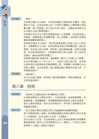 094%u9644%u9304130%u7b2c38%u689d %u3000%uff08%u7f70%u5247%uff09%u6295%u4fdd%u55ae%u4f4d%u9055%u53cd%u672c%u6cd5%u898f%u5b9a%uff0c%u672a%u70ba%u5176%u6240%u5c6c%u52de%u5de5%u8fa6%u7406%u6295%u4fdd%u624b%u7e8c%u8005%uff0c%u6309%u81ea%u50f1%u7528%u4e4b%u65e5%u8d77%uff0c%u81f3%u53c3%u52a0%u4fdd%u96aa%u4e4b%u524d%u4e00%u65e5%u6216%u52de%u5de5%u96e2%u8077%u65e5%u6b62%u61c9%u8ca0%u64d4%u4e4b%u4fdd%u96aa%u8cbb%u91d1%u984d%uff0c%u8655%u5341%u500d%u7f70%u9370%u3002%u52de%u5de5%u56e0%u6b64%u6240%u53d7%u4e4b%u640d%u5931%uff0c%u4e26%u61c9%u7531%u6295%u4fdd%u55ae%u4f4d%u4f9d%u672c%u6cd5%u898f%u5b9a%u4e4b%u7d66%u4ed8%u6a19%u6e96%u8ce0%u511f%u4e4b%u3002%u6295%u4fdd%u55ae%u4f4d%u672a%u4f9d%u672c%u6cd5%u4e4b%u898f%u5b9a%u8ca0%u64d4%u88ab%u4fdd%u96aa%u4eba%u4e4b%u4fdd%u96aa%u8cbb%uff0c%u800c%u7531%u88ab%u4fdd%u96aa%u4eba%u8ca0%u64d4%u8005%uff0c%u6309%u61c9%u8ca0%u64d4%u4e4b%u4fdd%u96aa%u8cbb%u91d1%u984d%uff0c%u8655%u4e8c%u500d%u7f70%u9370%u3002%u6295%u4fdd%u55ae%u4f4d%u4e26%u61c9%u9000%u9084%u8a72%u4fdd%u96aa%u8cbb%u8207%u88ab%u4fdd%u96aa%u4eba%u3002%u6295%u4fdd%u55ae%u4f4d%u9055%u53cd%u672c%u6cd5%u898f%u5b9a%uff0c%u5c07%u6295%u4fdd%u85aa%u8cc7%u91d1%u984d%u4ee5%u591a%u5831%u5c11%u6216%u4ee5%u5c11%u5831%u591a%u8005%uff0c%u81ea%u4e8b%u5be6%u767c%u751f%u4e4b%u65e5%u8d77%uff0c%u6309%u5176%u77ed%u5831%u6216%u591a%u5831%u4e4b%u4fdd%u96aa%u8cbb%u91d1%u984d%uff0c%u8655%u56db%u500d%u7f70%u9370%uff0c%u5176%u6ea2%u9818%u4e4b%u7d66%u4ed8%u91d1%u984d%uff0c%u7d93%u4fdd%u96aa%u4eba%u901a%u77e5%u9650%u671f%u8fd4%u9084%uff0c%u5c46%u671f%u672a%u8fd4%u9084%u8005%uff0c%u4f9d%u6cd5%u79fb%u9001%u5f37%u5236%u57f7%u884c%uff0c%u4e26%u8ffd%u7e73%u5176%u6ea2%u9818%u4e4b%u7d66%u4ed8%u91d1%u984d%u3002%u52de%u5de5%u56e0%u6b64%u6240%u53d7%u640d%u5931%uff0c%u61c9%u7531%u6295%u4fdd%u55ae%u4f4d%u8ce0%u511f%u4e4b%u3002%u6295%u4fdd%u55ae%u4f4d%u9055%u53cd%u7b2c%u4e03%u689d%u898f%u5b9a%u8005%uff0c%u8655%u65b0%u81fa%u5e63%u4e00%u842c%u5143%u4ee5%u4e0a%u4e94%u842c%u5143%u4ee5%u4e0b%u7f70%u9370%u3002%u672c%u6cd5%u4e2d%u83ef%u6c11%u570b%u4e5d%u5341%u516b%u5e74%u4e09%u6708%u4e09%u5341%u4e00%u65e5%u4fee%u6b63%u4e4b%u689d%u6587%u65bd%u884c%u524d%uff0c%u6295%u4fdd%u55ae%u4f4d%u7d93%u4f9d%u898f%u5b9a%u52a0%u5fb5%u6eef%u7d0d%u91d1%u81f3%u61c9%u7d0d%u8cbb%u984d%u4e0a%u9650%uff0c%u5176%u61c9%u7e73%u4e4b%u4fdd%u96aa%u8cbb%u4ecd%u672a%u5411%u4fdd%u96aa%u4eba%u7e73%u7d0d%uff0c%u4e14%u672a%u7d93%u4fdd%u96aa%u4eba%u8655%u4ee5%u7f70%u9370%u6216%u8655%u4ee5%u7f70%u9370%u800c%u672a%u57f7%u884c%u8005%uff0c%u4e0d%u518d%u88c1%u8655%u6216%u57f7%u884c%u3002%u7b2c39%u689d %u3000%uff08%u5f37%u5236%u57f7%u884c%uff09%u4f9d%u672c%u6cd5%u6240%u8655%u4e4b%u7f70%u9370%uff0c%u7d93%u4fdd%u96aa%u4eba%u901a%u77e5%u9650%u671f%u7e73%u7d0d%uff0c%u5c46%u671f%u672a%u7e73%u7d0d%u8005%uff0c%u4f9d%u6cd5%u79fb%u9001%u5f37%u5236%u57f7%u884c%u3002%u7b2c%u516b%u7ae0 - %u9644%u5247%u7b2c40%u689d %u3000%uff08%u4fdd%u96aa%u6548%u529b%u4e4b%u958b%u59cb%u6216%u505c%u6b62%u7b49%u76f8%u95dc%u898f%u5b9a%u4e4b%u6e96%u7528%uff09%u672c%u4fdd%u96aa%u4fdd%u96aa%u6548%u529b%u4e4b%u958b%u59cb%u53ca%u505c%u6b62%u3001%u6708%u6295%u4fdd%u85aa%u8cc7%u3001%u6295%u4fdd%u85aa%u8cc7%u8abf%u6574%u3001%u4fdd%u96aa%u8cbb%u8ca0%u64d4%u3001%u4fdd%u96aa%u8cbb%u7e73%u7d0d%u3001%u4fdd%u96aa%u8cbb%u5bec%u9650%u671f%u8207%u6eef%u7d0d%u91d1%u4e4b%u5fb5%u6536%u53ca%u8655%u7406%u3001%u57fa%u91d1%u4e4b%u904b%u7528%u8207%u7ba1%u7406%uff0c%u9664%u672c%u6cd5%u53e6%u6709%u898f%u5b9a%u5916%uff0c%u6e96%u7528%u52de%u5de5%u4fdd%u96aa%u689d%u4f8b%u53ca%u5176%u76f8%u95dc%u898f%u5b9a%u8fa6%u7406%u3002%u7b2c41%u689d %u3000%uff08%u52de%u5de5%u4fdd%u96aa%u5931%u696d%u7d66%u4ed8%u696d%u52d9%u4e4b%u505c%u6b62%u53ca%u666e%u901a%u4e8b%u6545%u4fdd%u96aa%u8cbb%u7387%u8abf%u6574%uff09%u52de%u5de5%u4fdd%u96aa%u689d%u4f8b%u7b2c%u4e8c%u689d%u7b2c%u4e00%u6b3e%u6709%u95dc%u666e%u901a%u4e8b%u6545%u4fdd%u96aa%u5931%u696d%u7d66%u4ed8%u90e8%u5206%u53ca%u7b2c%u4e03%u5341%u56db%u689d%u898f%u5b9a%uff0c%u81ea%u672c%u6cd5%u65bd%u884c%u4e4b%u65e5%u8d77%uff0c%u4e0d%u518d%u9069%u7528%u3002%u81ea%u672c%u6cd5%u65bd%u884c%u4e4b%u65e5%u8d77%uff0c%u672c%u6cd5%u88ab%u4fdd%u96aa%u4eba%u4e4b%u52de%u5de5%u4fdd%u96aa%u666e%u901a%u4e8b%u6545%u4fdd%u96aa%u8cbb%u7387%u61c9%u6309%u88ab%u4fdd%u96aa%u4eba%u7576%u6708%u4e4b%u6708%u6295%u4fdd%u85aa%u8cc7%u767e%u5206%u4e4b%u4e00%u8abf%u964d%u4e4b%uff0c%u4e0d%u53d7%u52de%u5de5%u4fdd%u96aa%u689d%u4f8b%u7b2c%u5341%u4e09%u689d%u7b2c%u4e8c%u9805%u898f%u5b9a%u4e4b%u9650%u5236%u3002095%u7b2c42%u689d %u3000%uff08%u514d%u7a05%uff09%u9644%u9304 %u3000%u672c%u4fdd%u96aa%u4e4b%u4e00%u5207%u5e33%u518a%u3001%u55ae%u64da%u53ca%u696d%u52d9%u6536%u652f%uff0c%u5747%u514d%u8ab2%u7a05%u6350%u3002%u7b2c43%u689d %u3000%uff08%u65bd%u884c%u7d30%u5247%uff09%u3000%u672c%u6cd5%u65bd%u884c%u7d30%u5247%uff0c%u7531%u4e2d%u592e%u4e3b%u7ba1%u6a5f%u95dc%u5b9a%u4e4b%u3002%u7b2c44%u689d %u3000%u672c%u6cd5%u4e4b%u65bd%u884c%u65e5%u671f%uff0c%u7531%u884c%u653f%u9662%u5b9a%u4e4b%u3002%u672c%u6cd5%u4e2d%u83ef%u6c11%u570b%u4e5d%u5341%u516b%u5e74%u56db%u6708%u4e8c%u5341%u4e00%u65e5%u4fee%u6b63%u4e4b%u7b2c%u4e09%u5341%u4e94%u689d%u689d%u6587%uff0c%u81ea%u4e2d%u83ef%u6c11%u570b%u4e5d%u5341%u4e5d%u5e74%u4e00%u6708%u4e00%u65e5%u65bd%u884c%u3002%u672c%u6cd5%u4e2d%u83ef%u6c11%u570b%u4e00%u767e%u96f6%u4e00%u5e74%u5341%u4e8c%u6708%u56db%u65e5%u4fee%u6b63%u4e4b%u689d%u6587%uff0c%u81ea%u516c%u5e03%u65e5%u65bd%u884c%u3002106