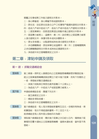 %u9304%u9644 %u5c31%u696d%u4fc3%u9032%u6d25%u8cbc%u5be6%u65bd%u8fa6%u6cd5%u7b2c%u4e00%u7ae0 - %u7e3d%u5247%u7b2c1%u689d %u672c%u8fa6%u6cd5%u4f9d%u5c31%u696d%u670d%u52d9%u6cd5%uff08%u4ee5%u4e0b%u7c21%u7a31%u672c%u6cd5%uff09%u7b2c%u4e8c%u5341%u4e09%u689d%u7b2c%u4e8c%u9805%u53ca%u7b2c%u4e8c%u5341%u56db%u689d%u7b2c%u56db%u9805%u898f%u5b9a%u8a02%u5b9a%u4e4b%u3002%u7b2c2%u689d %u672c%u8fa6%u6cd5%u4e4b%u9069%u7528%u5c0d%u8c61%u5982%u4e0b%uff1a%u4e00%u3001%u975e%u81ea%u9858%u96e2%u8077%u8005%u3002%u4e8c%u3001%u672c%u6cd5%u7b2c%u4e8c%u5341%u56db%u689d%u7b2c%u4e00%u9805%u5404%u6b3e%u6240%u5217%u4e4b%u5931%u696d%u8005%u3002%u524d%u9805%u6240%u5b9a%u4eba%u54e1%u9808%u5177%u6709%u5de5%u4f5c%u80fd%u529b%u53ca%u5de5%u4f5c%u610f%u9858%u3002%u7b2c3%u689d %u524d%u689d%u7b2c%u4e00%u9805%u6240%u5b9a%u4eba%u54e1%u6709%u4e0b%u5217%u60c5%u4e8b%u4e4b%u4e00%u8005%uff0c%u4e0d%u9069%u7528%u672c%u8fa6%u6cd5%uff1a%u4e00%u3001%u5df2%u9818%u53d6%u516c%u6559%u4eba%u54e1%u4fdd%u96aa%u990a%u8001%u7d66%u4ed8%u6216%u52de%u5de5%u4fdd%u96aa%u8001%u5e74%u7d66%u4ed8%u3002%u4e8c%u3001%u5df2%u9818%u53d6%u8ecd%u4eba%u9000%u4f11%u4ff8%u6216%u516c%u71df%u4e8b%u696d%u9000%u4f11%u91d1%u3002%u524d%u9805%u4eba%u54e1%u7b26%u5408%u793e%u6703%u6551%u52a9%u6cd5%u4f4e%u6536%u5165%u6236%u6216%u4e2d%u4f4e%u6536%u5165%u6236%u8cc7%u683c%u3001%u9818%u53d6%u4e2d%u4f4e%u6536%u5165%u8001%u4eba%u751f%u6d3b%u6d25%u8cbc%u6216%u8eab%u5fc3%u969c%u7919%u8005%u751f%u6d3b%u88dc%u52a9%u8cbb%u8005%uff0c%u5f97%u9069%u7528%u672c%u8fa6%u6cd5%u3002%u7b2c4%u689d %u4e2d%u592e%u4e3b%u7ba1%u6a5f%u95dc%u5f97%u8996%u570b%u5167%u7d93%u6fdf%u767c%u5c55%u3001%u570b%u6c11%u5931%u696d%u53ca%u7d93%u8cbb%u904b%u7528%u7b49%u60c5%u5f62%uff0c%u767c%u7d66%u4e0b%u5217%u5c31%u696d%u4fc3%u9032%u6d25%u8cbc%uff1a%u4e00%u3001%u6c42%u8077%u4ea4%u901a%u88dc%u52a9%u91d1%u3002%u4e8c%u3001%u81e8%u6642%u5de5%u4f5c%u6d25%u8cbc%u3002%u4e09%u3001%u8077%u696d%u8a13%u7df4%u751f%u6d3b%u6d25%u8cbc%u3002%u524d%u9805%u6d25%u8cbc%u767c%u7d66%u696d%u52d9%uff0c%u5f97%u59d4%u4efb%u3001%u59d4%u8a17%u516c%u7acb%u5c31%u696d%u670d%u52d9%u6a5f%u69cb%u6216%u8077%u696d%u8a13%u7df4%u55ae%u4f4d%u8fa6%u7406%u3002%u7b2c%u4e00%u9805%u6d25%u8cbc%u4e4b%u505c%u6b62%u767c%u7d66%uff0c%u61c9%u7531%u4e2d%u592e%u4e3b%u7ba1%u6a5f%u95dc%u516c%u544a%u4e4b%u3002%u7b2c5%u689d %u7b2c%u4e8c%u689d%u7b2c%u4e00%u9805%u6240%u5b9a%u4eba%u54e1%uff0c%u9818%u53d6%u524d%u689d%u7b2c%u4e00%u9805%u7b2c%u4e00%u6b3e%u81f3%u7b2c%u4e09%u6b3e%u6d25%u8cbc%u8005%uff0c%u9664%u6aa2%u5177%u570b%u6c11%u8eab%u5206%u8b49%u6b63%u53cd%u9762%u5f71%u672c%u53ca%u540c%u610f%u4ee3%u70ba%u67e5%u8a62%u52de%u5de5%u4fdd%u96aa%u8cc7%u6599%u59d4%u8a17%u66f8%u5916%uff0c%u4e26%u61c9%u9644%u4e0b%u5217%u6587%u4ef6%uff1a%u4e00%u3001%u7368%u529b%u8ca0%u64d4%u5bb6%u8a08%u8005%uff1a%u672c%u4eba%u53ca%u53d7%u6276%u990a%u89aa%u5c6c%u6236%u53e3%u540d%u7c3f%u7b49%u6236%u7c4d%u8cc7%u6599%u8b49%u660e%u6587%u4ef6%u5f71%u672c%uff1b%u5176%u53d7%u64ab%u990a%u89aa%u5c6c%u70ba%u5e74%u6eff%u5341%u4e94%u6b72%u81f3%u516d%u5341%u4e94%u6b72%u8005%uff0c%u53e6%u6aa2%u5177%u8a72%u7b49(%u6c11%u570b111%u5e7404%u670829%u65e5%u4fee%u6b63)099%u9304%u9644%u7b2c%u4e8c%u7ae0 - %u6d25%u8cbc%u7533%u8acb%u53ca%u9818%u53d6%u89aa%u5c6c%u4e4b%u5728%u5b78%u6216%u7121%u5de5%u4f5c%u80fd%u529b%u8b49%u660e%u6587%u4ef6%u5f71%u672c%u3002%u4e8c%u3001%u8eab%u5fc3%u969c%u7919%u8005%uff1a%u8eab%u5fc3%u969c%u7919%u624b%u518a%u6216%u8b49%u660e%u5f71%u672c%u3002%u4e09%u3001%u539f%u4f4f%u6c11%uff1a%u8a3b%u8a18%u539f%u4f4f%u6c11%u8eab%u5206%u4e4b%u6236%u53e3%u540d%u7c3f%u7b49%u6236%u7c4d%u8cc7%u6599%u8b49%u660e%u6587%u4ef6%u5f71%u672c%u3002%u56db%u3001%u4f4e%u6536%u5165%u6236%u6216%u4e2d%u4f4e%u6536%u5165%u6236%uff1a%u4f4e%u6536%u5165%u6236%u6216%u4e2d%u4f4e%u6536%u5165%u6236%u8b49%u660e%u6587%u4ef6%u5f71%u672c%u3002%u4e94%u3001%u4e8c%u5ea6%u5c31%u696d%u5a66%u5973%uff1a%u56e0%u5bb6%u5ead%u56e0%u7d20%u9000%u51fa%u52de%u52d5%u5e02%u5834%u4e4b%u8b49%u660e%u6587%u4ef6%u5f71%u672c%u3002%u516d%u3001%u5bb6%u5ead%u66b4%u529b%u88ab%u5bb3%u4eba%uff1a%u76f4%u8f44%u5e02%u3001%u7e23%uff08%u5e02%uff09%u653f%u5e9c%u958b%u7acb%u4e4b%u5bb6%u5ead%u66b4%u529b%u88ab%u5bb3%u4eba%u8eab%u5206%u8b49%u660e%u6587%u4ef6%u3001%u4fdd%u8b77%u4ee4%u5f71%u672c%u6216%u5224%u6c7a%u66f8%u5f71%u672c%u3002%u4e03%u3001%u66f4%u751f%u53d7%u4fdd%u8b77%u4eba%uff1a%u51fa%u76e3%u8b49%u660e%u6216%u5176%u4ed6%u8eab%u5206%u8b49%u660e%u6587%u4ef6%u5f71%u672c%u3002%u516b%u3001%u975e%u81ea%u9858%u96e2%u8077%u8005%uff1a%u539f%u6295%u4fdd%u55ae%u4f4d%u6216%u76f4%u8f44%u5e02%u3001%u7e23%uff08%u5e02%uff09%u4e3b%u7ba1%u6a5f%u95dc%u958b%u5177%u4e4b%u975e%u81ea%u9858%u96e2%u8077%u8b49%u660e%u6587%u4ef6%u5f71%u672c%u6216%u5176%u4ed6%u8db3%u8cc7%u8b49%u660e%u6587%u4ef6%u3002%u4e5d%u3001%u5176%u4ed6%u7d93%u4e2d%u592e%u4e3b%u7ba1%u6a5f%u95dc%u898f%u5b9a%u4e4b%u6587%u4ef6%u3002%u7b2c%u4e00 %u7bc0 | %u6c42%u8077%u4ea4%u901a%u88dc%u52a9%u91d1%u7b2c6%u689d %u7b2c%u4e8c%u689d%u7b2c%u4e00%u9805%u6240%u5b9a%u4eba%u54e1%u89aa%u81ea%u5411%u516c%u7acb%u5c31%u696d%u670d%u52d9%u6a5f%u69cb%u8fa6%u7406%u6c42%u8077%u767b%u8a18%u5f8c%uff0c%u7d93%u516c%u7acb%u5c31%u696d%u670d%u52d9%u6a5f%u69cb%u8aee%u8a62%u4e26%u958b%u7acb%u4ecb%u7d39%u5361%u63a8%u4ecb%u5c31%u696d%uff0c%u800c%u6709%u4e0b%u5217%u60c5%u5f62%u4e4b%u4e00%u8005%uff0c%u5f97%u767c%u7d66%u6c42%u8077%u4ea4%u901a%u88dc%u52a9%u91d1%uff1a%u4e00%u3001%u5176%u63a8%u4ecb%u5730%u9ede%u8207%u65e5%u5e38%u5c45%u4f4f%u8655%u6240%u8ddd%u96e2%u4e09%u5341%u516c%u91cc%u4ee5%u4e0a%u3002%u4e8c%u3001%u70ba%u4f4e%u6536%u5165%u6236%u3001%u4e2d%u4f4e%u6536%u5165%u6236%u6216%u5bb6%u5ead%u66b4%u529b%u88ab%u5bb3%u4eba%u3002%u7b2c7%u689d %u7533%u8acb%u524d%u689d%u88dc%u52a9%u91d1%u8005%uff0c%u61c9%u5099%u4e0b%u5217%u6587%u4ef6%uff1a%u4e00%u3001%u7b2c%u4e94%u689d%u898f%u5b9a%u4e4b%u6587%u4ef6%u3002%u4e8c%u3001%u88dc%u52a9%u91d1%u9818%u53d6%u6536%u64da%u3002%u4e09%u3001%u5176%u4ed6%u7d93%u4e2d%u592e%u4e3b%u7ba1%u6a5f%u95dc%u898f%u5b9a%u4e4b%u6587%u4ef6%u3002%u7b2c8%u689d %u7b2c%u516d%u689d%u88dc%u52a9%u91d1%uff0c%u6bcf%u4eba%u6bcf%u6b21%u5f97%u767c%u7d66%u65b0%u81fa%u5