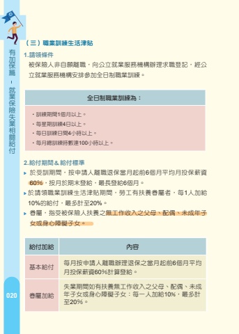 020%u7bc7%u4fdd%u52a0%u6709%u4ed8%u7d66%u95dc%u76f8%u696d%u5931%u96aa%u4fdd%u696d%u5c31%uff08%u4e09%uff09%u8077%u696d%u8a13%u7df4%u751f%u6d3b%u6d25%u8cbc1.%u8acb%u9818%u689d%u4ef6%u88ab%u4fdd%u96aa%u4eba%u975e%u81ea%u9858%u96e2%u8077%uff0c%u5411%u516c%u7acb%u5c31%u696d%u670d%u52d9%u6a5f%u69cb%u8fa6%u7406%u6c42%u8077%u767b%u8a18%uff0c%u7d93%u516c%u7acb%u5c31%u696d%u670d%u52d9%u6a5f%u69cb%u5b89%u6392%u53c3%u52a0%u5168%u65e5%u5236%u8077%u696d%u8a13%u7df4%u3002%u5168%u65e5%u5236%u8077%u696d%u8a13%u7df4%u70ba%uff1a%u2027%u8a13%u7df4%u671f%u95931%u500b%u6708%u4ee5%u4e0a%u3002%u2027%u6bcf%u661f%u671f%u8a13%u7df44%u65e5%u4ee5%u4e0a%u3002%u2027%u6bcf%u65e5%u8a13%u7df4%u65e5%u95934%u5c0f%u6642%u4ee5%u4e0a%u3002%u2027%u6bcf%u6708%u7e3d%u8a13%u7df4%u6642%u6578%u9054100%u5c0f%u6642%u4ee5%u4e0a%u30022.%u7d66%u4ed8%u671f%u9593%uff06%u7d66%u4ed8%u6a19%u6e96 %u65bc%u53d7%u8a13%u671f%u9593%uff0c%u6309%u7533%u8acb%u4eba%u96e2%u8077%u9000%u4fdd%u7576%u6708%u8d77%u524d6%u500b%u6708%u5e73%u5747%u6708%u6295%u4fdd%u85aa%u8cc760%uff05%uff0c%u6309%u6708%u65bc%u671f%u672b%u767c%u7d66%uff0c%u6700%u9577%u767c%u7d666%u500b%u6708%u3002 %u65bc%u8acb%u9818%u8077%u696d%u8a13%u7df4%u751f%u6d3b%u6d25%u8cbc%u671f%u9593%uff0c%u52de%u5de5%u6709%u6276%u990a%u7737%u5c6c%u8005%uff0c%u6bcf1%u4eba%u52a0%u7d6610%%u7684%u7d66%u4ed8%uff0c%u6700%u591a%u8a08%u81f320%%u3002 %u7737%u5c6c%uff0c%u6307%u53d7%u88ab%u4fdd%u96aa%u4eba%u6276%u990a%u4e4b%u7121%u5de5%u4f5c%u6536%u5165%u4e4b%u7236%u6bcd%u3001%u914d%u5076%u3001%u672a%u6210%u5e74%u5b50%u5973%u6216%u8eab%u5fc3%u969c%u7919%u5b50%u5973%u3002%u7d66%u4ed8%u52a0%u7d66 %u5167%u5bb9%u57fa%u672c%u7d66%u4ed8 %u6bcf%u6708%u6309%u7533%u8acb%u4eba%u96e2%u8077%u8fa6%u7406%u9000%u4fdd%u4e4b%u7576%u6708%u8d77%u524d6%u500b%u6708%u5e73%u5747%u6708%u6295%u4fdd%u85aa%u8cc760%uff05%u8a08%u7b97%u767c%u7d66%u3002%u7737%u5c6c%u52a0%u7d66%u5931%u696d%u671f%u9593%u5982%u6709%u6276%u990a%u7121%u5de5%u4f5c%u6536%u5165%u4e4b%u7236%u6bcd%u3001%u914d%u5076%u3001%u672a%u6210%u5e74%u5b50%u5973%u6216%u8eab%u5fc3%u969c%u7919%u5b50%u5973%uff1a%u6bcf%u4e00%u4eba%u52a0%u7d6610%%uff0c%u6700%u591a%u8a08%u81f320%uff05%u3002%u7533%u8acb%u4eba%u7d93%u516c%u7acb%u5c31%u696d%u670d%u52d9%u6a5f%u69cb%u5b89%u6392%u53c3%u52a0%u5168%u65e5%u5236%u8077%u696d%u8a13%u7df4%uff0c%u958b%u8a13%u7576%u65e5%u7531%u8077%u696d%u8a13%u7df4%u55ae%u4f4d%u81f3%u52de%u4fdd%u5c40%u300ce%u5316%u670d%u52d9%u7cfb%u7d71%u300d%u5b8c%u6210%u7dda%u4e0a%u7533%u5831%uff0c%u901a%u77e5%u52de%u4fdd%u5c40%u6838%u767c%u8077%u696d%u8a13%u7df4%u751f%u6d3b%u6d25%u8cbc%u3002%u52de%u4fdd%u5c40%u65bc%u6536%u5230%u8077%u696d%u8a13%u7df4%u55ae%u4f4d%u7dda%u4e0a%u7533%u5831%u8cc7%u6599%u5f8c%uff0c%u6309%u6708%u65bc%u88ab%u4fdd%u96aa%u4eba%u53c3%u8a13%u671f%u6eff1%u500b%u6708%u4e4b%u7fcc%u65e5%u958b%u59cb%u5be9%u6838%uff0c%u7d93%u5be9%u6838%u624b%u7e8c%u5b8c%u5099%u7b26%u5408%u8acb%u9818%u8cc7%u683c%u8005%uff0c%u65bc%u5de5%u4f5c%u671f%u9650%u5167%u767c%u7d66%u6d25%u8cbc%u3002%u65bc%u958b%u8a13%u7576%u65e5%u5b8c%u6210%u5b78%u54e1%u7533%u8acb%u66f8%u78ba%u8a8d%u4e26%u81f3%u52de%u4fdd%u5c40%u300c%uff45%u5316%u670d%u52d9%u7cfb%u7d71%u300d%u7dda%u4e0a%u78ba%u8a8d%u4e26%u7533%u5831%u5b78%u54e1%u5831%u5230%u53c3%u8a13%u8cc7%u6599%uff0c%u53e6%u5c07%u7533%u8acb%u66f8%u51fd%u5bc4%u539f%u63a8%u4ecb%u5c31%u696d%u670d%u52d9%u6a5f%u69cb%u3002%u65bc%u8077%u696d%u8a13%u7df4%u55ae%u4f4d%u7dda%u4e0a%u78ba%u8a8d%u4e26%u7533%u5831%u5b78%u54e1%u5831%u5230%u53c3%u8a13%u8cc7%u6599%u53ca%u7b26%u5408%u5168%u65e5%u5236%u8a13%u7df4%u689d%u4ef6%u5f8c%uff0c%u6309%u6708%u65bc%u88ab%u4fdd%u96aa%u4eba%u53c3%u8a13%u671f%u6eff1%u500b%u6708%u4e4b%u7fcc%u65e5%u8d7710%u500b%u5de5%u4f5c%u5929%u5167%uff0c%u5b8c%u6210%u5b78%u54e1%u7533%u9818%u8077%u696d%u8a13%u7df4%u751f%u6d3b%u6d25%u8cbc%u4e4b%u5be9%u6838%u4f5c%u696d%u3002%u8077%u696d%u8a13%u7df4%u55ae%u4f4d%uff1a