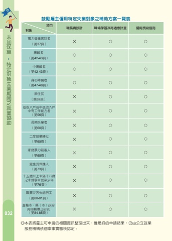 %u7368%u529b%u8ca0%u64d4%u5bb6%u8a08%u8005%u9069%u7528%u5c0d%u8c61%uff0c%u4fc2%u6307%u4e0b%u52173%u985e%u4eba%u54e1%uff1a%uff08%u4e00%uff09%u5177%u4e0b%u5217%u60c5%u5f62%u4e4b%u4e00%uff0c%u4e14%u7368%u81ea%u6276%u990a%u5728%u5b78%u6216%u7121%u5de5%u4f5c%u80fd%u529b%u4e4b%u76f4%u7cfb%u8840%u89aa%u3001%u914d%u5076%u4e4b%u76f4%u7cfb%u8840%u89aa%u6216%u524d%u914d%u5076%u4e4b%u76f4%u7cfb%u8840%u89aa%u8005%u3002%u4e0b%u5217%u60c5%u5f62%u2022%u914d%u5076%u6b7b%u4ea1%u3002%u2022%u914d%u5076%u5931%u8e64%uff0c%u7d93%u5411%u8b66%u5bdf%u6a5f%u95dc%u5831%u6848%u5354%u5c0b%uff0c%u9054%u516d%u500b%u2e9d%u4ee5%u4e0a%u672a%u5c0b%u7372%u3002%u2022%u96e2%u5a5a%u3002%u2022%u53d7%u5bb6%u5ead%u66b4%u529b%uff0c%u5df2%u63d0%u8d77%u96e2%u5a5a%u4e4b%u8a34%u3002%u2022%u914d%u5076%u5165%u7344%u670d%u5211%u3001%u56e0%u6848%u7f88%u62bc%u6216%u4f9d%u6cd5%u62d8%u7981%u3002%u2022%u914d%u5076%u61c9%u5fb5%u96c6%u3001%u53ec%u96c6%u5165%u71df%u670d%u7fa9%u52d9%u5f79%u6216%u66ff%u4ee3%u5f79%u3002%u2022%u914d%u5076%u8eab%u5fc3%u969c%u7919%u6216%u7f79%u60a3%u91cd%u5927%u50b7%u3001%u75c5%u81f4%u4e0d%u80fd%u5de5%u4f5c%u3002%u2022%u5176%u4ed6%u7d93%u516c%u7acb%u5c31%u696d%u670d%u52d9%u6a5f%u69cb%u8a8d%u5b9a%u6216%u7d93%u76f4%u8f44%u5e02%u3001%u7e23(%u5e02)%u653f%u5e9c%u793e%u653f%u55ae%u4f4d%u8f49%u4ecb%u4e4b%u60c5%u6cc1%u7279%u6b8a%u9700%u63d0%u4f9b%u5354%u52a9%u3002%uff08%u4e8c%uff09%u56e0%u672a%u5a5a%u4e14%u5bb6%u5ead%u5167%u7121%u8207%u7533%u8acb%u4eba%u6709%u540c%u5c45%u95dc%u4fc2%u4e4b%u6210%u54e1%uff0c%u800c%u7368%u81ea%u6276%u990a%u5728%u5b78%u6216%u7121%u5de5%u4f5c%u80fd%u529b%u4e4b%u76f4%u7cfb%u8840%u89aa%u5351%u89aa%u5c6c%u8005%u3002%uff08%u4e09%uff09%u56e0%u539f%u8ca0%u6709%u6cd5%u5b9a%u6276%u990a%u7fa9%u52d9%u8005%u6b7b%u4ea1%u3001%u5931%u8e64%u3001%u5a5a%u59fb%u3001%u7d93%u6fdf%u3001%u75be%u75c5%u6216%u6cd5%u5f8b%u56e0%u7d20%uff0c%u81f4%u7121%u6cd5%u5c65%u884c%u8a72%u7fa9%u52d9%uff0c%u800c%u7368%u81ea%u6276%u990a%u5728%u5b78%u6216%u7121%u5de5%u4f5c%u80fd%u529b%u4e4b%u8840%u89aa%u8005%u3002%u672a%u52a0%u4fdd%u7bc7%u7279%u5b9a%u5c0d%u8c61%u5931%u696d%u671f%u9593%u4e4b%u5c31%u696d%u5354%u52a9%u8077%u696d%u707d%u5bb3%u5931%u80fd%u52de%u5de5%u00d7 %u25cb %u25cb%u4e2d%u9ad8%u9f61%u8005%u8eab%u5fc3%u969c%u7919%u8005%u539f%u4f4f%u6c11%u4f4e%u6536%u5165%u6236%u6216%u4e2d%u4f4e%u6536%u5165%u6236%u4e2d%u6709%u5de5%u4f5c%u80fd%u529b%u8005%uff08%u7b2c56%u9801%uff09%u5341%u4e94%u6b72%u4ee5%u4e0a%u672a%u6eff%u5341%u516b%u6b72%u4e4b%u672a%u5c31%u5b78%u672a%u5c31%u696d%u5c11%u5e74%uff08%u7b2c76%u9801%uff09%u9577%u671f%u5931%u696d%u8005%uff08%u7b2c60%u9801%uff09%u4e8c%u5ea6%u5c31%u696d%u5a66%u5973%uff08%u7b2c65%u9801%uff09%u5bb6%u5ead%u66b4%u529b%u88ab%u5bb3%u4eba%uff08%u7b2c69%u9801%uff09%u66f4%u751f%u53d7%u4fdd%u8b77%u4eba%uff08%u7b2c73%u9801%uff09%u25cb%u25cb%u00d7%u00d7%u00d7%u00d7%u00d7%u00d7%u25cb%u25cb%u25cb%u25cb%u25cb%u25cb%u25cb%u25cb%u25cb%u25cb%u25cb%u25cb%u25cb%u25cb%u25cb%u25cb%u00d7 %u25cb %u25cb%u76f4%u8f44%u5e02%u3001%u7e23%uff08%u5e02%uff09%u653f%u5e9c%u5217%u518a%u8f14%u5c0e%u4e4b%u8857%u53cb%uff08%u7b2c84-85%u9801%uff09%u00d7 %u25cb %u25cb%u25ce%u672c%u8868%u5c07%u96c7%u4e3b%u53ef%u7533%u8acb%u7684%u76f8%u95dc%u8cc7%u8a0a%u6574%u7406%u51fa%u4f86%uff0c%u60df%u6700%u7d42%u7684%u7533%u8acb%u7d50%u679c%uff0c%u4ecd%u7531%u516c%u7acb%u5c31%u696d%u670d%u52d9%u6a5f%u69cb%u4f9d%u500b%u6848%u4e8b%u5be6%u5be9%u6838%u8a8d%u5b9a%u3002%u9ad8%u9f61%u8005 %u25cb %u25cb %u25cb %u7bc7%u4fdd%u52a0%u672a%u52a9%u5354%u696d%u5c31%u4e4b%u9593%u671f%u696d%u5931%u8c61%u5c0d%u5b9a%u7279%u9f13%u52f5%u96c7%u4e3b%u50f1%u7528%u7279%u5b9a%u5931%u696d%u5c0d%u8c61%u4e4b%u88dc%u52a9%u65b9%u6848%u4e00%u89bd%u8868 %u9805%u76ee%u3000%u3000%u5c0d%u8c61%u7368%u529b%u8ca0%u64d4%u5bb6%u8a08%u8005%uff08%u7b2c37%u9801%uff09%u8077%u52d9%u518d%u8a2d%u8a08%u00d7%u8077%u5834%u5b78%u7fd2%u53ca%u518d%u9069%u61c9%u8a08%u756b%u25cb%u50f1%u7528%u734e%u52a9%u63aa%u65bd%u25cb%uff08%u7b2c42-43%u9801%uff09%uff08%u7b2c42-43%u9801%uff09%uff08%u7b2c47-48%u9801%uff09%uff08%u7b2c80-81%u9801%uff09%uff08%u7b2c52%u9801%uff09