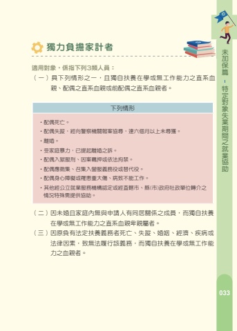 %u7368%u529b%u8ca0%u64d4%u5bb6%u8a08%u8005%u9069%u7528%u5c0d%u8c61%uff0c%u4fc2%u6307%u4e0b%u52173%u985e%u4eba%u54e1%uff1a%uff08%u4e00%uff09%u5177%u4e0b%u5217%u60c5%u5f62%u4e4b%u4e00%uff0c%u4e14%u7368%u81ea%u6276%u990a%u5728%u5b78%u6216%u7121%u5de5%u4f5c%u80fd%u529b%u4e4b%u76f4%u7cfb%u8840%u89aa%u3001%u914d%u5076%u4e4b%u76f4%u7cfb%u8840%u89aa%u6216%u524d%u914d%u5076%u4e4b%u76f4%u7cfb%u8840%u89aa%u8005%u3002%u4e0b%u5217%u60c5%u5f62%u2022%u914d%u5076%u6b7b%u4ea1%u3002%u2022%u914d%u5076%u5931%u8e64%uff0c%u7d93%u5411%u8b66%u5bdf%u6a5f%u95dc%u5831%u6848%u5354%u5c0b%uff0c%u9054%u516d%u500b%u2e9d%u4ee5%u4e0a%u672a%u5c0b%u7372%u3002%u2022%u96e2%u5a5a%u3002%u2022%u53d7%u5bb6%u5ead%u66b4%u529b%uff0c%u5df2%u63d0%u8d77%u96e2%u5a5a%u4e4b%u8a34%u3002%u2022%u914d%u5076%u5165%u7344%u670d%u5211%u3001%u56e0%u6848%u7f88%u62bc%u6216%u4f9d%u6cd5%u62d8%u7981%u3002%u2022%u914d%u5076%u61c9%u5fb5%u96c6%u3001%u53ec%u96c6%u5165%u71df%u670d%u7fa9%u52d9%u5f79%u6216%u66ff%u4ee3%u5f79%u3002%u2022%u914d%u5076%u8eab%u5fc3%u969c%u7919%u6216%u7f79%u60a3%u91cd%u5927%u50b7%u3001%u75c5%u81f4%u4e0d%u80fd%u5de5%u4f5c%u3002%u2022%u5176%u4ed6%u7d93%u516c%u7acb%u5c31%u696d%u670d%u52d9%u6a5f%u69cb%u8a8d%u5b9a%u6216%u7d93%u76f4%u8f44%u5e02%u3001%u7e23(%u5e02)%u653f%u5e9c%u793e%u653f%u55ae%u4f4d%u8f49%u4ecb%u4e4b%u60c5%u6cc1%u7279%u6b8a%u9700%u63d0%u4f9b%u5354%u52a9%u3002%uff08%u4e8c%uff09%u56e0%u672a%u5a5a%u4e14%u5bb6%u5ead%u5167%u7121%u8207%u7533%u8acb%u4eba%u6709%u540c%u5c45%u95dc%u4fc2%u4e4b%u6210%u54e1%uff0c%u800c%u7368%u81ea%u6276%u990a%u5728%u5b78%u6216%u7121%u5de5%u4f5c%u80fd%u529b%u4e4b%u76f4%u7cfb%u8840%u89aa%u5351%u89aa%u5c6c%u8005%u3002%uff08%u4e09%uff09%u56e0%u539f%u8ca0%u6709%u6cd5%u5b9a%u6276%u990a%u7fa9%u52d9%u8005%u6b7b%u4ea1%u3001%u5931%u8e64%u3001%u5a5a%u59fb%u3001%u7d93%u6fdf%u3001%u75be%u75c5%u6216%u6cd5%u5f8b%u56e0%u7d20%uff0c%u81f4%u7121%u6cd5%u5c65%u884c%u8a72%u7fa9%u52d9%uff0c%u800c%u7368%u81ea%u6276%u990a%u5728%u5b78%u6216%u7121%u5de5%u4f5c%u80fd%u529b%u4e4b%u8840%u89aa%u8005%u3002%u672a%u52a0%u4fdd%u7bc7%u7279%u5b9a%u5c0d%u8c61%u5931%u696d%u671f%u9593%u4e4b%u5c31%u696d%u5354%u52a9%u8077%u696d%u707d%u5bb3%u5931%u80fd%u52de%u5de5%u00d7 %u25cb %u25cb%u4e2d%u9ad8%u9f61%u8005%u8eab%u5fc3%u969c%u7919%u8005%u539f%u4f4f%u6c11%u4f4e%u6536%u5165%u6236%u6216%u4e2d%u4f4e%u6536%u5165%u6236%u4e2d%u6709%u5de5%u4f5c%u80fd%u529b%u8005%uff08%u7b2c56%u9801%uff09%u5341%u4e94%u6b72%u4ee5%u4e0a%u672a%u6eff%u5341%u516b%u6b72%u4e4b%u672a%u5c31%u5b78%u672a%u5c31%u696d%u5c11%u5e74%uff08%u7b2c76%u9801%uff09%u9577%u671f%u5931%u696d%u8005%uff08%u7b2c60%u9801%uff09%u4e8c%u5ea6%u5c31%u696d%u5a66%u5973%uff08%u7b2c65%u9801%uff09%u5bb6%u5ead%u66b4%u529b%u88ab%u5bb3%u4eba%uff08%u7b2c69%u9801%uff09%u66f4%u751f%u53d7%u4fdd%u8b77%u4eba%uff08%u7b2c73%u9801%uff09%u25cb%u25cb%u00d7%u00d7%u00d7%u00d7%u00d7%u00d7%u25cb%u25cb%u25cb%u25cb%u25cb%u25cb%u25cb%u25cb%u25cb%u25cb%u25cb%u25cb%u25cb%u25cb%u25cb%u25cb%u00d7 %u25cb %u25cb%u76f4%u8f44%u5e02%u3001%u7e23%uff08%u5e02%uff09%u653f%u5e9c%u5217%u518a%u8f14%u5c0e%u4e4b%u8857%u53cb%uff08%u7b2c84-85%u9801%uff09%u00d7 %u25cb %u25cb%u25ce%u672c%u8868%u5c07%u96c7%u4e3b%u53ef%u7533%u8acb%u7684%u76f8%u95dc%u8cc7%u8a0a%u6574%u7406%u51fa%u4f86%uff0c%u60df%u6700%u7d42%u7684%u7533%u8acb%u7d50%u679c%uff0c%u4ecd%u7531%u516c%u7acb%u5c31%u696d%u670d%u52d9%u6a5f%u69cb%u4f9d%u500b%u6848%u4e8b%u5be6%u5be9%u6838%u8a8d%u5b9a%u3002%u9ad8%u9f61%u8005 %u25cb %u25cb %u25cb %u7bc7%u4fdd%u52a0%u672a%u52a9%u5354%u696d%u5c31%u4e4b%u9593%u671f%u696d%u5931%u8c61%u5c0d%u5b9a%u7279%u9f13%u52f5%u96c7%u4e3b%u50f1%u7528%u7279%u5b9a%u5931%u696d%u5c0d%u8c61%u4e4b%u88dc%u52a9%u65b9%u6848%u4e00%u89bd%u8868 %u9805%u76ee%u3000%u3000%u5c0d%u8c61%u7368%u529b%u8ca0%u64d4%u5bb6%u8a08%u8005%uff08%u7b2c37%u9801%uff09%u8077%u52d9%u518d%u8a2d%u8a08%u00d7%u8077%u5834%u5b78%u7fd2%u53ca%u518d%u9069%u61c9%u8a08%u756b%u25cb%u50f1%u7528%u734e%u52a9%u63aa%u65bd%u25cb%uff08%u7b2c42-43%u9801%uff09%uff08%u7b2c42-43%u9801%uff09%uff08%u7b2c47-48%u9801%uff09%uff08%u7b2c80-81%u9801%uff09%uff08%u7b2c52%u9801%uff09