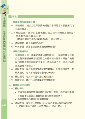 %u7bc7%u4fdd%u52a0%u672a%u52a9%u5354%u696d%u5c31%u4e4b%u9593%u671f%u696d%u5931%u8c61%u5c0d%u5b9a%u7279%u52de%u5de5%u7bc7%u4e00%u3001%u8077%u5834%u5b78%u7fd2%u53ca%u518d%u9069%u61c9%u8a08%u756b%uff08%u4e00%uff09%u88dc%u52a9%u689d%u4ef6%uff1a%u7d93%u516c%u7acb%u5c31%u696d%u670d%u52d9%u6a5f%u69cb%u63a8%u4ecb%u53c3%u8207%u7b26%u5408%u672c%u8a08%u756b%u898f%u5b9a%u4e4b%u5f31%u52e2%u5931%u696d%u8005%u3002%uff08%u4e8c%uff09%u88dc%u52a9%u91d1%u984d%uff1a%u6309%u4e2d%u592e%u4e3b%u7ba1%u6a5f%u95dc%u516c%u544a%u4e4b%u6bcf%u5c0f%u6642%u6700%u4f4e%u5de5%u8cc7%u6838%u7d66%uff0c%u4e14%u4e0d%u8d85%u904e%u6bcf%u6708%u6700%u4f4e%u5de5%u8cc7%u3002(115%u5e74%u5ea6%u6700%u4f4e%u5de5%u8cc7%u70ba%u6708%u85aa29,500%u5143%uff0c%u6642%u85aa196%u5143%u3002)%uff08%u4e09%uff09%u88dc%u52a9%u671f%u9593%uff1a%u6700%u9577%u4ee53%u500b%u6708%u70ba%u9650%u3002%uff08%u56db%uff09%u7533%u8acb%u7ba1%u9053%uff1a%u8acb%u6d3d%u5404%u516c%u7acb%u5c31%u696d%u670d%u52d9%u6a5f%u69cb%u8fa6%u7406%u3002%u4e8c%u3001%u6c42%u8077%u4ea4%u901a%u88dc%u52a9%u91d1%uff08%u4e00%uff09%u88dc%u52a9%u689d%u4ef6%uff1a%u4f9d%u300c%u5c31%u696d%u4fc3%u9032%u6d25%u8cbc%u5be6%u65bd%u8fa6%u6cd5%u300d%uff0c%u88dc%u52a9%u5931%u696d%u52de%u5de5%u7d93%u516c%u7acb%u5c31%u696d%u670d%u52d9%u6a5f%u69cb%u8aee%u8a62%u4e26%u958b%u7acb%u4ecb%u7d39%u5361%u63a8%u4ecb%u5c31%u696d%uff0c%u5176%u63a8%u4ecb%u5730%u9ede%u8207%u65e5%u5e38%u5c45%u4f4f%u8655%u6240%u8ddd%u96e230%u516c%u91cc%u4ee5%u4e0a%u6216%u70ba%u4f4e%u6536%u5165%u6236%u3001%u4e2d%u4f4e%u6536%u5165%u6236%u6216%u5bb6%u5ead%u66b4%u529b%u88ab%u5bb3%u4eba%u3002%uff08%u4e8c%uff09%u88dc%u52a9%u91d1%u984d%uff1a%u6bcf%u4eba%u6bcf%u6b21%u5f97%u767c%u7d66%u65b0%u81fa%u5e63500%u5143%u3002%u4f46%u60c5%u5f62%u7279%u6b8a%u8005%uff0c%u5f97%u3000%u3000%u3000%u6838%u5be6%u767c%u7d66%uff0c%u6bcf%u6b21%u4e0d%u5f97%u8d85%u904e%u65b0%u81fa%u5e631,250%u5143%u3002%uff08%u4e09%uff09%u88dc%u52a9%u671f%u9593%uff1a%u6bcf%u4eba%u6bcf%u5e74%u5ea6%u4ee5%u767c%u7d664%u6b21%u70ba%u9650%u3002%uff08%u56db%uff09%u7533%u8acb%u7ba1%u9053%uff1a%u8acb%u6d3d%u5404%u516c%u7acb%u5c31%u696d%u670d%u52d9%u6a5f%u69cb%u8fa6%u7406%u3002%u4e09%u3001%u8077%u696d%u8a13%u7df4%u751f%u6d3b%u6d25%u8cbc%uff08%u4e00%uff09%u88dc%u52a9%u689d%u4ef6 %u7d93%u516c%u7acb%u5c31%u696d%u670d%u52d9%u6a5f%u69cb%u5c31%u696d%u8aee%u8a62%u4e4b%u63a8%u4ecb%u53c3%u8a13%uff0c%u6216%u7d93%u653f%u5e9c%u6a5f%u95dc%u4e3b%u8fa6%u6216%u59d4%u8a17%u8fa6%u7406%u4e4b%u8077%u696d%u8a13%u7df4%u55ae%u4f4d%u7504%u9078%u9304%u8a13%u8005%u3002 %u53c3%u8a13%u6027%u8cea%u70ba%u5404%u985e%u5168%u65e5%u5236%u8077%u696d%u8a13%u7df4%u3002%uff08%u4e8c%uff09%u88dc%u52a9%u91d1%u984d%uff1a%u6309%u4e2d%u592e%u4e3b%u7ba1%u6a5f%u95dc%u516c%u544a%u4e4b%u6bcf%u6708%u6700%u4f4e%u5de5%u8cc7%u768460%%u767c%u7d66%u3002%u3000%u3000%u3000%uff08115%u5e74%u5ea6%u6700%u4f4e%u5de5%u8cc7%u70ba%u6708%u85aa29,500%u5143%uff0c%u6642%u85aa196%u5143%u3002%uff09%u7bc7%u4fdd%u52a0%u672a%u52a9%u5354%u696d%u5c31%u4e4b%u9593%u671f%u696d%u5931%u8c61%u5c0d%u5b9a%u7279%uff08%u4e09%uff09%u88dc%u52a9%u671f%u9593%uff1a%u5408%u4f75%u5c31%u696d%u4fc3%u9032%u6d25%u8cbc%u5be6%u65bd%u8fa6%u6cd5%u3001%u5c31%u696d%u4fdd%u96aa%u6cd5%uff0c%u65bc2%u5e74%u5167%u9818%u53d6%u8077%u696d%u751f%u6d3b%u6d25%u8cbc%u6216%u540c%u6027%u8cea%u4e4b%u6d25%u8cbc%u6216%u88dc%u52a9%uff0c%u9818%u53d6%u671f%u9593%u4ee56%u500b%u6708%u70ba%u9650%u3002%uff08%u56db%uff09%u7533%u8acb%u7ba1%u9053%uff1a%u8acb%u6d3d%u8a13%u7df4%u55ae%u4f4d%u8fa6%u7406%u3002%u56db%u3001%u81e8%u6642%u5de5%u4f5c%u6d25%u8cbc%uff08%u4e00%uff09%u88dc%u52a9%u689d%u4ef6%uff1a%u7d93%u5c31%u696d%u8aee%u8a62%u4e26%u63a8%u4ecb%u5c31%u696d%u6709%u4e0b%u5217%u60c5%u5f62%u4e4b%u4e00%u8005%uff0c%u516c%u7acb%u5c31%u696d%u670d%u52d9%u6a5f%u69cb%u5f97%u6307%u6d3e%u7533%u8acb%u4eba%u81f3%u653f%u5e9c%u6a5f%u95dc%uff08%u69cb%uff09%u6216%u5408%u6cd5%u7acb%u6848%u4e4b%u975e%u71df%u5229%u5718%u9ad4%u5f9e%u4e8b%u81e8%u6642 %u6027%u5de5%u4f5c%u3002 %u65bc%u6c42%u8077%u767b%u8a18%u65e5%u8d7714%u65e5%u5167%u672a%u80fd%u63a8%u4ecb%u5c31%u696d%u3002 %u6709%u6b63%u7576%u7406%u7531%u7121%u6cd5%u63a5%u53d7%u63a8%u4ecb%u5de5%u4f5c%uff08%u6307%u5de5%u4f5c%u5831%u916c%u672a%u9054%u539f%u6295%u4fdd%u85aa%u8cc760%%uff0c%u6216%u5de5%u4f5c%u5730%u9ede%u8ddd%u96e2%u65e5%u5e38%u5c45%u4f4f%u8655%u624030%u516c%u91cc%u4ee5%u4e0a%u8005%uff09%u3002%uff08%u4e09%uff09%u88dc%u52a9%u671f%u9593%uff1a%u6700%u95776%u500b%u6708%u3002%uff08%u56db%uff09%u7533%u8acb%u7ba1%u9053%uff1a%u8acb%u6d3d%u5404%u516c%u7acb%u5c31%u696d%u670d%u52d9%u6a5f%u69cb%u8fa6%u7406%u3002%uff08%u4e8c%uff09%u88dc%u52a9%u91d1%u984d%uff1a%u6309%u4e2d%u592e%u4e3b%u7ba1%u6a5f%u95dc%u516c%u544a%u4e4b%u6bcf%u5c0f%u6642%u6700%u4f4e%u5de5%u8cc7%u6838%u7d66%uff0c%u4e14%u3000%u3000%u30001%u500b%u6708%u5408%u8a08%u4e0d%u8d85%u904e%u516c%u544a%u4e4b%u6bcf%u6708%u6700%u4f4e%u5de5%u8cc7%u3002%u3000%u3000%u3000%uff08115%u5e74%u5ea6%u6700%u4f4e%u5de5%u8cc7%u70ba%u6708%u85aa29,500%u5143%uff0c%u6642%u85aa196%u5143%u3002%uff09