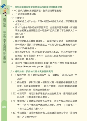 %u7bc7%u4fdd%u52a0%u672a%u52a9%u5354%u696d%u5c31%u4e4b%u9593%u671f%u696d%u5931%u8c61%u5c0d%u5b9a%u7279%u4e94%u3001%u5fae%u578b%u5275%u696d%u9cf3%u51f0%u8cb8%u6b3e%u5229%u606f%u88dc%u8cbc%u53ca%u5275%u696d%u8aee%u8a62%u8f14%u5c0e%u670d%u52d9%uff08%u4e00%uff09%u63d0%u4f9b%u514d%u8cbb%u5275%u696d%u7814%u7fd2%u8ab2%u7a0b%u3001%u5275%u696d%u8aee%u8a62%u8f14%u5c0e%u670d%u52d9%u3002%uff08%u4e8c%uff09%u5fae%u578b%u5275%u696d%u9cf3%u51f0%u8cb8%u6b3e1%u3001%u7533%u8acb%u8cc7%u683c%uff1a2%u3001%u8cb8%u6b3e%u91d1%u984d %u8cb8%u6b3e%u91d1%u984d%u6700%u9ad8%u65b0%u81fa%u5e63 200%u842c%u5143%uff0c%u8fa6%u7406%u7a05%u7c4d%u767b%u8a18%u8005%uff0c%u8cb8%u6b3e%u984d%u5ea6%u6700%u9ad850%u842c%u5143%uff0c%u8cb8%u6b3e%u5229%u7387%u6309%u90f5%u653f%u5132%u91d1 2 %u5e74%u671f%u5b9a%u671f%u5132%u91d1%u6a5f%u52d5%u5229%u7387%u52a0%u5e74%u606f0.575%uff05%u6a5f%u52d5%u8a08%u606f%u3002 %u63d0%u4f9b%u524d3%u5e74%u514d%u606f%uff0c%u7b2c4%u5e74%u8d77%u56fa%u5b9a%u8ca0%u64d4%u5e74%u606f1.5%%uff0c%u5229%u606f%u5dee%u984d%u7531%u52de%u52d5%u90e8%u88dc%u8cbc%uff0c%u4f46%u5e74%u606f%u4f4e%u65bc1.5%%u6642%uff0c%u7531%u8cb8%u6b3e%u4eba%u8ca0%u64d4%u5be6%u969b%u5168%u984d%u5229%u606f%u30023%u3001%u9084%u6b3e%u5e74%u9650%uff1a%u6700%u95777%u5e74%u30024%u3001%u8acb%u6d3d%u514d%u4ed8%u8cbb%u8aee%u8a62%u5c08%u7dda 0800-092-957 %u6216%u4e0a%u5fae%u578b%u5275%u696d%u9cf3%u51f0%u7db2%uff08https://beboss.wda.gov.tw%uff09%u67e5%u8a62%u3002%u516d%u3001%u88dc%u52a9%u6280%u8853%u58eb%u6280%u80fd%u6aa2%u5b9a%u5831%u540d%u8cbb%u53ca%u8b49%u7167%u8cbb%u7528%uff08%u4e00%uff09%u88dc%u52a9%u65b9%u5f0f%uff1a%u6bcf%u4eba%u6700%u591a%u88dc%u52a9 3%u6b21%uff0c%u540c%u4e00%u8077%u985e%u540c%u4e00%u7d1a%u5225%u4ee5%u88dc%u52a9 1%u6b21%u70ba%u9650%u3002%uff08%u4e8c%uff09%u88dc%u52a9%u7a2e%u985e%uff1a%u5b78%u79d1%u6e2c%u8a66%u8cbb%u3001%u8853%u79d1%u6e2c%u8a66%u8cbb%u3001%u5831%u540d%u8cc7%u683c%u5be9%u67e5%u8cbb%u53ca%u8b49%u7167%u8cbb%u3002%u4f46%u6c2c%u6c23%u93a2%u6975%u96fb%u92b2%u3001%u4e00%u822c%u624b%u5de5%u96fb%u92b2%u3001%u534a%u81ea%u52d5%u96fb%u92b2%u7b493%u8077%u985e%u4e4b%u8853%u79d1%u6e2c%u8a66%u8cbb%uff0c%u9650%u88dc%u52a9%u55ae%u4ef6%u8cbb%u7528%u3002%uff08%u4e09%uff09%u7533%u8acb%u671f%u9593%uff1a%u7279%u5b9a%u5c0d%u8c61%u65bc%u5831%u540d%u53c3%u52a0%u6280%u80fd%u6aa2%u5b9a%u6642%uff0c%u61c9%u540c%u6642%u63d0%u51fa%u88dc%u52a9%u7533%u8acb%uff0c%u4e26%u66ab%u514d%u7e73%u4ea4%u5831%u540d%u8cbb%u7528%u3002%uff08%u56db%uff09%u91cd%u9ede%u63d0%u793a%uff1a%u7533%u8acb%u88dc%u52a9%u7d93%u5be9%u67e5%u540c%u610f%u5f8c%uff0c%u672a%u53c3%u52a0%u5b78%u79d1%u6216%u8853%u79d1%u6e2c%u8a66%u8005%uff0c%u4e0d%u5f97%u518d%u7533%u8acb%u8a72%u7f3a%u8003%u8077%u985e%u5c1a%u672a%u88dc%u52a9%u4e4b%u9805%u76ee%uff0c%u4e26%u6263%u6e1b%u7b2c%uff08%u4e00%uff09%u6b3e%u6240%u5b9a%u4e4b%u88dc%u52a9%u6b21%u65781%u6b21%u3002%uff08%u4e94%uff09%u7533%u8acb%u7ba1%u9053%uff1a%u8acb%u6d3d%u52de%u52d5%u90e8%u52de%u52d5%u529b%u767c%u5c55%u7f72%u6280%u80fd%u6aa2%u5b9a%u4e2d%u5fc3%uff0c%u6d3d%u8a62%u5c08 %u7dda%uff1a04-22500708%u3002%u672a%u6eff45%u6b72%u4e4b%u6210%u5e74%u5973%u6027%u3001%u5e74%u6eff45%u6b72%u81f365%u6b72%u8005%u53ca65%u6b72%u4ee5%u4e0b%u8a2d%u7c4d%u96e2%u5cf6%u6210%u5e74%u4eba%u3002%u97003%u5e74%u5167%u66fe%u53c3%u8207%u653f%u5e9c%u5275%u696d%u7814%u7fd2%u8ab2%u7a0b%uff0c%u4e26%u7d93%u5275%u696d%u8aee%u8a62%u8f14%u5c0e%uff0c%u6240%u7d93%u71df%u4e8b%u696d%u4f9d%u76f8%u95dc%u6cd5%u898f%u8fa6%u7406%u767b%u8a18%u672a%u8d85%u904e5%u5e74%u4e14%u54e1%u5de5%u6578%uff08%u4e0d%u542b%u8ca0%u8cac%u4eba%uff09%u672a%u6eff5%u4eba%u8005%u3002%u7bc7%u4fdd%u52a0%u672a%u52a9%u5354%u696d%u5c31%u4e4b%u9593%u671f%u696d%u5931%u8c61%u5c0d%u5b9a%u7279%u4e03%u3001%u591a%u5143%u5c31%u696d%u958b%u767c%u65b9%u6848%uff08%u4e00%uff09%u88dc%u52a9%u689d%u4ef6%uff1a%u7d93%u516c%u7acb%u5c31%u696d%u670d%u52d9%u6a5f%u69cb%u5c31%u696d%u8aee%u8a62%u5b89%u6392%u5f8c%uff0c%u88ab%u63a8%u4ecb%u53c3%u8207%u591a%u5143%u5c31%u696d%u958b%u767c%u65b9%u6848%u8a08%u756b%u7684%u975e%u81ea%u9858%u6027%u5931%u696d%u8005%u3001%u5f31%u52e2%u65cf%u7fa4%u53ca%u5176%u4ed6%u7d93%u672c%u90e8%u6307%u5b9a%u4e4b%u5c0d%u8c61%u70ba%u9650%u3002%uff08%u4e09%uff09%u88dc%u52a9%u671f%u9593%uff1a%u6700%u957712%u500b%u6708%u70ba%u9650%u3002%uff08%u56db%uff09%u7533%u8acb%u7ba1%u9053%uff1a%u8acb%u6d3d%u5404%u516c%u7acb%u5c31%u696d%u670d%u52d9%u6a5f%u69cb%u8fa6%u7406%u3002%u96c7%u4e3b%u7bc7%u4e00%u3001%u8077%u5834%u5b78%u7fd2%u53ca%u518d%u9069%u61c9%u8a08%u756b%u4e8c%u3001%u50f1%u7528%u734e%u52a9%u63aa%u65bd%uff08%u4e09%uff09%u88dc%u52a9%u671f%u9593%uff1a%u6700%u9577%u4ee53%u500b%u6708%u70ba%u9650%u3002%uff08%u56db%uff09%u7533%u8acb%u7ba1%u9053%uff1a%u8acb%u6d3d%u5404%u516c%u7acb%u5c31%u696d%u670d%u52d9%u6a5f%u69cb%u8fa6%u7406%u3002%uff08%u4e8c%uff09%u88dc%u52a9%u91d1%u984d%uff1a %uff08%u4e09%uff09%u88dc%u52a9%u671f%u9593%uff1a%u6700%u9577%u4ee512%u500b%u6708%u70ba%u9650%u3002%uff08%u56db%uff09%u7533%u8acb%u7ba1%u9053%uff1a%u8acb%u6d3d%u5404%u516c%u7acb%u5c31%u696d%u670d%u52d9%u6a5f%u69cb%u8fa6%u7406%u3002%u6309%u6708%u8a08%u916c%u8005%uff1a%u6bcf%u50f1%u75281%u4eba%uff0c%u6bcf%u6708%u6700%u9ad8%u767c%u7d66%u65b0%u81fa%u5e6311,000%u5143%u3002%u4ee5%u5176%u4ed6%u65b9%u5f0f%u7d66%u4ed8%u5de5%u8cc7%u8005%uff1a%u6bcf%u50f1%u75281%u4eba%uff0c%u6bcf%u5c0f%u6642%u767c%u7d66%u65b0%u81fa%u5e6360%u5143%uff0c%u6bcf%u6708%u6700%u9ad8%u767c%u7d66%u65b0%u81fa%u5e6311,000%u5143%u3002%uff08%u4e00%uff09%u88dc%u52a9%u689d%u4ef6%uff1a%u4f9d%u64da%u6240%u9032%u7528%u8077%u5834%u5b78%u7fd2%u53ca%u518d%u9069%u61c9%u4eba%u6578%uff0c%u88dc%u52a9%u884c%u653f%u7ba1%u7406%u53ca%u8f14%u5c0e%u8cbb%u3002%uff08%u4e8c%uff09%u88dc%u52a9%u91d1%u984d%uff1a%u4ee5%u5be6%u969b%u6838%u767c%u8077%u5834%u5b78%u7fd2%u53ca%u518d%u9069%u61c9%u6d25%u8cbc%u91d1%u984d%u4e4b30%%u6838%u7d66%u3002%uff08%u4e8c%uff09%u88dc%u52a9%u91d1%u984d%uff1a%u4f9d%u5de5%u4f5c%u6027%u8cea%u53ca%u5404%u8077%u52d9%u5de5%u4f5c%u9700%u6c42%uff0c%u6309%u4e2d%u592e%u4e3b%u7ba1%u6a5f%u95dc%u3000%u3000%u3000%u516c%u544a%u4e4b%u6bcf%u5c0f%u6642%u6700%u4f4e%u5de5%u8cc7%u6838%u7d66%uff0c%u4e14%u4e0d%u8d85%u