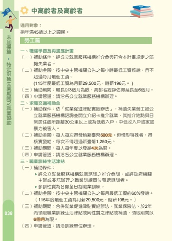 %u7bc7%u4fdd%u52a0%u672a%u52a9%u5354%u696d%u5c31%u4e4b%u9593%u671f%u696d%u5931%u8c61%u5c0d%u5b9a%u7279%u4e2d%u9ad8%u9f61%u8005%u53ca%u9ad8%u9f61%u8005%u9069%u7528%u5c0d%u8c61%uff1a%u6307%u5e74%u6eff45%u6b72%u4ee5%u4e0a%u4e4b%u570b%u6c11%u3002%u52de%u5de5%u7bc7%u4e00%u3001%u8077%u5834%u5b78%u7fd2%u53ca%u518d%u9069%u61c9%u8a08%u756b%uff08%u4e00%uff09%u88dc%u52a9%u689d%u4ef6%uff1a%u7d93%u516c%u7acb%u5c31%u696d%u670d%u52d9%u6a5f%u69cb%u63a8%u4ecb%u53c3%u8207%u7b26%u5408%u672c%u8a08%u756b%u898f%u5b9a%u4e4b%u5f31%u3000%u3000%u3000%u52e2%u5931%u696d%u8005%u3002%uff08%u4e8c%uff09%u88dc%u52a9%u91d1%u984d%uff1a%u6309%u4e2d%u592e%u4e3b%u7ba1%u6a5f%u95dc%u516c%u544a%u4e4b%u6bcf%u5c0f%u6642%u6700%u4f4e%u5de5%u8cc7%u6838%u7d66%uff0c%u4e14%u4e0d%u3000%u3000%u3000%u8d85%u904e%u6bcf%u6708%u6700%u4f4e%u5de5%u8cc7%u3002%u3000%u3000%u3000(115%u5e74%u5ea6%u6700%u4f4e%u5de5%u8cc7%u70ba%u6708%u85aa29,500%u5143%uff0c%u6642%u85aa196%u5143%u3002 )%uff08%u4e09%uff09%u88dc%u52a9%u671f%u9593%uff1a%u6700%u9577%u4ee53%u500b%u6708%u70ba%u9650%uff0c%u9ad8%u9f61%u8005%u7d93%u8a55%u4f30%u5f97%u5ef6%u9577%u81f36%u500b%u6708%u3002%uff08%u56db%uff09%u7533%u8acb%u7ba1%u9053%uff1a%u8acb%u6d3d%u5404%u516c%u7acb%u5c31%u696d%u670d%u52d9%u6a5f%u69cb%u8fa6%u7406%u3002%u4e8c%u3001%u6c42%u8077%u4ea4%u901a%u88dc%u52a9%u91d1 %uff08%u4e00%uff09%u88dc%u52a9%u689d%u4ef6%uff1a%u4f9d%u300c%u5c31%u696d%u4fc3%u9032%u6d25%u8cbc%u5be6%u65bd%u8fa6%u6cd5%u300d%uff0c%u88dc%u52a9%u5931%u696d%u52de%u5de5%u7d93%u516c%u3000%u3000%u3000%u7acb%u5c31%u696d%u670d%u52d9%u6a5f%u69cb%u8aee%u8a62%u4e26%u958b%u7acb%u4ecb%u7d39%u5361%u63a8%u4ecb%u5c31%u696d%uff0c%u5176%u63a8%u4ecb%u5730%u9ede%u8207%u65e5%u3000%u3000%u3000%u5e38%u5c45%u4f4f%u8655%u6240%u8ddd%u96e230%u516c%u91cc%u4ee5%u4e0a%u6216%u70ba%u4f4e%u6536%u5165%u6236%u3001%u4e2d%u4f4e%u6536%u5165%u6236%u6216%u5bb6%u5ead%u3000%u3000%u3000%u66b4%u529b%u88ab%u5bb3%u4eba%u3002%uff08%u4e8c%uff09%u88dc%u52a9%u91d1%u984d%uff1a%u6bcf%u4eba%u6bcf%u6b21%u5f97%u767c%u7d66%u65b0%u81fa%u5e63500%u5143%u3002%u4f46%u60c5%u5f62%u7279%u6b8a%u8005%uff0c%u5f97%u3000%u3000%u3000%u6838%u5be6%u767c%u7d66%uff0c%u6bcf%u6b21%u4e0d%u5f97%u8d85%u904e%u65b0%u81fa%u5e631,250%u5143%u3002%uff08%u4e09%uff09%u88dc%u52a9%u671f%u9593%uff1a%u6bcf%u4eba%u6bcf%u5e74%u5ea6%u4ee5%u767c%u7d664%u6b21%u70ba%u9650%u3002%uff08%u56db%uff09%u7533%u8acb%u7ba1%u9053%uff1a%u8acb%u6d3d%u5404%u516c%u7acb%u5c31%u696d%u670d%u52d9%u6a5f%u69cb%u8fa6%u7406%u3002%u4e09%u3001%u8077%u696d%u8a13%u7df4%u751f%u6d3b%u6d25%u8cbc%uff08%u4e00%uff09%u88dc%u52a9%u689d%u4ef6%uff1a%u3000%u3000%u3000%u3000%u7d93%u516c%u7acb%u5c31%u696d%u670d%u52d9%u6a5f%u69cb%u5c31%u696d%u8aee%u8a62%u4e4b%u63a8%u4ecb%u53c3%u8a13%uff0c%u6216%u7d93%u653f%u5e9c%u6a5f%u95dc%u3000%u3000%u3000%u3000%u4e3b%u8fa6%u6216%u59d4%u8a17%u8fa6%u7406%u4e4b%u8077%u696d%u8a13%u7df4%u55ae%u4f4d%u7504%u9078%u9304%u8a13%u8005%u3002%u3000%u3000%u3000%u3000%u53c3%u8a13%u6027%u8cea%u70ba%u5404%u985e%u5168%u65e5%u5236%u8077%u696d%u8a13%u7df4%u3002%uff08%u4e8c%uff09%u88dc%u52a9%u91d1%u984d%uff1a%u6309%u4e2d%u592e%u4e3b%u7ba1%u6a5f%u95dc%u516c%u544a%u4e4b%u6bcf%u6708%u6700%u4f4e%u5de5%u8cc7%u768460%%u767c%u7d66%u3002%u3000%u3000%u3000%uff08115%u5e74%u5ea6%u6700%u4f4e%u5de5%u8cc7%u70ba%u6708%u85aa29,500%u5143%uff0c%u6642%u85aa196%u5143%u3002%uff09%uff08%u4e09%uff09%u88dc%u52a9%u671f%u9593%uff1a%u5408%u4f75%u5c31%u696d%u4fc3%u9032%u6d25%u8cbc%u5be6%u65bd%u8fa6%u6cd5%u3001%u5c31%u696d%u4fdd%u96aa%u6cd5%u3001%u65bc2%u5e74%u3000%u3000%u3000%u5167%u9818%u53d6%u8077%u696d%u8a13%u7df4%u751f%u6d3b%u6d25%u8cbc%u6216%u540c%u6027%u8cea%u4e4b%u6d25%u8cbc%u6216%u88dc%u52a9%uff0c%u9818%u53d6%u671f%u9593%u4ee5%u3000%u3000%u30006%u500b%u6708%u70ba%u9650%u3002%uff08%u56db%uff09%u7533%u8acb%u7ba1%u9053%uff1a%u8acb%u6d3d%u8a13%u7df4%u55ae%u4f4d%u8fa6%u7406%u3002%u7bc7%u4fdd%u52a0%u672a%u52a9%u5354%u696d%u5c31%u4e4b%u9593%u671f%u696d%u5931%u8c61%u5c0d%u5b9a%u7279%u56db%u3001%u81e8%u6642%u5de5%u4f5c%u6d25%u8cbc%uff08%u4e00%uff09%u88dc%u52a9%u689d%u4ef6%uff1a%u7d93%u5c31%u696d%u8aee%u8a62%u4e26%u63a8%u4ecb%u5c31%u696d%u6709%u4e0b%u5217%u60c5%u5f62%u4e4b%u4e00%u8005%uff0c%u516c%u7acb%u3000%u3000%u3000%u5c31%u696d%u670d%u52d9%u6a5f%u69cb%u5f97%u6307%u6d3e%u7533%u8acb%u4eba%u81f3%u653f%u5e9c%u6a5f%u95dc(%u69cb)%u6216%u5408%u6cd5%u7acb%u6848%u4e4b%u975e%u3000%u3000%u3000%u71df%u5229%u5718%u9ad4%u5f9e%u4e8b%u81e8%u6642%u6027%u5de5%u4f5c%u3002%u3000%u3000%u3000%u3000%u65bc%u6c42%u8077%u767b%u8a18%u65e5%u8d7714%u65e5%u5167%u672a%u80fd%u63a8%u4ecb%u5c31%u696d%u3002%u3000%u3000%u3000%u3000%u6709%u6b63%u7576%u7406%u7531%u7121%u6cd5%u63a5%u53d7%u63a8%u4ecb%u5de5%u4f5c(%u6307%u5de5%u4f5c%u5831%u916c%u672a%u9054%u539f%u6295%u4fdd%u85aa%u3000%u3000%u3000%u3000%u8cc760%%uff0c%u6216%u5de5%u4f5c%u5730%u9ede%u8ddd%u96e2%u65e5%u5e38%u5c45%u4f4f%u8655%u624030%u516c%u91cc%u4ee5%u4e0a%u8005)%u3002%uff08%u4e8c%uff09%u88dc%u52a9%u91d1%u984d%uff1a%u6309%u4e2d%u592e%u4e3b%u7ba1%u6a5f%u95dc%u516c%u544a%u4e4b%u6bcf%u5c0f%u6642%u6700%u4f4e%u5de5%u8cc7%u6838%u7d66%uff0c%u4e14%u3000%u3000%u30001%u500b%u6708%u5408%u8a08%u4e0d%u8d85%u904e%u516c%u544a%u4e4b%u6bcf%u6708%u6700%u4f4e%u5de5%u8cc7%u3002%u3000%u3000%u3000(115%u5e74%u5ea6%u6700%u4f4e%u5de5%u8cc7%u70ba%u6708%u85aa29,500%u5143%uff0c%u6642%u85aa196%u5143%u3002)%uff08%u4e09%uff09%u88dc%u52a9%u671f%u9593%uff1a%u6700%u95776%u500b%u6708%u3002%uff08%u56db%uff09%u7533%u8acb%u7ba1%u9053%uff1a%u8acb%u6d3d%u5404%u516c%u7acb%u5c31%u696d%u670d%u52d9%u6a5f%u69cb%u8fa6%u7406%u3002%u4e94%u3001%u5fae%u578b%u5275%u696d%u9cf3%u51f0%u8cb8%u6b3e%u5229%u606f%u88dc%u8cbc%u53ca%u5275%u696d%u8aee%u8a62%u8f14%u5c0e%u670d%u52d9%uff08%u4e00%uff09%u63d0%u4f9b%u514d%u8cbb%u5275%u696d%u7814%u7fd2%u8ab2%u7a0b%u3001%u5275%u696d%u8aee%u8a62%u8f14%u5c0e%u670d%u52d9%u3002%uff08%u4e8c%uff09%u5fae%u578b%u5275%u696d%u9cf3%u51f0%u8cb8%u6b3e1%u3001%u7533%u8acb%u8cc7%u683c%uff1a%u3000%u3000%u672a%u6eff45%u6b72%u4e4b%u6210%u5e74%u5973%u6027%u3001%u5e74%u6eff45%u6b72%u81f365%u6b72%u8005%u53ca65%u6b72%u4ee5%u4e0b%u8a2d%u7c4d%u96e2%u3000%u3000%u5cf6%u6210%u5e74