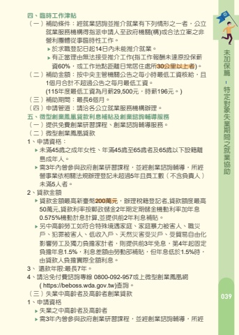 %u7bc7%u4fdd%u52a0%u672a%u52a9%u5354%u696d%u5c31%u4e4b%u9593%u671f%u696d%u5931%u8c61%u5c0d%u5b9a%u7279%u4e2d%u9ad8%u9f61%u8005%u53ca%u9ad8%u9f61%u8005%u9069%u7528%u5c0d%u8c61%uff1a%u6307%u5e74%u6eff45%u6b72%u4ee5%u4e0a%u4e4b%u570b%u6c11%u3002%u52de%u5de5%u7bc7%u4e00%u3001%u8077%u5834%u5b78%u7fd2%u53ca%u518d%u9069%u61c9%u8a08%u756b%uff08%u4e00%uff09%u88dc%u52a9%u689d%u4ef6%uff1a%u7d93%u516c%u7acb%u5c31%u696d%u670d%u52d9%u6a5f%u69cb%u63a8%u4ecb%u53c3%u8207%u7b26%u5408%u672c%u8a08%u756b%u898f%u5b9a%u4e4b%u5f31%u3000%u3000%u3000%u52e2%u5931%u696d%u8005%u3002%uff08%u4e8c%uff09%u88dc%u52a9%u91d1%u984d%uff1a%u6309%u4e2d%u592e%u4e3b%u7ba1%u6a5f%u95dc%u516c%u544a%u4e4b%u6bcf%u5c0f%u6642%u6700%u4f4e%u5de5%u8cc7%u6838%u7d66%uff0c%u4e14%u4e0d%u3000%u3000%u3000%u8d85%u904e%u6bcf%u6708%u6700%u4f4e%u5de5%u8cc7%u3002%u3000%u3000%u3000(115%u5e74%u5ea6%u6700%u4f4e%u5de5%u8cc7%u70ba%u6708%u85aa29,500%u5143%uff0c%u6642%u85aa196%u5143%u3002 )%uff08%u4e09%uff09%u88dc%u52a9%u671f%u9593%uff1a%u6700%u9577%u4ee53%u500b%u6708%u70ba%u9650%uff0c%u9ad8%u9f61%u8005%u7d93%u8a55%u4f30%u5f97%u5ef6%u9577%u81f36%u500b%u6708%u3002%uff08%u56db%uff09%u7533%u8acb%u7ba1%u9053%uff1a%u8acb%u6d3d%u5404%u516c%u7acb%u5c31%u696d%u670d%u52d9%u6a5f%u69cb%u8fa6%u7406%u3002%u4e8c%u3001%u6c42%u8077%u4ea4%u901a%u88dc%u52a9%u91d1 %uff08%u4e00%uff09%u88dc%u52a9%u689d%u4ef6%uff1a%u4f9d%u300c%u5c31%u696d%u4fc3%u9032%u6d25%u8cbc%u5be6%u65bd%u8fa6%u6cd5%u300d%uff0c%u88dc%u52a9%u5931%u696d%u52de%u5de5%u7d93%u516c%u3000%u3000%u3000%u7acb%u5c31%u696d%u670d%u52d9%u6a5f%u69cb%u8aee%u8a62%u4e26%u958b%u7acb%u4ecb%u7d39%u5361%u63a8%u4ecb%u5c31%u696d%uff0c%u5176%u63a8%u4ecb%u5730%u9ede%u8207%u65e5%u3000%u3000%u3000%u5e38%u5c45%u4f4f%u8655%u6240%u8ddd%u96e230%u516c%u91cc%u4ee5%u4e0a%u6216%u70ba%u4f4e%u6536%u5165%u6236%u3001%u4e2d%u4f4e%u6536%u5165%u6236%u6216%u5bb6%u5ead%u3000%u3000%u3000%u66b4%u529b%u88ab%u5bb3%u4eba%u3002%uff08%u4e8c%uff09%u88dc%u52a9%u91d1%u984d%uff1a%u6bcf%u4eba%u6bcf%u6b21%u5f97%u767c%u7d66%u65b0%u81fa%u5e63500%u5143%u3002%u4f46%u60c5%u5f62%u7279%u6b8a%u8005%uff0c%u5f97%u3000%u3000%u3000%u6838%u5be6%u767c%u7d66%uff0c%u6bcf%u6b21%u4e0d%u5f97%u8d85%u904e%u65b0%u81fa%u5e631,250%u5143%u3002%uff08%u4e09%uff09%u88dc%u52a9%u671f%u9593%uff1a%u6bcf%u4eba%u6bcf%u5e74%u5ea6%u4ee5%u767c%u7d664%u6b21%u70ba%u9650%u3002%uff08%u56db%uff09%u7533%u8acb%u7ba1%u9053%uff1a%u8acb%u6d3d%u5404%u516c%u7acb%u5c31%u696d%u670d%u52d9%u6a5f%u69cb%u8fa6%u7406%u3002%u4e09%u3001%u8077%u696d%u8a13%u7df4%u751f%u6d3b%u6d25%u8cbc%uff08%u4e00%uff09%u88dc%u52a9%u689d%u4ef6%uff1a%u3000%u3000%u3000%u3000%u7d93%u516c%u7acb%u5c31%u696d%u670d%u52d9%u6a5f%u69cb%u5c31%u696d%u8aee%u8a62%u4e4b%u63a8%u4ecb%u53c3%u8a13%uff0c%u6216%u7d93%u653f%u5e9c%u6a5f%u95dc%u3000%u3000%u3000%u3000%u4e3b%u8fa6%u6216%u59d4%u8a17%u8fa6%u7406%u4e4b%u8077%u696d%u8a13%u7df4%u55ae%u4f4d%u7504%u9078%u9304%u8a13%u8005%u3002%u3000%u3000%u3000%u3000%u53c3%u8a13%u6027%u8cea%u70ba%u5404%u985e%u5168%u65e5%u5236%u8077%u696d%u8a13%u7df4%u3002%uff08%u4e8c%uff09%u88dc%u52a9%u91d1%u984d%uff1a%u6309%u4e2d%u592e%u4e3b%u7ba1%u6a5f%u95dc%u516c%u544a%u4e4b%u6bcf%u6708%u6700%u4f4e%u5de5%u8cc7%u768460%%u767c%u7d66%u3002%u3000%u3000%u3000%uff08115%u5e74%u5ea6%u6700%u4f4e%u5de5%u8cc7%u70ba%u6708%u85aa29,500%u5143%uff0c%u6642%u85aa196%u5143%u3002%uff09%uff08%u4e09%uff09%u88dc%u52a9%u671f%u9593%uff1a%u5408%u4f75%u5c31%u696d%u4fc3%u9032%u6d25%u8cbc%u5be6%u65bd%u8fa6%u6cd5%u3001%u5c31%u696d%u4fdd%u96aa%u6cd5%u3001%u65bc2%u5e74%u3000%u3000%u3000%u5167%u9818%u53d6%u8077%u696d%u8a13%u7df4%u751f%u6d3b%u6d25%u8cbc%u6216%u540c%u6027%u8cea%u4e4b%u6d25%u8cbc%u6216%u88dc%u52a9%uff0c%u9818%u53d6%u671f%u9593%u4ee5%u3000%u3000%u30006%u500b%u6708%u70ba%u9650%u3002%uff08%u56db%uff09%u7533%u8acb%u7ba1%u9053%uff1a%u8acb%u6d3d%u8a13%u7df4%u55ae%u4f4d%u8fa6%u7406%u3002%u7bc7%u4fdd%u52a0%u672a%u52a9%u5354%u696d%u5c31%u4e4b%u9593%u671f%u696d%u5931%u8c61%u5c0d%u5b9a%u7279%u56db%u3001%u81e8%u6642%u5de5%u4f5c%u6d25%u8cbc%uff08%u4e00%uff09%u88dc%u52a9%u689d%u4ef6%uff1a%u7d93%u5c31%u696d%u8aee%u8a62%u4e26%u63a8%u4ecb%u5c31%u696d%u6709%u4e0b%u5217%u60c5%u5f62%u4e4b%u4e00%u8005%uff0c%u516c%u7acb%u3000%u3000%u3000%u5c31%u696d%u670d%u52d9%u6a5f%u69cb%u5f97%u6307%u6d3e%u7533%u8acb%u4eba%u81f3%u653f%u5e9c%u6a5f%u95dc(%u69cb)%u6216%u5408%u6cd5%u7acb%u6848%u4e4b%u975e%u3000%u3000%u3000%u71df%u5229%u5718%u9ad4%u5f9e%u4e8b%u81e8%u6642%u6027%u5de5%u4f5c%u3002%u3000%u3000%u3000%u3000%u65bc%u6c42%u8077%u767b%u8a18%u65e5%u8d7714%u65e5%u5167%u672a%u80fd%u63a8%u4ecb%u5c31%u696d%u3002%u3000%u3000%u3000%u3000%u6709%u6b63%u7576%u7406%u7531%u7121%u6cd5%u63a5%u53d7%u63a8%u4ecb%u5de5%u4f5c(%u6307%u5de5%u4f5c%u5831%u916c%u672a%u9054%u539f%u6295%u4fdd%u85aa%u3000%u3000%u3000%u3000%u8cc760%%uff0c%u6216%u5de5%u4f5c%u5730%u9ede%u8ddd%u96e2%u65e5%u5e38%u5c45%u4f4f%u8655%u624030%u516c%u91cc%u4ee5%u4e0a%u8005)%u3002%uff08%u4e8c%uff09%u88dc%u52a9%u91d1%u984d%uff1a%u6309%u4e2d%u592e%u4e3b%u7ba1%u6a5f%u95dc%u516c%u544a%u4e4b%u6bcf%u5c0f%u6642%u6700%u4f4e%u5de5%u8cc7%u6838%u7d66%uff0c%u4e14%u3000%u3000%u30001%u500b%u6708%u5408%u8a08%u4e0d%u8d85%u904e%u516c%u544a%u4e4b%u6bcf%u6708%u6700%u4f4e%u5de5%u8cc7%u3002%u3000%u3000%u3000(115%u5e74%u5ea6%u6700%u4f4e%u5de5%u8cc7%u70ba%u6708%u85aa29,500%u5143%uff0c%u6642%u85aa196%u5143%u3002)%uff08%u4e09%uff09%u88dc%u52a9%u671f%u9593%uff1a%u6700%u95776%u500b%u6708%u3002%uff08%u56db%uff09%u7533%u8acb%u7ba1%u9053%uff1a%u8acb%u6d3d%u5404%u516c%u7acb%u5c31%u696d%u670d%u52d9%u6a5f%u69cb%u8fa6%u7406%u3002%u4e94%u3001%u5fae%u578b%u5275%u696d%u9cf3%u51f0%u8cb8%u6b3e%u5229%u606f%u88dc%u8cbc%u53ca%u5275%u696d%u8aee%u8a62%u8f14%u5c0e%u670d%u52d9%uff08%u4e00%uff09%u63d0%u4f9b%u514d%u8cbb%u5275%u696d%u7814%u7fd2%u8ab2%u7a0b%u3001%u5275%u696d%u8aee%u8a62%u8f14%u5c0e%u670d%u52d9%u3002%uff08%u4e8c%uff09%u5fae%u578b%u5275%u696d%u9cf3%u51f0%u8cb8%u6b3e1%u3001%u7533%u8acb%u8cc7%u683c%uff1a%u3000%u3000%u672a%u6eff45%u6b72%u4e4b%u6210%u5e74%u5973%u6027%u3001%u5e74%u6eff45%u6b72%u81f365%u6b72%u8005%u53ca65%u6b72%u4ee5%u4e0b%u8a2d%u7c4d%u96e2%u3000%u3000%u5cf6%u6210%u5e74