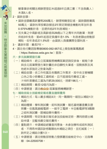 %u7bc7%u4fdd%u52a0%u672a%u52a9%u5354%u696d%u5c31%u4e4b%u9593%u671f%u696d%u5931%u8c61%u5c0d%u5b9a%u7279%u3000%u3000%u71df%u4e8b%u696d%u4f9d%u76f8%u95dc%u6cd5%u898f%u8fa6%u7406%u767b%u8a18%u672a%u8d85%u904e5%u5e74%u4e14%u54e1%u5de5%u6578%uff08%u4e0d%u542b%u8ca0%u8cac%u4eba%uff09%u3000%u3000%u672a%u6eff5%u4eba%u8005%u30022%u3001%u8cb8%u6b3e%u91d1%u984d%uff1a%u3000%u3000%u8cb8%u6b3e%u91d1%u984d%u6700%u9ad8%u65b0%u81fa%u5e63200%u842c%u5143%uff0c%u8fa6%u7406%u7a05%u7c4d%u767b%u8a18%u8005%uff0c%u8cb8%u6b3e%u984d%u5ea6%u6700%u9ad8%u3000%u300050%u842c%u5143%uff0c%u8cb8%u6b3e%u5229%u7387%u6309%u90f5%u653f%u5132%u91d12%u5e74%u671f%u5b9a%u671f%u5132%u91d1%u6a5f%u52d5%u5229%u7387%u52a0%u5e74%u606f%u3000%u3000%u30000.575%%u6a5f%u52d5%u8a08%u606f%uff0c%u4e26%u63d0%u4f9b%u524d2%u5e74%u5229%u606f%u88dc%u8cbc%u3002%u3000%u3000%u53e6%u5931%u696d%u4e4b%u4e2d%u9ad8%u9f61%u8005%u53ca%u9ad8%u9f61%u8005%u820729%u6b72%u4ee5%u4e0b%u4e4b%u9752%u5e74%u5171%u540c%u5275%u696d%uff0c%u5247%u63d0%u3000%u3000%u4f9b%u524d3%u5e74%u514d%u606f%uff0c%u7b2c4%u5e74%u8d77%u56fa%u5b9a%u8ca0%u64d4%u5e74%u606f1.5% %uff0c%u5229%u606f%u5dee%u984d%u7531%u52de%u52d5%u90e8%u3000%u3000%u88dc%u8cbc%uff0c%u4f46%u5e74%u606f%u4f4e%u65bc1.5%%u6642%uff0c%u7531%u8cb8%u6b3e%u4eba%u8ca0%u64d4%u5be6%u969b%u5168%u984d%u5229%u606f%u30023%u3001 %u9084%u6b3e%u5e74%u9650%uff1a%u6700%u95777%u5e74%u30024%u3001%u8acb%u6d3d%u514d%u4ed8%u8cbb%u8aee%u8a62%u5c08%u7dda0800-092-957%u6216%u4e0a%u5fae%u578b%u5275%u696d%u9cf3%u51f0%u7db2%u3000%u3000%uff08https://beboss.wda.gov.tw%uff09%u67e5%u8a62%u3002%u516d%u3001%u591a%u5143%u5c31%u696d%u958b%u767c%u65b9%u6848%uff08%u4e00%uff09%u88dc%u52a9%u689d%u4ef6%uff1a%u7d93%u516c%u7acb%u5c31%u696d%u670d%u52d9%u6a5f%u69cb%u5c31%u696d%u8aee%u8a62%u5b89%u6392%u5f8c%uff0c%u88ab%u63a8%u4ecb%u53c3%u3000%u3000%u3000%u8207%u591a%u5143%u5c31%u696d%u958b%u767c%u65b9%u6848%u8a08%u756b%u7684%u975e%u81ea%u9858%u6027%u5931%u696d%u8005%u3001%u5f31%u52e2%u65cf%u7fa4%u53ca%u5176%u3000%u3000%u3000%u4ed6%u7d93%u672c%u90e8%u6307%u5b9a%u4e4b%u5c0d%u8c61%u70ba%u9650%u3002%uff08%u4e8c%uff09%u88dc%u52a9%u91d1%u984d%uff1a%u4f9d%u5de5%u4f5c%u6027%u8cea%u53ca%u5404%u8077%u52d9%u5de5%u4f5c%u9700%u6c42%uff0c%u6309%u4e2d%u592e%u4e3b%u7ba1%u6a5f%u95dc%u3000%u3000%u3000%u516c%u544a%u4e4b%u6bcf%u5c0f%u6642%u6700%u4f4e%u5de5%u8cc7%u6838%u7d66%uff0c%u4e14%u4e0d%u8d85%u904e%u6bcf%u6708%u6700%u4f4e%u5de5%u8cc7%u3002%u3000%u3000%u3000(115%u5e74%u5ea6%u6700%u4f4e%u5de5%u8cc7%u70ba%u6708%u85aa29,500%u5143%uff0c%u6642%u85aa196%u5143%u3002)%uff08%u4e09%uff09%u88dc%u52a9%u671f%u9593%uff1a%u6700%u957712%u500b%u6708%u70ba%u9650%u3002%uff08%u56db%uff09%u7533%u8acb%u7ba1%u9053%uff1a%u8acb%u6d3d%u5404%u516c%u7acb %u5c31%u696d%u670d%u52d9%u6a5f%u69cb%u8fa6%u7406%u3002%u4e03%u3001%u88dc%u52a9%u6280%u8853%u58eb%u6280%u80fd%u6aa2%u5b9a%u5831%u540d%u8cbb%u53ca%u8b49%u7167%u8cbb%u7528%uff08%u4e00%uff09%u88dc%u52a9%u65b9%u5f0f%uff1a%u6bcf%u4eba%u6700%u591a%u88dc%u52a93%u6b21%uff0c%u540c%u4e00%u8077%u985e%u540c%u4e00%u7d1a%u5225%u4ee5%u88dc%u52a91%u6b21%u3000%u3000%u3000%u70ba%u9650%u3002%uff08%u4e8c%uff09%u88dc%u52a9%u7a2e%u985e%uff1a%u5b78%u79d1%u6e2c%u8a66%u8cbb%u3001%u8853%u79d1%u6e2c%u8a66%u8cbb%u3001%u5831%u540d%u8cc7%u683c%u5be9%u67e5%u8cbb%u53ca%u8b49%u3000%u3000%u3000%u7167%u8cbb%u3002%u4f46%u6c2c%u6c23%u93a2%u6975%u96fb%u92b2%u3001%u4e00%u822c%u624b%u5de5%u96fb%u92b2%u3001%u534a%u81ea%u52d5%u96fb%u92b2%u7b493%u8077%u985e%u3000%u3000%u3000%u4e4b%u8853%u79d1%u6e2c%u8a66%u8cbb%uff0c%u9650%u88dc%u52a9%u55ae%u4ef6%u8cbb%u7528%u3002%uff08%u4e09%uff09%u7533%u8acb%u671f%u9593%uff1a%u7279%u5b9a%u5c0d%u8c61%u65bc%u5831%u540d%u53c3%u52a0%u6280%u80fd%u6aa2%u5b9a%u6642%uff0c%u61c9%u540c%u6642%u63d0%u51fa%u88dc%u3000%u3000%u3000%u52a9%u7533%u8acb%uff0c%u4e26%u66ab%u514d%u7e73%u4ea4%u5831%u540d%u8cbb%u7528%u3002%uff08%u56db%uff09%u91cd%u9ede%u63d0%u793a%uff1a%u7533%u8acb%u88dc%u52a9%u7d93%u5be9%u67e5%u540c%u610f%u5f8c%uff0c%u672a%u53c3%u52a0%u5b78%u79d1%u6216%u8853%u79d1%u6e2c%u8a66%u3000%u3000%u3000%u8005%uff0c%u4e0d%u5f97%u518d%u7533%u8acb%u8a72%u7f3a%u8003%u8077%u985e%u5c1a%u672a%u88dc%u52a9%u4e4b%u9805%u76ee%uff0c%u4e26%u6263%u6e1b%u7b2c%uff08%u4e00%uff09%u3000%u3000%u3000%u6b3e%u6240%u5b9a%u4e4b%u88dc%u52a9%u6b21%u65781%u6b21%u3002%uff08%u4e94%uff09%u7533%u8acb%u7ba1%u9053%uff1a%u8acb%u6d3d%u52de%u52d5%u90e8%u52de%u52d5%u529b%u767c%u5c55%u7f72%u6280%u80fd%u6aa2%u5b9a%u4e2d%u5fc3%uff0c%u6d3d%u8a62%u5c08%u3000%u3000%u3000%u7dda%uff1a04-22500708%u3002%u7bc7%u4fdd%u52a0%u672a%u52a9%u5354%u696d%u5c31%u4e4b%u9593%u671f%u696d%u5931%u8c61%u5c0d%u5b9a%u7279%u516b%u300155Plus%u5c31%u696d%u734e%u52f5 %uff08%u4e00%uff09%u734e%u52f5%u689d%u4ef6%uff1a%u5e74%u6eff55%u6b72%u4ee5%u4e0a%u6216%u5e74%u6eff45%u6b72%u4ee5%u4e0a%u4f9d%u6cd5%u9000%u4f11%u8005%uff0c%u96e2%u958b%u8077%u58343%u500b%u6708%u4ee5%u4e0a%uff0c%u81f3%u516c%u7acb%u5c31%u696d%u670d%u52d9%u6a5f%u69cb%u8fa6%u7406%u6c42%u8077%u767b%u8a18%uff0c%u4e26%u5831%u540d%u53c3%u52a0%uff0c%u7d93%u5c31%u696d%u5a92%u5408%u6210%u529f%u53ca%u7a69%u5b9a%u5c31%u696d%u905490%u65e5%u3002%uff08%u4e8c%uff09%u734e%u52f5%u91d1%u984d%uff1a 1%u3001%u5168%u6642%u5de5%u4f5c%u8005%uff1a%u6bcf%u6b213%u842c%u5143%u3002 2%u3001%u90e8%u5206%u5de5%u6642%u5de5%u4f5c%u4e14%u6bcf%u6708%u85aa%u8cc7%u9054%u6708%u6700%u4f4e%u5de5%u8cc71/2%u4ee5%u4e0a%u8005%uff1a%u6bcf%u6b211%u842c5%u5343%u5143 %u3002%uff08%u4e09%uff09%u734e%u52f5%u6b21%u6578%uff1a%u6700%u591a%u767c%u7d662%u6b21%uff08%u56db%uff09%u7533%u8acb%u7ba1%u9053%uff1a%u8acb%u6d3d%u5404%u516c%u7acb%u5c31%u696d%u670d%u52d9%u6a5f%u69cb%u8fa6%u7406%u3002