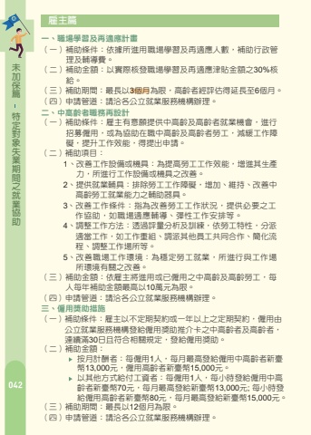 %u7bc7%u4fdd%u52a0%u672a%u52a9%u5354%u696d%u5c31%u4e4b%u9593%u671f%u696d%u5931%u8c61%u5c0d%u5b9a%u7279%u96c7%u4e3b%u7bc7%u4e00%u3001%u8077%u5834%u5b78%u7fd2%u53ca%u518d%u9069%u61c9%u8a08%u756b%u4e09%u3001%u50f1%u7528%u734e%u52a9%u63aa%u65bd%u6309%u6708%u8a08%u916c%u8005%uff1a%u6bcf%u50f1%u75281%u4eba%uff0c%u6bcf%u6708%u6700%u9ad8%u767c%u7d66%u50f1%u7528%u4e2d%u9ad8%u9f61%u8005%u65b0%u81fa%u5e6313,000%u5143%uff0c%u50f1%u7528%u9ad8%u9f61%u8005%u65b0%u81fa%u5e6315,000%u5143%u3002%u4ee5%u5176%u4ed6%u65b9%u5f0f%u7d66%u4ed8%u5de5%u8cc7%u8005%uff1a%u6bcf%u50f1%u75281%u4eba%uff0c%u6bcf%u5c0f%u6642%u767c%u7d66%u50f1%u7528%u4e2d%u9ad8%u9f61%u8005%u65b0%u81fa%u5e6370%u5143%uff0c%u6bcf%u6708%u6700%u9ad8%u767c%u7d66%u65b0%u81fa%u5e6313,000%u5143; %u6bcf%u5c0f%u6642%u767c%u7d66%u50f1%u7528%u9ad8%u9f61%u8005%u65b0%u81fa%u5e6380%u5143%uff0c%u6bcf%u6708%u6700%u9ad8%u767c%u7d66%u65b0%u81fa%u5e6315,000%u5143%u3002%uff08%u4e09%uff09%u88dc%u52a9%u671f%u9593%uff1a%u6700%u9577%u4ee53%u500b%u6708%u70ba%u9650%uff0c%u9ad8%u9f61%u8005%u7d93%u8a55%u4f30%u5f97%u5ef6%u9577%u81f36%u500b%u6708%u3002%uff08%u56db%uff09%u7533%u8acb%u7ba1%uff08%u4e00%uff09%u88dc%u52a9%u689d%u4ef6%uff1a%u96c7%u4e3b%u4ee5%u4e0d%u5b9a%u671f%u5951%u7d04%u6216%u4e00%u5e74%u4ee5%u4e0a%u4e4b%u5b9a%u671f%u5951%u7d04%uff0c%u50f1%u7528%u7531%u516c%u7acb%u5c31%u696d%u670d%u52d9%u6a5f%u69cb%u767c%u7d66%u50f1%u7528%u734e%u52a9%u63a8%u4ecb%u5361%u4e4b%u4e2d%u9ad8%u9f61%u8005%u53ca%u9ad8%u9f61%u8005%uff0c%u9023%u7e8c%u6eff30%u65e5%u4e14%u7b26%u5408%u76f8%u95dc%u898f%u5b9a%uff0c%u767c%u7d66%u50f1%u7528%u734e%u52a9%u3002%uff08%u4e00%uff09%u88dc%u52a9%u689d%u4ef6%uff1a%u4f9d%u64da%u6240%u9032%u7528%u8077%u5834%u5b78%u7fd2%u53ca%u518d%u9069%u61c9%u4eba%u6578%uff0c%u88dc%u52a9%u884c%u653f%u7ba1%u7406%u53ca%u8f14%u5c0e%u8cbb%u3002%uff08%u4e8c%uff09%u88dc%u52a9%u91d1%u984d%uff1a%u4ee5%u5be6%u969b%u6838%u767c%u8077%u5834%u5b78%u7fd2%u53ca%u518d%u9069%u61c9%u6d25%u8cbc%u91d1%u984d%u4e4b30%%u6838%u7d66%u3002%uff08%u4e8c%uff09%u88dc%u52a9%u91d1%u984d%uff1a%uff08%u4e09%uff09%u88dc%u52a9%u671f%u9593%uff1a%u6700%u9577%u4ee512%u500b%u6708%u70ba%u9650%u3002%uff08%u56db%uff09%u7533%u8acb%u7ba1%u9053%uff1a%u8acb%u6d3d%u5404%u516c%u7acb%u5c31%u696d%u670d%u52d9%u6a5f%u69cb%u8fa6%u7406%u3002%u9053%uff1a%u8acb%u6d3d%u5404%u516c%u7acb%u5c31%u696d%u670d%u52d9%u6a5f%u69cb%u8fa6%u7406%u3002%u4e8c%u3001%u4e2d%u9ad8%u9f61%u8005%u8077%u52d9%u518d%u8a2d%u8a08%uff08%u4e00%uff09%u88dc%u52a9%u689d%u4ef6%uff1a%u96c7%u4e3b%u6709%u610f%u9858%u63d0%u4f9b%u4e2d%u9ad8%u9f61%u53ca%u9ad8%u9f61%u8005%u5c31%u696d%u6a5f%u6703%uff0c%u9032%u884c%u62db%u52df%u50f1%u7528%uff0c%u6216%u70ba%u5354%u52a9%u5728%u8077%u4e2d%u9ad8%u9f61%u53ca%u9ad8%u9f61%u8005%u52de%u5de5%uff0c%u6e1b%u7de9%u5de5%u4f5c%u969c%u7919%uff0c%u63d0%u5347%u5de5%u4f5c%u6548%u80fd%uff0c%u5f97%u63d0%u51fa%u7533%u8acb%u3002%uff08%u4e8c%uff09%u88dc%u52a9%u9805%u76ee%uff1a 1%u3001%u6539%u5584%u5de5%u4f5c%u8a2d%u5099%u6216%u6a5f%u5177%uff1a%u70ba%u63d0%u9ad8%u52de%u5de5%u5de5%u4f5c%u6548%u80fd%uff0c%u589e%u9032%u5176%u751f%u7522 %u3000%u529b%uff0c%u6240%u9032%u884c%u5de5%u4f5c%u8a2d%u5099%u6216%u6a5f%u5177%u4e4b%u6539%u5584%u3002 2%u3001%u63d0%u4f9b%u5c31%u696d%u8f14%u5177%uff1a%u6392%u9664%u52de%u5de5%u5de5%u4f5c%u969c%u7919%uff0c%u589e%u52a0%u3001%u7dad%u6301%u3001%u6539%u5584%u4e2d %u9ad8%u9f61%u52de%u5de5%u5c31%u696d%u80fd%u529b%u4e4b%u8f14%u52a9%u5668%u5177%u3002 3%u3001%u6539%u5584%u5de5%u4f5c%u689d%u4ef6%uff1a%u6307%u70ba%u6539%u5584%u52de%u5de5%u5de5%u4f5c%u72c0%u6cc1%uff0c%u63d0%u4f9b%u5fc5%u8981%u4e4b%u5de5 %u4f5c%u5354%u52a9%uff0c%u5982%u8077%u5834%u9069%u61c9%u8f14%u5c0e%u3001%u5f48%u6027%u5de5%u4f5c%u5b89%u6392%u7b49%u3002 4%u3001%u8abf%u6574%u5de5%u4f5c%u65b9%u6cd5%uff1a%u900f%u904e%u8a55%u91cf%u5206%u6790%u53ca%u8a13%u7df4%uff0c%u4f9d%u52de%u5de5%u7279%u6027%uff0c%u5206%u6d3e%u3000%u9069%u7576%u5de5%u4f5c%uff0c%u5982%u5de5%u4f5c%u91cd%u7d44%u3001%u8abf%u6d3e%u5176%u4ed6%u54e1%u5de5%u5171%u540c%u5408%u4f5c%u3001%u7c21%u5316%u6d41%u3000%u7a0b%u3001%u8abf%u6574%u5de5%u4f5c%u5834%u6240%u7b49%u3002 5%u3001%u6539%u5584%u8077%u5834%u5de5%u4f5c%u74b0%u5883%uff1a%u70ba%u7a69%u5b9a%u52de%u5de5%u5c31%u696d%uff0c%u6240%u9032%u884c%u8207%u5de5%u4f5c%u5834 %u6240%u74b0%u5883%u6709%u95dc%u4e4b%u6539%u5584%u3002%uff08%u4e09%uff09%u88dc%u52a9%u91d1%u984d%uff1a%u4f9d%u96c7%u4e3b%u5c07%u9032%u7528%u6216%u5df2%u50f1%u7528%u4e4b%u4e2d%u9ad8%u9f61%u53ca%u9ad8%u9f61%u52de%u5de5%uff0c%u6bcf%u4eba%u6bcf%u5e74%u88dc%u52a9%u91d1%u984d%u6700%u9ad8%u4ee510%u842c%u5143%u70ba%u9650%u3002%uff08%u56db%uff09%u7533%u8acb%u7ba1%u9053%uff1a%u8acb%u6d3d%u5404%u516c%u7acb%u5c31%u696d%u670d%u52d9%u6a5f%u69cb%u8fa6%u7406%u3002%u7bc7%u4fdd%u52a0%u672a%u52a9%u5354%u696d%u5c31%u4e4b%u9593%u671f%u696d%u5931%u8c61%u5c0d%u5b9a%u7279%u56db%u3001%u8077%u5834%u652f%u6301%u8f14%u5c0e%u8cbb%uff08%u4e00%uff09%u88dc%u52a9%u689d%u4ef6%uff1a%u5c31%u696d%u4fdd%u96aa%u6295%u4fdd%u55ae%u4f4d%u4e4b%u6c11%u71df%u4e8b%u696d%u55ae%u4f4d%u3001%u5718%u9ad4%u6216%u79c1%u7acb%u5b78%u6821%uff0c%u6aa2%u9644%u8f14%u5c0e%u8a08%u756b%u66f8%u5411%u516c%u7acb%u5c31%u696d%u670d%u52d9%u6a5f%u69cb%u63d0%u51fa%u7533%u8acb%uff0c%u4e26%u9032%u7528%u63a8%u4ecb%u4e4b%u5e74%u6eff55%u6b72%u4ee5%u4e0a%u6216%u5e74%u6eff45%u6b72%u4ee5%u4e0a%u4f9d%u6cd5%u9000%u4f11%u8005%uff0c%u53ca%u63d0%u4f9b%u5c08%u5c6c%u6559%u80b2%u8a13%u7df4%u6a5f%u5236%uff08%u542b%u5c08%u4eba%u8f14%u5c0e%u6216%u6559%u6750%uff09%u3001%u5f48%u6027%u8abf%u6574%u5de5%u6642%u3001%u5bb6%u5ead%u7167%u9867%u5354%u52a9%u6216%u88dc%u52a9%u3001%u5fc3%u7406%u8aee%u8a62%u8207%u95dc%u61f7%u6216%u5176%u4ed6%u4e8b%u9805%u7b49%u53cb%u5584%u5354%u52a9%u65b9%u6848%u3002%uff08%u4e8c%uff09%u88dc%u52a9%u91d1%u984d%uff1a%u50f1%u7528%u63a8%u4ecb%u4e4b%u5e74%u6eff55%u6b72%u4ee5%u4e0a%u6216%u5e74%u6eff45%u6b72%u4ee5%u4e0a%u4f9d%u6cd5%u9000%u4f11%u8005%uff0c%u53ca%u63d0%u4f9b%u53cb%u5584%u5354%u52a9%u65b9%u6848%uff0c%u6bcf%u6eff30%u65e5%uff0c%u88dc%u52a9%u96c7%u4e3b%u8077%u5834%u652f%u6301%u8f14%u5c0e%u8cbb%u6bcf%u4eba3%u5343%u5143%uff0c%u6700%u9ad83%u842c6%u5343%u