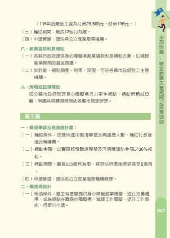 %u7bc7%u4fdd%u52a0%u672a%u52a9%u5354%u696d%u5c31%u4e4b%u9593%u671f%u696d%u5931%u8c61%u5c0d%u5b9a%u7279 %u53e6%u8eab%u5fc3%u969c%u7919%u52de%u5de5%u5982%u7b26%u5408%u7279%u6b8a%u5883%u9047%u5bb6%u5ead%u3001%u5bb6%u5ead%u66b4%u529b%u88ab%u5bb3%u4eba%u3001%u8077%u707d%u6236%u3001%u72af%u7f6a%u88ab%u5bb3%u4eba%u3001%u4f4e%u6536%u5165%u6236%u3001%u5929%u7136%u707d%u5bb3%u53d7%u707d%u6236%u3001%u53d7%u8cbf%u6613%u81ea%u7531%u5316%u5f71%u97ff%u52de%u5de5%u53ca%u7368%u529b%u8ca0%u64d4%u5bb6%u8a08%u8005%uff0c%u5247%u63d0%u4f9b%u524d3%u5e74%u514d%u606f%uff0c%u7b2c 4%u5e74%u8d77%u56fa%u5b9a%u8ca0%u64d4%u5e74%u606f 1.5%%uff0c%u5229%u606f%u5dee%u984d%u7531%u52de%u52d5%u90e8%u88dc%u8cbc%uff0c%u4f46%u5e74%u606f%u4f4e%u65bc1.5%%u6642%uff0c%u7531%u8cb8%u6b3e%u4eba%u8ca0%u64d4%u5be6%u969b%u5168%u984d%u5229%u606f%u30023%u3001%u9084%u6b3e%u5e74%u9650%uff1a%u6700%u95777%u5e74%u30024%u3001%u8acb%u6d3d%u514d%u4ed8%u8cbb%u8aee%u8a62%u5c08%u7dda0800-092-957%u6216%u4e0a%u5fae%u578b%u5275%u696d%u9cf3%u51f0%u7db2%uff08https://beboss.wda.gov.tw%uff09%u67e5%u8a62%u3002%u516d%u3001%u88dc%u52a9%u6280%u8853%u58eb%u6280%u80fd%u6aa2%u5b9a%u5831%u540d%u8cbb%u53ca%u8b49%u7167%u8cbb%u7528%uff08%u4e00%uff09%u88dc%u52a9%u65b9%u5f0f%uff1a%u6bcf%u4eba%u6700%u591a%u88dc%u52a9 3%u6b21%uff0c%u540c%u4e00%u8077%u985e%u540c%u4e00%u7d1a%u5225%u4ee5%u88dc%u52a9 1%u6b21%u70ba%u9650%u3002%uff08%u4e8c%uff09%u88dc%u52a9%u7a2e%u985e%uff1a%u5b78%u79d1%u6e2c%u8a66%u8cbb%u3001%u8853%u79d1%u6e2c%u8a66%u8cbb%u3001%u5831%u540d%u8cc7%u683c%u5be9%u67e5%u8cbb%u53ca%u8b49%u7167%u8cbb%u3002%u4f46%u6c2c%u6c23%u93a2%u6975%u96fb%u92b2%u3001%u4e00%u822c%u624b%u5de5%u96fb%u92b2%u3001%u534a%u81ea%u52d5%u96fb%u92b2%u7b49 3 %u8077%u985e%u4e4b%u8853%u79d1%u6e2c%u8a66%u8cbb%uff0c%u9650%u88dc%u52a9%u55ae%u4ef6%u8cbb%u7528%u3002%u4e03%u3001%u591a%u5143%u5c31%u696d%u958b%u767c%u65b9%u6848%uff08%u4e00%uff09%u88dc%u52a9%u689d%u4ef6%uff1a%u7d93%u516c%u7acb%u5c31%u696d%u670d%u52d9%u6a5f%u69cb%u5c31%u696d%u8aee%u8a62%u5b89%u6392%u5f8c%uff0c%u88ab%u63a8%u4ecb%u53c3%u8207%u591a%u5143%u5c31%u696d%u958b%u767c%u65b9%u6848%u8a08%u756b%u7684%u975e%u81ea%u9858%u6027%u5931%u696d%u8005%u3001%u5f31%u52e2%u65cf%u7fa4%u53ca%u5176%u4ed6%u7d93%u672c%u90e8%u6307%u5b9a%u4e4b%u5c0d%u8c61%u70ba%u9650%u3002%uff08%u4e8c%uff09%u88dc%u52a9%u91d1%u984d%uff1a%u4f9d%u5de5%u4f5c%u6027%u8cea%u53ca%u5404%u8077%u52d9%u5de5%u4f5c%u9700%u6c42%uff0c%u6309%u4e2d%u592e%u4e3b%u7ba1%u6a5f%u95dc%u516c%u544a%u4e4b%u6bcf%u5c0f%u6642%u6700%u4f4e%u5de5%u8cc7%u6838%u7d66%uff0c%u4e14%u4e0d%u8d85%u904e%u6bcf%u6708%u6700%u4f4e%u5de5%u8cc7%u3002%uff08%u4e09%uff09%u7533%u8acb%u671f%u9593%uff1a%u7279%u5b9a%u5c0d%u8c61%u65bc%u5831%u540d%u53c3%u52a0%u6280%u80fd%u6aa2%u5b9a%u6642%uff0c%u61c9%u540c%u6642%u63d0%u51fa%u88dc%u52a9%u7533%u8acb%uff0c%u4e26%u66ab%u514d%u7e73%u4ea4%u5831%u540d%u8cbb%u7528%u3002%uff08%u56db%uff09%u91cd%u9ede%u63d0%u793a%uff1a%u7533%u8acb%u88dc%u52a9%u7d93%u5be9%u67e5%u540c%u610f%u5f8c%uff0c%u672a%u53c3%u52a0%u5b78%u79d1%u6216%u8853%u79d1%u6e2c%u8a66%u8005%uff0c%u4e0d%u5f97%u518d%u7533%u8acb%u8a72%u7f3a%u8003%u8077%u985e%u5c1a%u672a%u88dc%u52a9%u4e4b%u9805%u76ee%uff0c%u4e26%u6263%u6e1b%u7b2c%uff08%u4e00%uff09%u6b3e%u6240%u5b9a%u4e4b%u88dc%u52a9%u6b21%u65781%u6b21%u3002%uff08%u4e94%uff09%u7533%u8acb%u7ba1%u9053%uff1a%u8acb%u6d3d%u52de%u52d5%u90e8%u52de%u52d5%u529b%u767c%u5c55%u7f72%u6280%u80fd%u6aa2%u5b9a%u4e2d%u5fc3%uff0c%u6d3d%u8a62%u5c08%u7dda%uff1a04-22500708%u3002%uff08%u4e00%uff09%u88dc%u52a9%u689d%u4ef6%uff1a%u4f9d%u64da%u6240%u9032%u7528%u8077%u5834%u5b78%u7fd2%u53ca%u518d%u9069%u61c9%u4eba%u6578%uff0c%u88dc%u52a9%u884c%u653f%u7ba1%u7406%u53ca%u8f14%u5c0e%u8cbb%u3002%uff08%u4e8c%uff09%u88dc%u52a9%u91d1%u984d%uff1a%u4ee5%u5be6%u969b%u6838%u767c%u8077%u5834%u5b78%u7fd2%u53ca%u518d%u9069%u61c9%u6d25%u8cbc%u91d1%u984d%u4e4b30%%u6838%u7d66%u3002%uff08%u4e09%uff09%u88dc%u52a9%u671f%u9593%uff1a%u6700%u9577%u4ee53%u500b%u6708%u70ba%u9650%uff0c%u7d93%u8a55%u4f30%u540c%u610f%u5f8c%u5f97%u5ef6%u9577%u81f36%u500b%u6708%u3002%u7bc7%u4fdd%u52a0%u672a%u52a9%u5354%u696d%u5c31%u4e4b%u9593%u671f%u696d%u5931%u8c61%u5c0d%u5b9a%u7279%uff08%u56db%uff09%u7533%u8acb%u7ba1%u9053%uff1a%u8acb%u6d3d%u5404%u516c%u7acb%u5c31%u696d%u670d%u52d9%u6a5f%u69cb%u8fa6%u7406%u3002%u4e8c%u3001%u8077%u52d9%u518d%u8a2d%u8a08%uff08%u4e00%uff09%u88dc%u52a9%u689d%u4ef6%uff1a%u96c7%u4e3b%u6709%u610f%u9858%u63d0%u4f9b%u8eab%u5fc3%u969c%u7919%u5c31%u696d%u6a5f%u6703%uff0c%u9032%u884c%u62db%u52df%u50f1%u7528%uff0c%u6216%u70ba%u5354%u52a9%u5728%u8077%u8eab%u5fc3%u969c%u7919%u8005%uff0c%u6e1b%u7de9%u5de5%u4f5c%u969c%u7919%uff0c%u63d0%u5347%u5de5%u4f5c%u6548%u80fd%uff0c%u5f97%u63d0%u51fa%u7533%u8acb%u3002%u516b%u3001%u5275%u696d%u8cb8%u6b3e%u5229%u606f%u88dc%u8cbc%uff08%u4e00%uff09%u5404%u7e23%u5e02%u653f%u5e9c%u63d0%u4f9b%u8eab%u5fc3%u969c%u7919%u8005%u5275%u696d%u8cb8%u6b3e%u5229%u606f%u88dc%u8cbc%u65b9%u6848%uff0c%u4ee5%u6e1b%u8f15%u5275%u696d%u671f%u9593%u7684%u8cc7%u91d1%u8ca0%u64d4%u3002%uff08%u4e8c%uff09%u5176%u5c0d%u8c61%u3001%u88dc%u8cbc%u984d%u5ea6%u3001%u5229%u7387%u3001%u671f%u9650%uff0c%u53ef%u6d3d%u5404%u7e23%u5e02%u653f%u5e9c%u52de%u5de5%u4e3b%u7ba1%u6a5f%u95dc%u3002%u4e5d%u3001%u623f%u79df%u6216%u8a2d%u5099%u88dc%u52a9%u90e8%u5206%u7e23%u5e02%u653f%u5e9c%u8fa6%u7406%u8eab%u5fc3%u969c%u7919%u8005%u81ea%u529b%u66f4%u751f%u88dc%u52a9%uff0c%u88dc%u52a9%u623f%u79df%u6216%u8a2d%u5099%uff0c%u6709%u54ea%u4e9b%u5177%u9ad4%u9805%u76ee%u5247%u4f9d%u5404%u7e23%u5e02%u898f%u5b9a%u8fa6%u7406%u3002%u96c7%u4e3b%u7bc7%u4e00%u3001%u8077%u5834%u5b78%u7fd2%u53ca%u518d%u9069%u61c9%u8a08%u756b%uff1a%uff08%u4e09%uff09%u88dc%u52a9%u671f%u9593%uff1a%u6700%u957712%u500b%u6708%u70ba%u9650%u3002%uff08%u56db%uff09%u7533%u8acb%u7ba1%u9053%uff1a%u8acb%u6d3d%u5404%u516c%u7acb%u5c31%u696d%u670d%u52d9%u6a5f%u69cb%u3002%uff08115%u5e74%u5ea6%u6700%u4f4e%u5de5%u8cc7%u70ba%u6708%u85aa29,500%u5143%uff0c%u6642%u85aa196%u5143%u3002%uff09