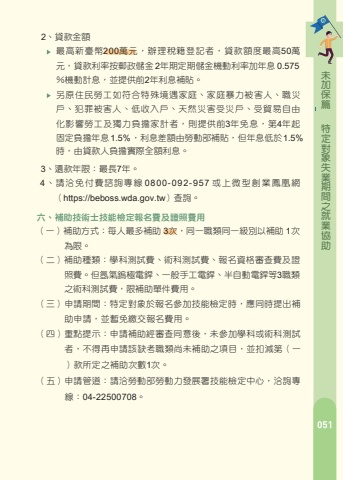 %u7bc7%u4fdd%u52a0%u672a%u52a9%u5354%u696d%u5c31%u4e4b%u9593%u671f%u696d%u5931%u8c61%u5c0d%u5b9a%u7279%u4e09%u3001%u8077%u696d%u8a13%u7df4%u751f%u6d3b%u6d25%u8cbc%uff08%u4e00%uff09%u88dc%u52a9%u689d%u4ef6 %u7d93%u516c%u7acb%u5c31%u696d%u670d%u52d9%u6a5f%u69cb%u5c31%u696d%u8aee%u8a62%u4e4b%u63a8%u4ecb%u53c3%u8a13%uff0c%u6216%u7d93%u653f%u5e9c%u6a5f%u95dc %u4e3b%u8fa6%u6216%u59d4%u8a17%u8fa6%u7406%u4e4b%u8077%u696d%u8a13%u7df4%u55ae%u4f4d%u7504%u9078%u9304%u8a13%u8005%u3002%u53c3%u8a13%u6027%u8cea%u70ba%u5404%u985e%u5168%u65e5%u5236%u8077%u696d%u8a13%u7df4%u3002%uff08%u4e09%uff09%u88dc%u52a9%u671f%u9593%uff1a%u5408%u4f75%u5c31%u696d%u4fc3%u9032%u6d25%u8cbc%u5be6%u65bd%u8fa6%u6cd5%u3001%u5c31%u696d%u4fdd%u96aa%u6cd5%uff0c%u65bc 2 %u5e74%u5167%u9818%u53d6%u8077%u696d%u751f%u6d3b%u6d25%u8cbc%u6216%u540c%u6027%u8cea%u4e4b%u6d25%u8cbc%u6216%u88dc%u52a9%uff0c%u9818%u53d6%u671f%u9593%u4ee56%u500b%u6708%u70ba%u9650%u3002%uff08%u56db%uff09%u7533%u8acb%u7ba1%u9053%uff1a%u8acb%u6d3d%u8a13%u7df4%u55ae%u4f4d%u8fa6%u7406%u3002%u56db%u3001%u81e8%u6642%u5de5%u4f5c%u6d25%u8cbc%uff08%u4e00%uff09%u88dc%u52a9%u689d%u4ef6%uff1a%u7d93%u5c31%u696d%u8aee%u8a62%u4e26%u63a8%u4ecb%u5c31%u696d%u6709%u4e0b%u5217%u60c5%u5f62%u4e4b%u4e00%u8005%uff0c%u516c%u7acb%u5c31%u696d%u670d%u52d9%u6a5f%u69cb%u5f97%u6307%u6d3e%u7533%u8acb%u4eba%u81f3%u653f%u5e9c%u6a5f%u95dc%uff08%u69cb%uff09%u6216%u5408%u6cd5%u7acb%u6848%u4e4b%u975e%u71df%u5229%u5718%u9ad4%u5f9e%u4e8b%u81e8%u6642 %u6027%u5de5%u4f5c%u3002 %u65bc%u6c42%u8077%u767b%u8a18%u65e5%u8d7714%u65e5%u5167%u672a%u80fd%u63a8%u4ecb%u5c31%u696d%u3002 %u6709%u6b63%u7576%u7406%u7531%u7121%u6cd5%u63a5%u53d7%u63a8%u4ecb%u5de5%u4f5c%uff08%u6307%u5de5%u4f5c%u5831%u916c%u672a%u9054%u539f%u6295%u4fdd%u85aa%u8cc760%%uff0c%u6216%u5de5%u4f5c%u5730%u9ede%u8ddd%u96e2%u65e5%u5e38%u5c45%u4f4f%u8655%u624030%u516c%u91cc%u4ee5%u4e0a%u8005%uff09%u3002%uff08%u4e8c%uff09%u88dc%u52a9%u91d1%u984d%uff1a%u6309%u4e2d%u592e%u4e3b%u7ba1%u6a5f%u95dc%u516c%u544a%u4e4b%u6bcf%u5c0f%u6642%u6700%u4f4e%u5de5%u8cc7%u6838%u7d66%uff0c%u4e141%u500b%u6708%u5408%u8a08%u4e0d%u8d85%u904e%u516c%u544a%u4e4b%u6bcf%u6708%u6700%u4f4e%u5de5%u8cc7%u3002%uff08115%u5e74%u5ea6%u6700%u4f4e%u5de5%u8cc7%u70ba%u6708%u85aa29,500%u5143%uff0c%u6642%u85aa196%u5143%u3002%uff09%uff08%u4e09%uff09%u88dc%u52a9%u671f%u9593%uff1a%u6700%u95776%u500b%u6708%u3002%uff08%u56db%uff09%u7533%u8acb%u7ba1%u9053%uff1a%u8acb%u6d3d%u5404%u516c%u7acb%u5c31%u696d%u670d%u52d9%u6a5f%u69cb%u8fa6%u7406%u3002%u4e94%u3001%u5fae%u578b%u5275%u696d%u9cf3%u51f0%u8cb8%u6b3e%u5229%u606f%u88dc%u8cbc%u53ca%u5275%u696d%u8aee%u8a62%u8f14%u5c0e%uff08%u4e00%uff09%u63d0%u4f9b%u514d%u8cbb%u5275%u696d%u7814%u7fd2%u8ab2%u7a0b%u3001%u5275%u696d%u8aee%u8a62%u8f14%u5c0e%u670d%u52d9%u3002%uff08%u4e8c%uff09%u5fae%u578b%u5275%u696d%u9cf3%u51f0%u8cb8%u6b3e1%u3001%u7533%u8acb%u8cc7%u683c%uff1a%uff08%u4e8c%uff09%u88dc%u52a9%u91d1%u984d%uff1a%u6309%u4e2d%u592e%u4e3b%u7ba1%u6a5f%u95dc%u516c%u544a%u4e4b%u6bcf%u6708%u6700%u4f4e%u5de5%u8cc7%u768460%%u767c%u7d66%u3002%u3000%u3000%u3000%uff08115%u5e74%u5ea6%u6700%u4f4e%u5de5%u8cc7%u70ba%u6708%u85aa29,500%u5143%uff0c%u6642%u85aa196%u5143%u3002%uff09%u672a%u6eff45%u6b72%u4e4b%u6210%u5e74%u5973%u6027%u3001%u5e74%u6eff45%u6b72%u81f365%u6b72%u8005%u53ca65%u6b72%u4ee5%u4e0b%u8a2d%u7c4d%u96e2%u5cf6%u6210%u5e74%u4eba%u3002%u97003%u5e74%u5167%u66fe%u53c3%u8207%u653f%u5e9c%u5275%u696d%u7814%u7fd2%u8ab2%u7a0b%uff0c%u4e26%u7d93%u5275%u696d%u8aee%u8a62%u8f14%u5c0e%uff0c%u6240%u7d93%u71df%u4e8b%u696d%u4f9d%u76f8%u95dc%u6cd5%u898f%u8fa6%u7406%u767b%u8a18%u672a%u8d85%u904e5%u5e74%u4e14%u54e1%u5de5%u6578%uff08%u4e0d%u542b%u8ca0%u8cac%u4eba%uff09%u672a%u6eff5%u4eba%u8005%u3002 %u7bc7%u4fdd%u52a0%u672a%u52a9%u5354%u696d%u5c31%u4e4b%u9593%u671f%u696d%u5931%u8c61%u5c0d%u5b9a%u72792%u3001%u8cb8%u6b3e%u91d1%u984d %u6700%u9ad8%u65b0%u81fa%u5e63200%u842c%u5143%uff0c%u8fa6%u7406%u7a05%u7c4d%u767b%u8a18%u8005%uff0c%u8cb8%u6b3e%u984d%u5ea6%u6700%u9ad850%u842c%u5143%uff0c%u8cb8%u6b3e%u5229%u7387%u6309%u90f5%u653f%u5132%u91d12%u5e74%u671f%u5b9a%u671f%u5132%u91d1%u6a5f%u52d5%u5229%u7387%u52a0%u5e74%u606f 0.575%uff05%u6a5f%u52d5%u8a08%u606f%uff0c%u4e26%u63d0%u4f9b%u524d2%u5e74%u5229%u606f%u88dc%u8cbc%u3002 %u53e6%u539f%u4f4f%u6c11%u52de%u5de5%u5982%u7b26%u5408%u7279%u6b8a%u5883%u9047%u5bb6%u5ead%u3001%u5bb6%u5ead%u66b4%u529b%u88ab%u5bb3%u4eba%u3001%u8077%u707d%u6236%u3001%u72af%u7f6a%u88ab%u5bb3%u4eba%u3001%u4f4e%u6536%u5165%u6236%u3001%u5929%u7136%u707d%u5bb3%u53d7%u707d%u6236%u3001%u53d7%u8cbf%u6613%u81ea%u7531%u5316%u5f71%u97ff%u52de%u5de5%u53ca%u7368%u529b%u8ca0%u64d4%u5bb6%u8a08%u8005%uff0c%u5247%u63d0%u4f9b%u524d3%u5e74%u514d%u606f%uff0c%u7b2c4%u5e74%u8d77%u56fa%u5b9a%u8ca0%u64d4%u5e74%u606f%u6642%uff0c%u7531%u8cb8%u6b3e%u4eba%u8ca0%u64d4%u5be6%u969b%u5168%u984d%u5229%u606f%u30021.5%%uff0c%u5229%u606f%u5dee%u984d%u7531%u52de%u52d5%u90e8%u88dc%u8cbc%uff0c%u4f46%u5e74%u606f%u4f4e%u65bc1.5%3%u3001%u9084%u6b3e%u5e74%u9650%uff1a%u6700%u95777%u5e74%u30024%u3001%u8acb%u6d3d%u514d%u4ed8%u8cbb%u8aee%u8a62%u5c08%u7dda %u6216%u4e0a%u5fae%u578b%u5275%u696d%u9cf3%u51f0%u7db2%uff08https://beboss.wda.gov.tw%uff09%u67e5%u8a62%u3002%u516d%u3001%u88dc%u52a9%u6280%u8853%u58eb%u6280%u80fd%u6aa2%u5b9a%u5831%u540d%u8cbb%u53ca%u8b49%u7167%u8cbb%u7528%uff08%u4e00%uff09%u88dc%u52a9%u65b9%u5f0f%uff1a%u6bcf%u4eba%u6700%u591a%u88dc%u52a9 3%u6b21%uff0c%u540c%u4e00%u8077%u985e%u540c%u4e00%u7d1a%u5225%u4ee5%u88dc%u52a9 1%u6b21%u70ba%u9650%u3002%uff08%u4e8c%uff09%u88dc%u52a9%u7a2e%u985e%uff1a%u5b78%u79d1%u6e2c%u8a66%u8cbb%u3001%u8853%u79d1%u6e2c%u8a66%u8cbb%u3001%u5831%u540d%u8cc7%u683c%u5be9%u67e5%u8cbb%u53ca%u8b49%u7167%u8cbb%u3002%u4f46%u6c2c%u6c23%u93a2%u6975%u96fb%u92b2%u3001%u4e00%u822c%u624b%u5de5%u96fb%u92b2%u3001%u534a%u81ea%u52d5%u96fb%u92b2%u7b493%u8077%u985e%u4e4b%u8853%u79d1%u6e2c%u8a66%u8cbb%uff0c%u9650%u88dc%u52a9%u55ae%u4ef6%u8cbb%u7528%u30020800-092-957%uff08%u4e09%uff09%u7533%u8acb%u671f%u9593%uff1a%u7279%u5b9a%u5c0d%u8c61%u65bc%u5831%u540d%u53c3%u52a0%u6280%u80fd%u6aa2%u5b9a%u6642%uff0c%u