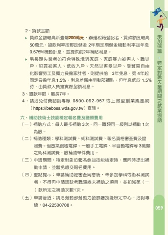 %u7bc7%u4fdd%u52a0%u672a%u52a9%u5354%u696d%u5c31%u4e4b%u9593%u671f%u696d%u5931%u8c61%u5c0d%u5b9a%u7279%u4e09%u3001%u8077%u696d%u8a13%u7df4%u751f%u6d3b%u6d25%u8cbc%uff08%u4e00%uff09%u88dc%u52a9%u689d%u4ef6 %u7d93%u516c%u7acb%u5c31%u696d%u670d%u52d9%u6a5f%u69cb%u5c31%u696d%u8aee%u8a62%u4e4b%u63a8%u4ecb%u53c3%u8a13%uff0c%u6216%u7d93%u653f%u5e9c%u6a5f%u95dc %u4e3b%u8fa6%u6216%u59d4%u8a17%u8fa6%u7406%u4e4b%u8077%u696d%u8a13%u7df4%u55ae%u4f4d%u7504%u9078%u9304%u8a13%u8005%u3002%u53c3%u8a13%u6027%u8cea%u70ba%u5404%u985e%u5168%u65e5%u5236%u8077%u696d%u8a13%u7df4%u3002%uff08%u4e8c%uff09%u88dc%u52a9%u91d1%u984d%uff1a%u6309%u4e2d%u592e%u4e3b%u7ba1%u6a5f%u95dc%u516c%u544a%u4e4b%u6bcf%u6708%u6700%u4f4e%u5de5%u8cc7%u768460%%u767c%u7d66%u3002%u3000%u3000%u3000%uff08115%u5e74%u5ea6%u6700%u4f4e%u5de5%u8cc7%u70ba%u6708%u85aa29,500%u5143%uff0c%u6642%u85aa196%u5143%u3002%uff09%uff08%u4e09%uff09%u88dc%u52a9%u671f%u9593%uff1a%u5408%u4f75%u5c31%u696d%u4fc3%u9032%u6d25%u8cbc%u5be6%u65bd%u8fa6%u6cd5%u3001%u5c31%u696d%u4fdd%u96aa%u6cd5%uff0c%u65bc2%u5e74%u5167%u9818%u53d6%u8077%u696d%u751f%u6d3b%u6d25%u8cbc%u6216%u540c%u6027%u8cea%u4e4b%u6d25%u8cbc%u6216%u88dc%u52a9%uff0c%u9818%u53d6%u671f%u9593%u4ee56%u500b%u6708%u70ba%u9650%u3002%uff08%u56db%uff09%u7533%u8acb%u7ba1%u9053%uff1a%u8acb%u6d3d%u8a13%u7df4%u55ae%u4f4d%u8fa6%u7406%u3002%u56db%u3001%u81e8%u6642%u5de5%u4f5c%u6d25%u8cbc%uff08%u4e00%uff09%u88dc%u52a9%u689d%u4ef6%uff1a%u7d93%u5c31%u696d%u8aee%u8a62%u4e26%u63a8%u4ecb%u5c31%u696d%u6709%u4e0b%u5217%u60c5%u5f62%u4e4b%u4e00%u8005%uff0c%u516c%u7acb%u5c31%u696d%u670d%u52d9%u6a5f%u69cb%u5f97%u6307%u6d3e%u7533%u8acb%u4eba%u81f3%u653f%u5e9c%u6a5f%u95dc%uff08%u69cb%uff09%u6216%u5408%u6cd5%u7acb%u6848%u4e4b%u975e%u71df%u5229%u5718%u9ad4%u5f9e%u4e8b%u81e8%u6642 %u6027%u5de5%u4f5c%u3002 %u65bc%u6c42%u8077%u767b%u8a18%u65e5%u8d7714%u65e5%u5167%u672a%u80fd%u63a8%u4ecb%u5c31%u696d%u3002 %u6709%u6b63%u7576%u7406%u7531%u7121%u6cd5%u63a5%u53d7%u63a8%u4ecb%u5de5%u4f5c%uff08%u6307%u5de5%u4f5c%u5831%u916c%u672a%u9054%u539f%u6295%u4fdd%u85aa%uff0c%u6216%u5de5%u4f5c%u5730%u9ede%u8ddd%u96e2%u65e5%u5e38%u5c45%u4f4f%u8655%u624030%u516c%u91cc%u4ee5%u4e0a%u8005%uff09%u3002%uff08%u4e8c%uff09%u88dc%u52a9%u91d1%u984d%uff1a%u6309%u4e2d%u592e%u4e3b%u7ba1%u6a5f%u95dc%u516c%u544a%u4e4b%u6bcf%u5c0f%u6642%u6700%u4f4e%u5de5%u8cc7%u6838%u7d66%uff0c%u4e141%u500b%u6708%u5408%u8a08%u4e0d%u8d85%u904e%u516c%u544a%u4e4b%u6bcf%u6708%u6700%u4f4e%u5de5%u8cc7%u3002%uff08115%u5e74%u5ea6%u6700%u4f4e%u5de5%u8cc7%u70ba%u6708%u85aa29,500%u5143%uff0c%u6642%u85aa196%u5143%u3002%uff09%uff08%u4e09%uff09%u88dc%u52a9%u671f%u9593%uff1a%u6700%u95776%u500b%u6708%u3002%u8cc760%%uff08%u56db%uff09%u7533%u8acb%u7ba1%u9053%uff1a%u8acb%u6d3d%u5404%u516c%u7acb%u5c31%u696d%u670d%u52d9%u6a5f%u69cb%u8fa6%u7406%u3002%u4e94%u3001%u5fae%u578b%u5275%u696d%u9cf3%u51f0%u8cb8%u6b3e%u5229%u606f%u88dc%u8cbc%u53ca%u5275%u696d%u8aee%u8a62%u8f14%u5c0e%u670d%u52d9%uff08%u4e00%uff09%u63d0%u4f9b%u514d%u8cbb%u5275%u696d%u7814%u7fd2%u8ab2%u7a0b%u3001%u5275%u696d%u8aee%u8a62%u8f14%u5c0e%u670d%u52d9%u3002%uff08%u4e8c%uff09%u5fae%u578b%u5275%u696d%u9cf3%u51f0%u8cb8%u6b3e1%u3001%u7533%u8acb%u8cc7%u683c%uff1a %u672a%u6eff45%u6b72%u4e4b%u6210%u5e74%u5973%u6027%u3001%u5e74%u6eff45%u6b72%u81f365%u6b72%u8005%u53ca65%u6b72%u4ee5%u4e0b%u8a2d%u7c4d%u96e2%u5cf6%u6210%u5e74%u4eba%u3002%u97003%u5e74%u5167%u66fe%u53c3%u8207%u653f%u5e9c%u5275%u696d%u7814%u7fd2%u8ab2%u7a0b%uff0c%u4e26%u7d93%u5275%u696d%u8aee%u8a62%u8f14%u5c0e%uff0c%u6240%u7d93%u71df%u4e8b%u696d%u4f9d%u76f8%u95dc%u6cd5%u898f%u8fa6%u7406%u767b%u8a18%u672a%u8d85%u904e5%u5e74%u4e14%u54e1%u5de5%u6578%uff08%u4e0d%u542b%u8ca0%u8cac%u4eba%uff09%u672a%u6eff5%u4eba%u8005%u3002%u7bc7%u4fdd%u52a0%u672a%u52a9%u5354%u696d%u5c31%u4e4b%u9593%u671f%u696d%u5931%u8c61%u5c0d%u5b9a%u72792%u3001%u8cb8%u6b3e%u91d1%u984d %u8cb8%u6b3e%u91d1%u984d%u6700%u9ad8%u65b0%u81fa%u5e63200%u842c%u5143%uff0c%u8fa6%u7406%u7a05%u7c4d%u767b%u8a18%u8005%uff0c%u8cb8%u6b3e%u984d%u5ea6%u6700%u9ad850%u842c%u5143%uff0c%u8cb8%u6b3e%u5229%u7387%u6309%u90f5%u653f%u5132%u91d1 2%u5e74%u671f%u5b9a%u671f%u5132%u91d1%u6a5f%u52d5%u5229%u7387%u52a0%u5e74%u606f0.575%uff05%u6a5f%u52d5%u8a08%u606f%uff0c%u4e26%u63d0%u4f9b%u524d2%u5e74%u88dc%u8cbc%u5229%u606f%u3002 %u53e6%u9577%u671f%u5931%u696d%u8005%u5982%u7b26%u5408%u7279%u6b8a%u5883%u9047%u5bb6%u5ead%u3001%u5bb6%u5ead%u66b4%u529b%u88ab%u5bb3%u4eba%u3001%u8077%u707d%u6236%u3001%u72af%u7f6a%u88ab%u5bb3%u4eba%u3001%u4f4e%u6536%u5165%u6236%u3001%u5929%u7136%u707d%u5bb3%u53d7%u707d%u6236%u3001%u53d7%u8cbf%u6613%u81ea%u7531%u5316%u5f71%u97ff%u52de%u5de5%u53ca%u7368%u529b%u8ca0%u64d4%u5bb6%u8a08%u8005%uff0c%u5247%u63d0%u4f9b%u524d 3%u5e74%u514d%u606f%uff0c%u7b2c 4%u5e74%u8d77%u56fa%u5b9a%u8ca0%u64d4%u5e74%u606f%u6642%uff0c%u7531%u8cb8%u6b3e%u4eba%u8ca0%u64d4%u5be6%u969b%u5168%u984d%u5229%u606f%u30021.5%%uff0c%u5229%u606f%u5dee%u984d%u7531%u52de%u52d5%u90e8%u88dc%u8cbc%uff0c%u4f46%u5e74%u606f%u4f4e%u65bc 1.5%3%u3001%u9084%u6b3e%u5e74%u9650%uff1a%u6700%u95777%u5e74%u30024%u3001%u8acb%u6d3d%u514d%u4ed8%u8cbb%u8aee%u8a62%u5c08%u7dda %u6216%u4e0a%u5fae%u578b%u5275%u696d%u9cf3%u51f0%u7db2%uff08https://beboss.wda.gov.tw%uff09%u67e5%u8a62%u3002%u516d%u3001%u88dc%u52a9%u6280%u8853%u58eb%u6280%u80fd%u6aa2%u5b9a%u5831%u540d%u8cbb%u53ca%u8b49%u7167%u8cbb%u7528%uff08%u4e00%uff09%u88dc%u52a9%u65b9%u5f0f%uff1a%u6bcf%u4eba%u6700%u591a%u88dc%u52a9 3%u6b21%uff0c%u540c%u4e00%u8077%u985e%u540c%u4e00%u7d1a%u5225%u4ee5%u88dc%u52a9 1%u6b21%u70ba%u9650%u3002%uff08%u4e8c%uff09%u88dc%u52a9%u7a2e%u985e%uff1a%u5b78%u79d1%u6e2c%u8a66%u8cbb%u3001%u8853%u79d1%u6e2c%u8a66%u8cbb%u3001%u5831%u540d%u8cc7%u683c%u5be9%u67e5%u8cbb%u53ca%u8b49%u7167%u8cbb%u3002%u4f46%u6c2c%u6c23%u93a2%u6975%u96fb%u92b2%u3001%u4e00%u822c%u624b%u5de5%u96fb%u92b2%u3001%u534a%u81ea%u52d5%u96fb%u92b2%u7b49 3%u8077%u985e%u4e4b%u8853%u79d1%u6e2c%u8a66%u8cbb%uff0c%u9650%u88dc%u52a9%u55ae%u4ef6%u8cbb%u7528%u3002%uff08%u4e09%uff09%u7533%u8acb%u671f%u9593%uff1a%u7279%u5b9a%u5c0d%u8c61%u65bc%u5831%u540d%u53c3%u52a0%u6280%u80fd