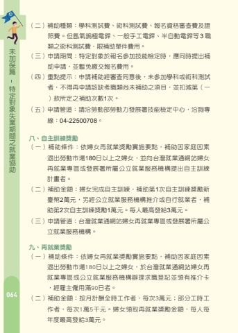 %u7bc7%u4fdd%u52a0%u672a%u52a9%u5354%u696d%u5c31%u4e4b%u9593%u671f%u696d%u5931%u8c61%u5c0d%u5b9a%u7279%u7167%u8cbb%u3002%u4f46%u6c2c%u6c23%u93a2%u6975%u96fb%u92b2%u3001%u4e00%u822c%u624b%u5de5%u96fb%u92b2%u3001%u534a%u81ea%u52d5%u96fb%u92b2%u7b493 %u8077%u985e%u4e4b%u8853%u79d1%u6e2c%u8a66%u8cbb%uff0c%u9650%u88dc%u52a9%u55ae%u4ef6%u8cbb%u7528%u3002%uff08%u4e09%uff09%u7533%u8acb%u671f%u9593%uff1a%u7279%u5b9a%u5c0d%u8c61%u65bc%u5831%u540d%u53c3%u52a0%u6280%u80fd%u6aa2%u5b9a%u6642%uff0c%u61c9%u540c%u6642%u63d0%u51fa%u88dc%u52a9%u7533%u8acb%uff0c%u4e26%u66ab%u514d%u7e73%u4ea4%u5831%u540d%u8cbb%u7528%u3002%uff08%u56db%uff09%u91cd%u9ede%u63d0%u793a%uff1a%u7533%u8acb%u88dc%u52a9%u7d93%u5be9%u67e5%u540c%u610f%u5f8c%uff0c%u672a%u53c3%u52a0%u5b78%u79d1%u6216%u8853%u79d1%u6e2c%u8a66%u8005%uff0c%u4e0d%u5f97%u518d%u7533%u8acb%u8a72%u7f3a%u8003%u8077%u985e%u5c1a%u672a%u88dc%u52a9%u4e4b%u9805%u76ee%uff0c%u4e26%u6263%u6e1b%u7b2c%uff08%u4e00%uff09%u6b3e%u6240%u5b9a%u4e4b%u88dc%u52a9%u6b21%u65781%u6b21%u3002%uff08%u4e94%uff09%u7533%u8acb%u7ba1%u9053%uff1a%u8acb%u6d3d%u52de%u52d5%u90e8%u52de%u52d5%u529b%u767c%u5c55%u7f72%u6280%u80fd%u6aa2%u5b9a%u4e2d%u5fc3%uff0c%u6d3d%u8a62%u5c08%u7dda%uff1a04-22500708%u3002%uff08%u4e8c%uff09%u88dc%u52a9%u7a2e%u985e%uff1a%u5b78%u79d1%u6e2c%u8a66%u8cbb%u3001%u8853%u79d1%u6e2c%u8a66%u8cbb%u3001%u5831%u540d%u8cc7%u683c%u5be9%u67e5%u8cbb%u53ca%u8b49%u516b%u3001%u81ea%u4e3b%u8a13%u7df4%u734e%u52f5%uff08%u4e00%uff09%u88dc%u52a9%u689d%u4ef6%uff1a%u4f9d%u5a66%u5973%u518d%u5c31%u696d%u734e%u52f5%u5be6%u65bd%u8981%u9ede%uff0c%u88dc%u52a9%u56e0%u5bb6%u5ead%u56e0%u7d20%u9000%u51fa%u52de%u52d5%u5e02%u5834180%u65e5%u4ee5%u4e0a%u4e4b%u5a66%u5973%uff0c%u4e26%u5411%u53f0%u7063%u5c31%u696d%u901a%u7db2%u7ad9%u5a66%u5973%u518d%u5c31%u696d%u5c08%u5340%u6216%u767c%u5c55%u7f72%u6240%u5c6c%u516c%u7acb%u5c31%u696d%u670d%u52d9%u6a5f%u69cb%u63d0%u51fa%u81ea%u4e3b%u8a13%u7df4%u8a08%u756b%u8005%u3002%uff08%u4e8c%uff09%u88dc%u52a9%u91d1%u984d%uff1a%u5a66%u5973%u5b8c%u6210%u81ea%u4e3b%u8a13%u7df4%uff0c%u88dc%u52a9%u7b2c1%u6b21%u81ea%u4e3b%u8a13%u7df4%u734e%u52f5%u65b0%u81fa%u5e632%u842c%u5143%uff0c%u53e6%u7d93%u516c%u7acb%u5c31%u696d%u670d%u52d9%u6a5f%u69cb%u63a8%u4ecb%u6216%u81ea%u884c%u5c31%u696d%u8005%uff0c%u88dc%u52a9%u7b2c2%u6b21%u81ea%u4e3b%u8a13%u7df4%u734e%u52f51%u842c%u5143%u3002%u6bcf%u4eba%u6700%u9ad8%u767c%u7d663%u842c%u5143%u3002%uff08%u4e09%uff09%u7533%u8acb%u7ba1%u9053%uff1a%u53f0%u7063%u5c31%u696d%u901a%u7db2%u7ad9%u5a66%u5973%u518d%u5c31%u696d%u5c08%u5340%u6216%u767c%u5c55%u7f72%u6240%u5c6c%u516c%u7acb%u5c31%u696d%u670d%u52d9%u6a5f%u69cb%u3002%u4e5d%u3001%u518d%u5c31%u696d%u734e%u52f5%uff08%u4e00%uff09%u88dc%u52a9%u689d%u4ef6%uff1a%u4f9d%u5a66%u5973%u518d%u5c31%u696d%u734e%u52f5%u5be6%u65bd%u8981%u9ede%uff0c%u88dc%u52a9%u56e0%u5bb6%u5ead%u56e0%u7d20%u9000%u51fa%u52de%u52d5%u5e02%u5834180%u65e5%u4ee5%u4e0a%u4e4b%u5a66%u5973%uff0c%u65bc%u53f0%u7063%u5c31%u696d%u901a%u7db2%u7ad9%u5a66%u5973%u518d%u5c31%u696d%u5c08%u5340%u6216%u516c%u7acb%u5c31%u696d%u670d%u52d9%u6a5f%u69cb%u8fa6%u7406%u6c42%u8077%u767b%u8a18%u4e26%u9818%u6709%u63a8%u4ecb%u5361%uff0c%u7d93%u96c7%u4e3b%u50f1%u7528%u6eff90%u65e5%u8005%u3002%uff08%u4e8c%uff09%u88dc%u52a9%u91d1%u984d%uff1a%u6309%u6708%u8a08%u916c%u5168%u6642%u5de5%u4f5c%u8005%uff0c%u6bcf%u6b213%u842c%u5143%uff1b%u90e8%u5206%u5de5%u6642%u5de5%u4f5c%u8005%uff0c%u6bcf%u6b211%u842c5%u5343%u5143%u3002%u5a66%u5973%u9818%u53d6%u518d%u5c31%u696d%u734e%u52f5%u91d1%u984d%uff0c%u6bcf%u4eba%u6bcf%u5e74%u5ea6%u6700%u9ad8%u767c%u7d663%u842c%u5143%u3002%u7bc7%u4fdd%u52a0%u672a%u52a9%u5354%u696d%u5c31%u4e4b%u9593%u671f%u696d%u5931%u8c61%u5c0d%u5b9a%u7279%u96c7%u4e3b%u7bc7%u4e00%u3001%u8077%u5834%u5b78%u7fd2%u53ca%u518d%u9069%u61c9%u8a08%u756b%uff08%u4e00%uff09%u88dc%u52a9%u689d%u4ef6%uff1a%u4f9d%u64da%u6240%u9032%u7528%u8077%u5834%u5b78%u7fd2%u53ca%u518d%u9069%u61c9%u4eba%u6578%uff0c%u88dc%u52a9%u884c%u653f%u7ba1%u7406%u53ca%u8f14%u5c0e%u8cbb%u3002%u4e09%u3001%u96c7%u4e3b%u5de5%u6642%u8abf%u6574%u734e%u52f5%uff08%u4e8c%uff09%u88dc%u52a9%u91d1%u984d%uff1a%u4ee5%u5be6%u969b%u6838%u767c%u8077%u5834%u5b78%u7fd2%u53ca%u518d%u9069%u61c9%u6d25%u8cbc%u91d1%u984d%u4e4b30%%u6838%u7d66%u3002%uff08%u4e09%uff09%u88dc%u52a9%u671f%u9593%uff1a%u6700%u9577%u4ee53%u500b%u6708%u70ba%u9650%u3002%uff08%u56db%uff09%u7533%u8acb%u7ba1%u9053%uff1a%u8acb%u6d3d%u5404%u516c%u7acb%u5c31%u696d%u670d%u52d9%u6a5f%u69cb%u8fa6%u7406%u3002%u4e8c%u3001%u50f1%u7528%u734e%u52a9%u63aa%u65bd%uff08%u4e00%uff09%u88dc%u52a9%u689d%u4ef6%uff1a%u3000%u3000%u3000%u96c7%u4e3b%u4ee5%u4e0d%u5b9a%u671f%u5951%u7d04%u6216%u4e00%u5e74%u4ee5%u4e0a%u4e4b%u5b9a%u671f%u5951%u7d04%uff0c%u50f1%u7528%u7531%u516c%u7acb%u5c31%u696d%u3000%u3000%u3000%u670d%u52d9%u6a5f%u69cb%u767c%u7d66%u50f1%u7528%u734e%u52a9%u63a8%u4ecb%u5361%u4e4b%u4e8c%u5ea6%u5c31%u696d%u5a66%u5973%uff0c%u9023%u7e8c%u6eff30%u65e5%u3000%u3000%u3000%u4e14%u7b26%u5408%u76f8%u95dc%u898f%u5b9a%uff0c%u767c%u7d66%u50f1%u7528%u734e%u52a9%u3002%uff08%u4e8c%uff09%u88dc%u52a9%u91d1%u984d%uff1a%uff08%u4e09%uff09%u88dc%u52a9%u671f%u9593%uff1a%u6700%u9577%u4ee512%u500b%u6708%u70ba%u9650%u3002%uff08%u56db%uff09%u7533%u8acb%u7ba1%u9053%uff1a%u8acb%u6d3d%u5404%u516c%u7acb%u5c31%u696d%u670d%u52d9%u6a5f%u69cb%u8fa6%u7406%u3002%u6309%u6708%u8a08%u916c%u8005%uff1a%u6bcf%u50f1%u75281%u4eba%uff0c%u6bcf%u6708%u6700%u9ad8%u767c%u7d66%u65b0%u81fa%u5e6311,000%u5143%u3002%u4ee5%u5176%u4ed6%u65b9%u5f0f%u7d66%u4ed8%u5de5%u8cc7%u8005%uff1a%u6bcf%u50f1%u75281%u4eba%uff0c%u6bcf%u5c0f%u6642%u767c%u7d66%u65b0%u81fa%u5e6360%u5143%uff0c%u6bcf%u6708%u6700%u9ad8%u767c%u7d66%u65b0%u81fa%u5e6311,000%u5143%u3002%uff08%u4e09%uff09%u7533%u8acb%u7ba1%u9053%uff1a%u767c%u5c55%u7f72%u6240%u5c6c%u516c%u7acb%u5c31%u696d%u670d%u52d9%u6a5f%u69cb%u3001%u76f4%u8f44%u5e02%u653f%u5e9c%u6240%u5c6c%u516c%u7acb%u5c31%u696d%u670d%u52d9%u6a5f%u69cb%u6216%u53f0%u7063%u5c31%u696d%u901a%u7db2%u7ad9%u5a66%u5973%u518d%u5c31%u696d%u5c08%u5340%u5831%u540d%u53c3%u52a0%u3002%uff08%u4e00%uff09%u88dc%u52a9%u689d%u4ef6%uff1a%u4f9d%u5a66%u597