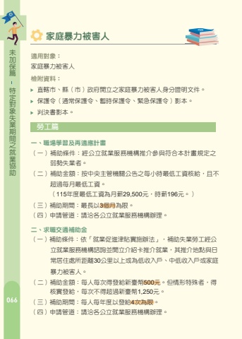 %u7bc7%u4fdd%u52a0%u672a%u52a9%u5354%u696d%u5c31%u4e4b%u9593%u671f%u696d%u5931%u8c61%u5c0d%u5b9a%u7279%u5bb6%u5ead%u66b4%u529b%u88ab%u5bb3%u4eba%u9069%u7528%u5c0d%u8c61%uff1a%u5bb6%u5ead%u66b4%u529b%u88ab%u5bb3%u4eba%u6aa2%u9644%u8cc7%u6599%uff1a %u76f4%u8f44%u5e02%u3001%u7e23%uff08%u5e02%uff09%u653f%u5e9c%u958b%u7acb%u4e4b%u5bb6%u5ead%u66b4%u529b%u88ab%u5bb3%u4eba%u8eab%u5206%u8b49%u660e%u6587%u4ef6%u3002 %u4fdd%u8b77%u4ee4%uff08%u901a%u5e38%u4fdd%u8b77%u4ee4%u3001%u66ab%u6642%u4fdd%u8b77%u4ee4%u3001%u7dca%u6025%u4fdd%u8b77%u4ee4%uff09%u5f71%u672c%u3002 %u5224%u6c7a%u66f8%u5f71%u672c%u3002%u52de%u5de5%u7bc7%u4e00%u3001%u8077%u5834%u5b78%u7fd2%u53ca%u518d%u9069%u61c9%u8a08%u756b%uff08%u4e00%uff09%u88dc%u52a9%u689d%u4ef6%uff1a%u7d93%u516c%u7acb%u5c31%u696d%u670d%u52d9%u6a5f%u69cb%u63a8%u4ecb%u53c3%u8207%u7b26%u5408%u672c%u8a08%u756b%u898f%u5b9a%u4e4b%u5f31%u52e2%u5931%u696d%u8005%u3002%uff08%u4e8c%uff09%u88dc%u52a9%u91d1%u984d%uff1a%u6309%u4e2d%u592e%u4e3b%u7ba1%u6a5f%u95dc%u516c%u544a%u4e4b%u6bcf%u5c0f%u6642%u6700%u4f4e%u5de5%u8cc7%u6838%u7d66%uff0c%u4e14%u4e0d%u8d85%u904e%u6bcf%u6708%u6700%u4f4e%u5de5%u8cc7%u3002%uff08115%u5e74%u5ea6%u6700%u4f4e%u5de5%u8cc7%u70ba%u6708%u85aa29,500%u5143%uff0c%u6642%u85aa196%u5143%u3002%uff09%uff08%u4e09%uff09%u88dc%u52a9%u671f%u9593%uff1a%u6700%u9577%u4ee53%u500b%u6708%u70ba%u9650%u3002%uff08%u56db%uff09%u7533%u8acb%u7ba1%u9053%uff1a%u8acb%u6d3d%u5404%u516c%u7acb%u5c31%u696d%u670d%u52d9%u6a5f%u69cb%u8fa6%u7406%u3002%u4e8c%u3001%u6c42%u8077%u4ea4%u901a%u88dc%u52a9%u91d1%uff08%u4e00%uff09%u88dc%u52a9%u689d%u4ef6%uff1a%u4f9d%u300c%u5c31%u696d%u4fc3%u9032%u6d25%u8cbc%u5be6%u65bd%u8fa6%u6cd5%u300d%uff0c%u88dc%u52a9%u5931%u696d%u52de%u5de5%u7d93%u516c%u7acb%u5c31%u696d%u670d%u52d9%u6a5f%u69cb%u8aee%u8a62%u4e26%u958b%u7acb%u4ecb%u7d39%u5361%u63a8%u4ecb%u5c31%u696d%uff0c%u5176%u63a8%u4ecb%u5730%u9ede%u8207%u65e5%u5e38%u5c45%u4f4f%u8655%u6240%u8ddd%u96e230%u516c%u91cc%u4ee5%u4e0a%u6216%u70ba%u4f4e%u6536%u5165%u6236%u3001%u4e2d%u4f4e%u6536%u5165%u6236%u6216%u5bb6%u5ead%u66b4%u529b%u88ab%u5bb3%u4eba%u3002%uff08%u4e8c%uff09%u88dc%u52a9%u91d1%u984d%uff1a%u6bcf%u4eba%u6bcf%u6b21%u5f97%u767c%u7d66%u65b0%u81fa%u5e63500%u5143%u3002%u4f46%u60c5%u5f62%u7279%u6b8a%u8005%uff0c%u5f97%u3000%u3000%u3000%u6838%u5be6%u767c%u7d66%uff0c%u6bcf%u6b21%u4e0d%u5f97%u8d85%u904e%u65b0%u81fa%u5e631,250%u5143%u3002%uff08%u4e09%uff09%u88dc%u52a9%u671f%u9593%uff1a%u6bcf%u4eba%u6bcf%u5e74%u5ea6%u4ee5%u767c%u7d664%u6b21%u70ba%u9650%u3002%uff08%u56db%uff09%u7533%u8acb%u7ba1%u9053%uff1a%u8acb%u6d3d%u5404%u516c%u7acb%u5c31%u696d%u670d%u52d9%u6a5f%u69cb%u8fa6%u7406%u3002%u7bc7%u4fdd%u52a0%u672a%u52a9%u5354%u696d%u5c31%u4e4b%u9593%u671f%u696d%u5931%u8c61%u5c0d%u5b9a%u7279%u4e09%u3001%u8077%u696d%u8a13%u7df4%u751f%u6d3b%u6d25%u8cbc%uff08%u4e00%uff09%u88dc%u52a9%u689d%u4ef6 %u7d93%u516c%u7acb%u5c31%u696d%u670d%u52d9%u6a5f%u69cb%u5c31%u696d%u8aee%u8a62%u4e4b%u63a8%u4ecb%u53c3%u8a13%uff0c%u6216%u7d93%u653f%u5e9c%u6a5f%u95dc %u4e3b%u8fa6%u6216%u59d4%u8a17%u8fa6%u7406%u4e4b%u8077%u696d%u8a13%u7df4%u55ae%u4f4d%u7504%u9078%u9304%u8a13%u8005%u3002%u53c3%u8a13%u6027%u8cea%u70ba%u5404%u985e%u5168%u65e5%u5236%u8077%u696d%u8a13%u7df4%u3002%uff08%u4e09%uff09%u88dc%u52a9%u671f%u9593%uff1a%u5408%u4f75%u5c31%u696d%u4fc3%u9032%u6d25%u8cbc%u5be6%u65bd%u8fa6%u6cd5%u3001%u5c31%u696d%u4fdd%u96aa%u6cd5%uff0c%u65bc2%u5e74%u5167%u9818%u53d6%u8077%u696d%u751f%u6d3b%u6d25%u8cbc%u6216%u540c%u6027%u8cea%u4e4b%u6d25%u8cbc%u6216%u88dc%u52a9%uff0c%u9818%u53d6%u671f%u9593%u4ee56%u500b%u6708%u70ba%u9650%u3002%uff08%u56db%uff09%u7533%u8acb%u7ba1%u9053%uff1a%u8acb%u6d3d%u8a13%u7df4%u55ae%u4f4d%u8fa6%u7406%u3002%u56db%u3001%u81e8%u6642%u5de5%u4f5c%u6d25%u8cbc%uff08%u4e00%uff09%u88dc%u52a9%u689d%u4ef6%uff1a%u7d93%u5c31%u696d%u8aee%u8a62%u4e26%u63a8%u4ecb%u5c31%u696d%u6709%u4e0b%u5217%u60c5%u5f62%u4e4b%u4e00%u8005%uff0c%u516c%u7acb%u5c31%u696d%u670d%u52d9%u6a5f%u69cb%u5f97%u6307%u6d3e%u7533%u8acb%u4eba%u81f3%u653f%u5e9c%u6a5f%u95dc%uff08%u69cb%uff09%u6216%u5408%u6cd5%u7acb%u6848%u4e4b%u975e%u71df%u5229%u5718%u9ad4%u5f9e%u4e8b%u81e8%u6642 %u6027%u5de5%u4f5c%u3002%u65bc%u6c42%u8077%u767b%u8a18%u65e5%u8d7714%u65e5%u5167%u672a%u80fd%u63a8%u4ecb%u5c31%u696d%u3002%u6709%u6b63%u7576%u7406%u7531%u7121%u6cd5%u63a5%u53d7%u63a8%u4ecb%u5de5%u4f5c%u6307%u5de5%u4f5c%u5831%u916c%u672a%u9054%u539f%u6295%u4fdd%u85aa%u8cc760%%uff0c%u6216%u5de5%u4f5c%u5730%u9ede%u8ddd%u96e2%u65e5%u5e38%u5c45%u4f4f%u8655%u624030%u516c%u91cc%u4ee5%u4e0a%u8005%u3002%uff08%u4e8c%uff09%u88dc%u52a9%u91d1%u984d%uff1a%u6309%u4e2d%u592e%u4e3b%u7ba1%u6a5f%u95dc%u516c%u544a%u4e4b%u6bcf%u5c0f%u6642%u6700%u4f4e%u5de5%u8cc7%u6838%u7d66%uff0c%u4e141%u500b%u6708%u5408%u8a08%u4e0d%u8d85%u904e%u516c%u544a%u4e4b%u6bcf%u6708%u6700%u4f4e%u5de5%u8cc7%u3002%uff08115%u5e74%u5ea6%u6700%u4f4e%u5de5%u8cc7%u70ba%u6708%u85aa29,500%u5143%uff0c%u6642%u85aa196%u5143%u3002%uff09%uff08%u4e09%uff09%u88dc%u52a9%u671f%u9593%uff1a%u6700%u95776%u500b%u6708%u3002%uff08%u56db%uff09%u7533%u8acb%u7ba1%u9053%uff1a%u8acb%u6d3d%u5404%u516c%u7acb%u5c31%u696d%u670d%u52d9%u6a5f%u69cb%u8fa6%u7406%u3002%u4e94%u3001%u5fae%u578b%u5275%u696d%u9cf3%u51f0%u8cb8%u6b3e%u5229%u606f%u88dc%u8cbc%u53ca%u5275%u696d%u8aee%u8a62%u8f14%u5c0e%u670d%u52d9%uff08%u4e00%uff09%u63d0%u4f9b%u514d%u8cbb%u5275%u696d%u7814%u7fd2%u8ab2%u7a0b%u3001%u5275%u696d%u8aee%u8a62%u8f14%u5c0e%u670d%u52d9%u3002%uff08%u4e8c%uff09%u5fae%u578b%u5275%u696d%u9cf3%u51f0%u8cb8%u6b3e%uff08%u4e8c%uff09%u88dc%u52a9%u91d1%u984d%uff1a%u6309%u4e2d%u592e%u4e3b%u7ba1%u6a5f%u95dc%u516c%u544a%u4e4b%u6bcf%u6708%u6700%u4f4e%u5de5%u8cc7%u768460%%u767c%u7d66%u3002%u3000%u3000%u3000%uff08115%u5e74%u5ea6%u6700%u4f4e%u5de5%u8cc7%u70ba%u6708%u85aa29,500%u5143%uff0c%u6642%u85aa196%u5143%u3002%uff09