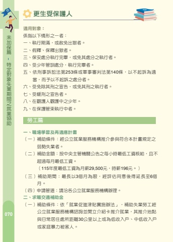 %u7bc7%u4fdd%u52a0%u672a%u52a9%u5354%u696d%u5c31%u4e4b%u9593%u671f%u696d%u5931%u8c61%u5c0d%u5b9a%u7279%u52de%u5de5%u7bc7%u4e00%u3001%u8077%u5834%u5b78%u7fd2%u53ca%u518d%u9069%u61c9%u8a08%u756b%uff08%u4e00%uff09%u88dc%u52a9%u689d%u4ef6%uff1a%u7d93%u516c%u7acb%u5c31%u696d%u670d%u52d9%u6a5f%u69cb%u63a8%u4ecb%u53c3%u8207%u7b26%u5408%u672c%u8a08%u756b%u898f%u5b9a%u4e4b%u5f31%u52e2%u5931%u696d%u8005%u3002%uff08%u4e8c%uff09%u88dc%u52a9%u91d1%u984d%uff1a%u6309%u4e2d%u592e%u4e3b%u7ba1%u6a5f%u95dc%u516c%u544a%u4e4b%u6bcf%u5c0f%u6642%u6700%u4f4e%u5de5%u8cc7%u6838%u7d66%uff0c%u4e14%u4e0d%u8d85%u904e%u6bcf%u6708%u6700%u4f4e%u5de5%u8cc7%u3002%uff08115%u5e74%u5ea6%u6700%u4f4e%u5de5%u8cc7%u70ba%u6708%u85aa29,500%u5143%uff0c%u6642%u85aa196%u5143%u3002%uff09%uff08%u4e09%uff09%u88dc%u52a9%u671f%u9593%uff1a%u6700%u9577%u4ee53%u500b%u6708%u70ba%u9650%uff0c%u7d93%u8a55%u4f30%u540c%u610f%u5f8c%u5f97%u5ef6%u9577%u81f36%u500b%u6708%u3002%uff08%u56db%uff09%u7533%u8acb%u7ba1%u9053%uff1a%u8acb%u6d3d%u5404%u516c%u7acb%u5c31%u696d%u670d%u52d9%u6a5f%u69cb%u8fa6%u7406%u3002%u4e8c%u3001%u6c42%u8077%u4ea4%u901a%u88dc%u52a9%u91d1%uff08%u4e00%uff09%u88dc%u52a9%u689d%u4ef6%uff1a%u4f9d%u300c%u5c31%u696d%u4fc3%u9032%u6d25%u8cbc%u5be6%u65bd%u8fa6%u6cd5%u300d%uff0c%u88dc%u52a9%u5931%u696d%u52de%u5de5%u7d93%u516c%u7acb%u5c31%u696d%u670d%u52d9%u6a5f%u69cb%u8aee%u8a62%u4e26%u958b%u7acb%u4ecb%u7d39%u5361%u63a8%u4ecb%u5c31%u696d%uff0c%u5176%u63a8%u4ecb%u5730%u9ede%u8207%u65e5%u5e38%u5c45%u4f4f%u8655%u6240%u8ddd%u96e230%u516c%u91cc%u4ee5%u4e0a%u6216%u70ba%u4f4e%u6536%u5165%u6236%u3001%u4e2d%u4f4e%u6536%u5165%u6236%u6216%u5bb6%u5ead%u66b4%u529b%u88ab%u5bb3%u4eba%u3002%u66f4%u751f%u53d7%u4fdd%u8b77%u4eba%u9069%u7528%u5c0d%u8c61%uff1a%u4fc2%u6307%u4ee5%u4e0b%u60c5%u5f62%u4e4b%u4e00%u8005%uff1a%u4e00%u3001%u57f7%u884c%u671f%u6eff%uff0c%u6216%u8d66%u514d%u51fa%u7344%u8005%u3002%u4e8c%u3001%u5047%u91cb%u3001%u4fdd%u91cb%u51fa%u7344%u8005%u3002%u4e09%u3001%u4fdd%u5b89%u8655%u5206%u57f7%u884c%u5b8c%u7562%uff0c%u6216%u514d%u5176%u8655%u5206%u4e4b%u57f7%u884c%u8005%u3002%u56db%u3001%u53d7%u5c11%u5e74%u7ba1%u8a13%u8655%u5206%uff0c%u57f7%u884c%u5b8c%u7562%u8005%u3002%u4e94%u3001%u4f9d%u5211%u4e8b%u8a34%u8a1f%u6cd5%u7b2c253%u689d%u6216%u8ecd%u4e8b%u5be9%u5224%u6cd5%u7b2c140%u689d%uff0c%u4ee5%u4e0d%u8d77%u8a34%u70ba%u9069%u7576%uff0c%u800c%u4e88%u4ee5%u4e0d%u8d77%u8a34%u4e4b%u8655%u5206%u8005%u3002%u516d%u3001%u53d7%u514d%u9664%u5176%u5211%u4e4b%u5ba3%u544a%uff0c%u6216%u514d%u5176%u5211%u4e4b%u57f7%u884c%u8005%u3002%u4e03%u3001%u53d7%u7de9%u5211%u4e4b%u5ba3%u544a%u8005%u3002%u516b%u3001%u5728%u89c0%u8b77%u4eba%u89c0%u8b77%u4e2d%u4e4b%u5c11%u5e74%u3002%u4e5d%u3001%u5728%u4fdd%u8b77%u7ba1%u675f%u57f7%u884c%u4e2d%u8005%u3002%u7bc7%u4fdd%u52a0%u672a%u52a9%u5354%u696d%u5c31%u4e4b%u9593%u671f%u696d%u5931%u8c61%u5c0d%u5b9a%u7279%uff08%u4e09%uff09%u88dc%u52a9%u671f%u9593%uff1a%u6bcf%u4eba%u6bcf%u5e74%u5ea6%u4ee5%u767c%u7d664%u6b21%u70ba%u9650%u3002%uff08%u56db%uff09%u7533%u8acb%u7ba1%u9053%uff1a%u8acb%u6d3d%u5404%u516c%u7acb%u5c31%u696d%u670d%u52d9%u6a5f%u69cb%u8fa6%u7406%u3002%u4e09%u3001%u8077%u696d%u8a13%u7df4%u751f%u6d3b%u6d25%u8cbc%uff08%u4e00%uff09%u88dc%u52a9%u689d%u4ef6%u7d93%u516c%u7acb%u5c31%u696d%u670d%u52d9%u6a5f%u69cb%u5c31%u696d%u8aee%u8a62%u4e4b%u63a8%u4ecb%u53c3%u8a13%uff0c%u6216%u7d93%u653f%u5e9c%u6a5f%u95dc %u4e3b%u8fa6%u6216%u59d4%u8a17%u8fa6%u7406%u4e4b%u8077%u696d%u8a13%u7df4%u55ae%u4f4d%u7504%u9078%u9304%u8a13%u8005%u3002%u53c3%u8a13%u6027%u8cea%u70ba%u5404%u985e%u5168%u65e5%u5236%u8077%u696d%u8a13%u7df4%u3002%uff08%u4e8c%uff09%u88dc%u52a9%u91d1%u984d%uff1a%u6309%u4e2d%u592e%u4e3b%u7ba1%u6a5f%u95dc%u516c%u544a%u4e4b%u6bcf%u6708%u6700%u4f4e%u5de5%u8cc7%u768460%%u767c%u7d66%u3002%u3000%u3000%u3000%uff08115%u5e74%u5ea6%u6700%u4f4e%u5de5%u8cc7%u70ba%u6708%u85aa29,500%u5143%uff0c%u6642%u85aa196%u5143%u3002%uff09%uff08%u4e09%uff09%u88dc%u52a9%u671f%u9593%uff1a%u5408%u4f75%u5c31%u696d%u4fc3%u9032%u6d25%u8cbc%u5be6%u65bd%u8fa6%u6cd5%u3001%u5c31%u696d%u4fdd%u96aa%u6cd5%uff0c%u65bc2%u5e74%u5167%u9818%u53d6%u8077%u696d%u751f%u6d3b%u6d25%u8cbc%u6216%u540c%u6027%u8cea%u4e4b%u6d25%u8cbc%u6216%u88dc%u52a9%uff0c%u9818%u53d6%u671f%u9593%u4ee56%u500b%u6708%u70ba%u9650%u3002%uff08%u56db%uff09%u7533%u8acb%u7ba1%u9053%uff1a%u8acb%u6d3d%u8a13%u7df4%u55ae%u4f4d%u8fa6%u7406%u3002%u56db%u3001%u81e8%u6642%u5de5%u4f5c%u6d25%u8cbc%uff08%u4e00%uff09%u88dc%u52a9%u689d%u4ef6%uff1a%u7d93%u5c31%u696d%u8aee%u8a62%u4e26%u63a8%u4ecb%u5c31%u696d%u6709%u4e0b%u5217%u60c5%u5f62%u4e4b%u4e00%u8005%uff0c%u516c%u7acb%u5c31%u696d%u670d%u52d9%u6a5f%u69cb%u5f97%u6307%u6d3e%u7533%u8acb%u4eba%u81f3%u653f%u5e9c%u6a5f%u95dc%uff08%u69cb%uff09%u6216%u5408%u6cd5%u7acb%u6848%u4e4b%u975e%u71df%u5229%u5718%u9ad4%u5f9e%u4e8b%u81e8%u6642 %u6027%u5de5%u4f5c%u3002 %u65bc%u6c42%u8077%u767b%u8a18%u65e5%u8d7714%u65e5%u5167%u672a%u80fd%u63a8%u4ecb%u5c31%u696d%u3002 %u6709%u6b63%u7576%u7406%u7531%u7121%u6cd5%u63a5%u53d7%u63a8%u4ecb%u5de5%u4f5c%uff08%u6307%u5de5%u4f5c%u5831%u916c%u672a%u9054%u539f%u6295%u4fdd%u85aa%u8cc760%%uff0c%u6216%u5de5%u4f5c%u5730%u9ede%u8ddd%u96e2%u65e5%u5e38%u5c45%u4f4f%u8655%u624030%u516c%u91cc%u4ee5%u4e0a%u8005%uff09%u3002%uff08%u4e8c%uff09%u88dc%u52a9%u91d1%u984d%uff1a%u6309%u4e2d%u592e%u4e3b%u7ba1%u6a5f%u95dc%u516c%u544a%u4e4b%u6bcf%u5c0f%u6642%u6700%u4f4e%u5de5%u8cc7%u6838%u7d66%uff0c%u4e141%u500b%u6708%u5408%u8a08%u4e0d%u8d85%u904e%u516c%u544a%u4e4b%u6bcf%u6708%u6700%u4f4e%u5de5%u8cc7%u3002%uff08115%u5e74%u5ea6%u6700%u4f4e%u5de5%u8cc7%u70ba%u6708%u85aa29,500%u5143%uff0c%u6642%u85aa196%u5143%u3002%uff09%uff08%u4e09%uff09%u88dc%u52a9%u671f%u9593%uff1a%u6700%u95776%u500b%u6708%u3002%uff08%u56db%uff09%u7533%u8acb%u7ba1%u9053%uff1a%u8acb%u6d3d%u5404%u516c%u7acb%u5c31%u696d%u670d%u52d9%u6a5f%u69cb%u8fa6%u7406%u3002%u4e94%u3001%u5fae%u578b%u5275%u696d%u9cf3%u51f0%u8cb8%u6b3e%u5229%u606f%u88dc%u8cbc%u53ca%u5275%u696d%u8aee%u8a62%u8f14%u5c0e%uff08%u4e00%uff09%u63d0%u4f9b%u514d%u8cbb%u5275%u696d%u7814%u7fd2%u8ab2%u7a0b%u3001%u5275%u696d%u8aee%u8a62%u8f14%u5c0e%u670d%u52d9%u3002%