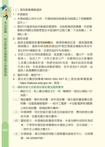 %u7bc7%u4fdd%u52a0%u672a%u52a9%u5354%u696d%u5c31%u4e4b%u9593%u671f%u696d%u5931%u8c61%u5c0d%u5b9a%u7279 2%u3001%u8cb8%u6b3e%u91d1%u984d %u8cb8%u6b3e%u91d1%u984d%u6700%u9ad8%u65b0%u81fa%u5e63200%u842c%u5143%uff0c%u8fa6%u7406%u7a05%u7c4d%u767b%u8a18%u8005%uff0c%u8cb8%u6b3e%u984d%u5ea6%u6700%u9ad850%u842c%u5143%uff0c%u8cb8%u6b3e%u5229%u7387%u6309%u90f5%u653f%u5132%u91d12%u5e74%u671f%u5b9a%u671f%u5132%u91d1%u6a5f%u52d5%u5229%u7387%u52a0%u5e74%u606f0.575%uff05%u6a5f%u52d5%u8a08%u606f%uff0c%u4e26%u63d0%u4f9b%u524d2%u5e74%u5229%u606f%u88dc%u8cbc%u3002 %u53e6%u52de%u5de5%u5982%u7b26%u5408%u7279%u6b8a%u5883%u9047%u5bb6%u5ead%u3001%u5bb6%u5ead%u66b4%u529b%u88ab%u5bb3%u4eba%u3001%u8077%u707d%u6236%u3001%u72af%u7f6a%u88ab%u5bb3%u4eba%u3001%u4f4e%u6536%u5165%u6236%u3001%u5929%u7136%u707d%u5bb3%u53d7%u707d%u6236%u3001%u53d7%u8cbf%u6613%u81ea%u7531%u5316%u5f71%u97ff%u52de%u5de5%u53ca%u7368%u529b%u8ca0%u64d4%u5bb6%u8a08%u8005%uff0c%u5247%u63d0%u4f9b%u524d3%u5e74%u514d%u606f%uff0c%u7b2c4%u5e74%u8d77%u56fa%u5b9a%u8ca0%u64d4%u5e74%u606f1.5%%uff0c%u5229%u606f%u5dee%u984d%u7531%u52de%u52d5%u90e8%u88dc%u8cbc%uff0c%u4f46%u5e74%u606f%u4f4e%u65bc1.5%%u6642%uff0c%u7531%u8cb8%u6b3e%u4eba%u8ca0%u64d4%u5be6%u969b%u5168%u984d%u5229%u606f%u30023%u3001%u9084%u6b3e%u5e74%u9650%uff1a%u6700%u95777%u5e74%u30024%uff08https://beboss.wda.gov.tw%uff09%u67e5%u8a62%u3002%u516d%u3001%u88dc%u52a9%u6280%u8853%u58eb%u6280%u80fd%u6aa2%u5b9a%u5831%u540d%u8cbb%u53ca%u8b49%u7167%u8cbb%u7528%uff08%u4e00%uff09%u88dc%u52a9%u65b9%u5f0f%uff1a%u6bcf%u4eba%u6700%u591a%u88dc%u52a9 3%u6b21%uff0c%u540c%u4e00%u8077%u985e%u540c%u4e00%u7d1a%u5225%u4ee5%u88dc%u52a9 1%u6b21%u70ba%u9650%u3002%uff08%u4e8c%uff09%u88dc%u52a9%u7a2e%u985e%uff1a%u5b78%u79d1%u6e2c%u8a66%u8cbb%u3001%u8853%u79d1%u6e2c%u8a66%u8cbb%u3001%u5831%u540d%u8cc7%u683c%u5be9%u67e5%u8cbb%u53ca%u8b49%u7167%u8cbb%u3002%u4f46%u6c2c%u6c23%u93a2%u6975%u96fb%u92b2%u3001%u4e00%u822c%u624b%u5de5%u96fb%u92b2%u3001%u534a%u81ea%u52d5%u96fb%u92b2%u7b493%u8077%u985e%u4e4b%u8853%u79d1%u6e2c%u8a66%u8cbb%uff0c%u9650%u88dc%u52a9%u55ae%u4ef6%u8cbb%u7528%u3002%u3001%u8acb%u6d3d%u514d%u4ed8%u8cbb%u8aee%u8a62%u5c08%u7dda 0800-092-957 %u6216%u4e0a%u5fae%u578b%u5275%u696d%u9cf3%u51f0%u7db2%uff08%u4e09%uff09%u7533%u8acb%u671f%u9593%uff1a%u7279%u5b9a%u5c0d%u8c61%u65bc%u5831%u540d%u53c3%u52a0%u6280%u80fd%u6aa2%u5b9a%u6642%uff0c%u61c9%u540c%u6642%u63d0%u51fa%u88dc%u52a9%u7533%u8acb%uff0c%u4e26%u66ab%u514d%u7e73%u4ea4%u5831%u540d%u8cbb%u7528%u3002%uff08%u56db%uff09%u91cd%u9ede%u63d0%u793a%uff1a%u7533%u8acb%u88dc%u52a9%u7d93%u5be9%u67e5%u540c%u610f%u5f8c%uff0c%u672a%u53c3%u52a0%u5b78%u79d1%u6216%u8853%u79d1%u6e2c%u8a66%u8005%uff0c%u4e0d%u5f97%u518d%u7533%u8acb%u8a72%u7f3a%u8003%u8077%u985e%u5c1a%u672a%u88dc%u52a9%u4e4b%u9805%u76ee%uff0c%u4e26%u6263%u6e1b%u7b2c%uff08%u4e00%uff09%u6b3e%u6240%u5b9a%u4e4b%u88dc%u52a9%u6b21%u65781%u6b21%u3002%uff08%u4e94%uff09%u7533%u8acb%u7ba1%u9053%uff1a%u8acb%u6d3d%u52de%u52d5%u90e8%u52de%u52d5%u529b%u767c%u5c55%u7f72%u6280%u80fd%u6aa2%u5b9a%u4e2d%u5fc3%uff0c%u6d3d%u8a62%u5c08%u7dda%uff1a04-22500708%u3002 %u672a%u6eff45%u6b72%u4e4b%u6210%u5e74%u5973%u6027%u3001%u5e74%u6eff45%u6b72%u81f365%u6b72%u8005%u53ca65%u6b72%u4ee5%u4e0b%u8a2d%u7c4d%u96e2%u5cf6%u6210%u5e74%u4eba%u3002%u97003%u5e74%u5167%u66fe%u53c3%u8207%u653f%u5e9c%u5275%u696d%u7814%u7fd2%u8ab2%u7a0b%uff0c%u4e26%u7d93%u5275%u696d%u8aee%u8a62%u8f14%u5c0e%uff0c%u6240%u7d93%u71df%u4e8b%u696d%u4f9d%u76f8%u95dc%u6cd5%u898f%u8fa6%u7406%u767b%u8a18%u672a%u8d85%u904e5%u5e74%u4e14%u54e1%u5de5%u6578%uff08%u4e0d%u542b%u8ca0%u8cac%u4eba%uff09%u672a%u6eff5%u4eba%u8005%u30021%u3001%u7533%u8acb%u8cc7%u683c%uff1a%uff08%u4e8c%uff09%u5fae%u578b%u5275%u696d%u9cf3%u51f0%u8cb8%u6b3e%u7bc7%u4fdd%u52a0%u672a%u52a9%u5354%u696d%u5c31%u4e4b%u9593%u671f%u696d%u5931%u8c61%u5c0d%u5b9a%u7279%u96c7%u4e3b%u7bc7%u4e00%u3001%u8077%u5834%u5b78%u7fd2%u53ca%u518d%u9069%u61c9%u8a08%u756b%uff08%u4e09%uff09%u88dc%u52a9%u671f%u9593%uff1a%u6700%u957712%u500b%u6708%u70ba%u9650%u3002%uff08%u56db%uff09%u7533%u8acb%u7ba1%u9053%uff1a%u8acb%u6d3d%u5404%u516c%u7acb%u5c31%u696d%u670d%u52d9%u6a5f%u69cb%u8fa6%u7406%u3002%uff08%u4e8c%uff09%u88dc%u52a9%u91d1%u984d%uff1a%u4f9d%u5de5%u4f5c%u6027%u8cea%u53ca%u5404%u8077%u52d9%u5de5%u4f5c%u9700%u6c42%uff0c%u6309%u4e2d%u592e%u4e3b%u7ba1%u6a5f%u95dc%u516c%u544a%u4e4b%u6bcf%u5c0f%u6642%u6700%u4f4e%u5de5%u8cc7%u6838%u7d66%uff0c%u4e14%u4e0d%u8d85%u904e%u6bcf%u6708%u6700%u4f4e%u5de5%u8cc7%u3002(115%u5e74%u5ea6%u6700%u4f4e%u5de5%u8cc7%u70ba%u6708%u85aa29,500%u5143%uff0c%u6642%u85aa196%u5143%u3002%uff09%u4e03%u3001%u591a%u5143%u5c31%u696d%u958b%u767c%u65b9%u6848%uff08%u4e00%uff09%u88dc%u52a9%u689d%u4ef6%uff1a%u7d93%u516c%u7acb%u5c31%u696d%u670d%u52d9%u6a5f%u69cb%u5c31%u696d%u8aee%u8a62%u5b89%u6392%u5f8c%uff0c%u88ab%u63a8%u4ecb%u53c3%u8207%u591a%u5143%u5c31%u696d%u958b%u767c%u65b9%u6848%u8a08%u756b%u7684%u975e%u81ea%u9858%u6027%u5931%u696d%u8005%u3001%u5f31%u52e2%u65cf%u7fa4%u53ca%u5176%u4ed6%u7d93%u672c%u90e8%u6307%u5b9a%u4e4b%u5c0d%u8c61%u70ba%u9650%u3002%u4e8c%u3001%u50f1%u7528%u734e%u52a9%u63aa%u65bd%uff08%u56db%uff09%u7533%u8acb%u7ba1%u9053%uff1a%u8acb%u6d3d%u5404%u516c%u7acb%u5c31%u696d%u670d%u52d9%u6a5f%u69cb%u8fa6%u7406%u3002%uff08%u4e00%uff09%u88dc%u52a9%u689d%u4ef6%uff1a%u3000%u3000%u3000%u96c7%u4e3b%u4ee5%u4e0d%u5b9a%u671f%u5951%u7d04%u6216%u4e00%u5e74%u4ee5%u4e0a%u4e4b%u5b9a%u671f%u5951%u7d04%uff0c%u50f1%u7528%u7531%u516c%u7acb%u5c31%u696d%u670d%u3000%u3000%u3000%u52d9%u6a5f%u69cb%u767c%u7d66%u50f1%u7528%u734e%u52a9%u63a8%u4ecb%u5361%u4e4b%u66f4%u751f%u53d7%u4fdd%u8b77%u4eba%uff0c%u9023%u7e8c%u6eff30%u65e5%u4e14%u7b26%u3000%u3000%u3000%u5408%u76f8%u95dc%u898f%u5b9a%uff0c%u767c%u7d66%u50f1%u7528%u734e%u52a9%u3002%uff08%u4e00%uff09%u88dc%u52a9%u689d%u4ef6%uff1a%u4f9d%u64da%u6240%u9032%u7528%u8077%u5834%u5b78%u7fd2%u53ca%u518d%u9069%u61c9%u4eba%u6578%uff0c%u88dc%u52a9%u884c%u653f%u7ba1%u7406%u53ca%u8f14%u5c0e%u8cbb%u3002%uff08%u4e8c%uff09%u88dc%u52a9%u91d1%u984d%uff1a%u4ee5%u5be6%u969b%u6838%u767c%u8077%u5834%u5b78%u7fd2%u53ca%u518d%u906