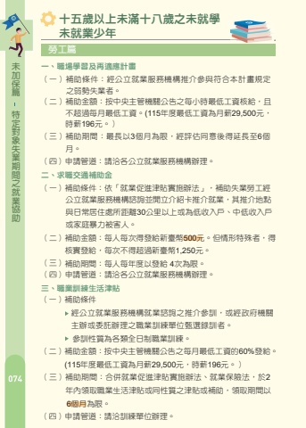 %u7bc7%u4fdd%u52a0%u672a%u52a9%u5354%u696d%u5c31%u4e4b%u9593%u671f%u696d%u5931%u8c61%u5c0d%u5b9a%u7279%u4e4b%u5f31%u52e2%u5931%u696d%u8005%u3002%u5341%u4e94%u6b72%u4ee5%u4e0a%u672a%u6eff%u5341%u516b%u6b72%u4e4b%u672a%u5c31%u5b78%u672a%u5c31%u696d%u5c11%u5e74%u52de%u5de5%u7bc7%u4e00%u3001%u8077%u5834%u5b78%u7fd2%u53ca%u518d%u9069%u61c9%u8a08%u756b%uff08%u4e00%uff09%u88dc%u52a9%u689d%u4ef6%uff1a%u7d93%u516c%u7acb%u5c31%u696d%u670d%u52d9%u6a5f%u69cb%u63a8%u4ecb%u53c3%u8207%u7b26%u5408%u672c%u8a08%u756b%u898f%u5b9a%u4e8c%u3001%u6c42%u8077%u4ea4%u901a%u88dc%u52a9%u91d1%uff08%u56db%uff09%u7533%u8acb%u7ba1%u9053%uff1a%u8acb%u6d3d%u5404%u516c%u7acb%u5c31%u696d%u670d%u52d9%u6a5f%u69cb%u8fa6%u7406%u3002%uff08%u4e00%uff09%u88dc%u52a9%u689d%u4ef6%uff1a%u4f9d%u300c%u5c31%u696d%u4fc3%u9032%u6d25%u8cbc%u5be6%u65bd%u8fa6%u6cd5%u300d%uff0c%u88dc%u52a9%u5931%u696d%u52de%u5de5%u7d93%u516c%u7acb%u5c31%u696d%u670d%u52d9%u6a5f%u69cb%u8aee%u8a62%u4e26%u958b%u7acb%u4ecb%u7d39%u5361%u63a8%u4ecb%u5c31%u696d%uff0c%u5176%u63a8%u4ecb%u5730%u9ede%u8207%u65e5%u5e38%u5c45%u4f4f%u8655%u6240%u8ddd%u96e230%u516c%u91cc%u4ee5%u4e0a%u6216%u70ba%u4f4e%u6536%u5165%u6236%u3001%u4e2d%u4f4e%u6536%u5165%u6236%u6216%u5bb6%u5ead%u66b4%u529b%u88ab%u5bb3%u4eba%u3002%uff08%u4e8c%uff09%uff08%u4e8c%uff09%u88dc%u52a9%u91d1%u984d%uff1a%u6309%u4e2d%u592e%u4e3b%u7ba1%u6a5f%u95dc%u516c%u544a%u4e4b%u6bcf%u5c0f%u6642%u6700%u4f4e%u5de5%u8cc7%u6838%u7d66%uff0c%u4e14%u4e0d%u8d85%u904e%u6bcf%u6708%u6700%u4f4e%u5de5%u8cc7%u3002(115%u5e74%u5ea6%u6700%u4f4e%u5de5%u8cc7%u70ba%u6708%u85aa29,500%u5143%uff0c%u6642%u85aa196%u5143%u3002%uff09%uff08%u4e09%uff09%u88dc%u52a9%u671f%u9593%uff1a%u6700%u9577%u4ee53%u500b%u6708%u70ba%u9650%uff0c%u7d93%u8a55%u4f30%u540c%u610f%u5f8c%u5f97%u5ef6%u9577%u81f36%u500b%u6708%u3002%u4e09%u3001%u8077%u696d%u8a13%u7df4%u751f%u6d3b%u6d25%u8cbc%uff08%u4e09%uff09%uff08%u56db%uff09%u88dc%u52a9%u671f%u9593%uff1a%u6bcf%u4eba%u6bcf%u5e74%u5ea6%u4ee5%u767c%u7d66 4%u6b21%u70ba%u9650%u3002%u7533%u8acb%u7ba1%u9053%uff1a%u8acb%u6d3d%u5404%u516c%u7acb%u5c31%u696d%u670d%u52d9%u6a5f%u69cb%u8fa6%u7406%u3002%uff08%u4e00%uff09%u88dc%u52a9%u689d%u4ef6%u7d93%u516c%u7acb%u5c31%u696d%u670d%u52d9%u6a5f%u69cb%u5c31%u696d%u8aee%u8a62%u4e4b%u63a8%u4ecb%u53c3%u8a13%uff0c%u6216%u7d93%u653f%u5e9c%u6a5f%u95dc %u4e3b%u8fa6%u6216%u59d4%u8a17%u8fa6%u7406%u4e4b%u8077%u696d%u8a13%u7df4%u55ae%u4f4d%u7504%u9078%u9304%u8a13%u8005%u3002%u53c3%u8a13%u6027%u8cea%u70ba%u5404%u985e%u5168%u65e5%u5236%u8077%u696d%u8a13%u7df4%u3002%uff08%u4e09%uff09%u88dc%u52a9%u671f%u9593%uff1a%u5408%u4f75%u5c31%u696d%u4fc3%u9032%u6d25%u8cbc%u5be6%u65bd%u8fa6%u6cd5%u3001%u5c31%u696d%u4fdd%u96aa%u6cd5%uff0c%u65bc2%u5e74%u5167%u9818%u53d6%u8077%u696d%u751f%u6d3b%u6d25%u8cbc%u6216%u540c%u6027%u8cea%u4e4b%u6d25%u8cbc%u6216%u88dc%u52a9%uff0c%u9818%u53d6%u671f%u9593%u4ee5%uff08%u4e8c%uff09%u88dc%u52a9%u91d1%u984d%uff1a%u6309%u4e2d%u592e%u4e3b%u7ba1%u6a5f%u95dc%u516c%u544a%u4e4b%u6bcf%u6708%u6700%u4f4e%u5de5%u8cc7%u768460%%u767c%u7d66%u3002%u3000%u3000%u3000(115%u5e74%u5ea6%u6700%u4f4e%u5de5%u8cc7%u70ba%u6708%u85aa29,500%u5143%uff0c%u6642%u85aa196%u5143%u3002%uff096%u500b%u6708%u70ba%u9650%u3002%uff08%u56db%uff09%u7533%u8acb%u7ba1%u9053%uff1a%u8acb%u6d3d%u8a13%u7df4%u55ae%u4f4d%u8fa6%u7406%u3002%u88dc%u52a9%u91d1%u984d%uff1a%u6bcf%u4eba%u6bcf%u6b21%u5f97%u767c%u7d66%u65b0%u81fa%u5e63500%u5143%u3002%u4f46%u60c5%u5f62%u7279%u6b8a%u8005%uff0c%u5f97%u6838%u5be6%u767c%u7d66%uff0c%u6bcf%u6b21%u4e0d%u5f97%u8d85%u904e%u65b0%u81fa%u5e631,250%u5143%u3002%u7bc7%u4fdd%u52a0%u672a%u52a9%u5354%u696d%u5c31%u4e4b%u9593%u671f%u696d%u5931%u8c61%u5c0d%u5b9a%u7279%u65bc%u6c42%u8077%u767b%u8a18%u65e5%u8d7714%u65e5%u5167%u672a%u80fd%u63a8%u4ecb%u5c31%u696d%u3002%u56db%u3001%u81e8%u6642%u5de5%u4f5c%u6d25%u8cbc%uff08%u4e00%uff09%uff08%u4e8c%uff09%u88dc%u52a9%u91d1%u984d%uff1a%u6309%u4e2d%u592e%u4e3b%u7ba1%u6a5f%u95dc%u516c%u544a%u4e4b%u6bcf%u5c0f%u6642%u6700%u4f4e%u5de5%u8cc7%u6838%u7d66%uff0c%u4e14%u3000%u3000%u30001%u500b%u6708%u5408%u8a08%u4e0d%u8d85%u904e%u6708%u6700%u4f4e%u5de5%u8cc7%u3002(115%u5e74%u5ea6%u6700%u4f4e%u5de5%u8cc7%u70ba%u6708%u85aa%u3000%u3000%u300029,500%u5143%uff0c%u6642%u85aa196%u5143%u3002%uff09%uff08%u4e09%uff09%u88dc%u52a9%u671f%u9593%uff1a%u6700%u95776%u500b%u6708%u3002%u88dc%u52a9%u689d%u4ef6%uff1a%u7d93%u5c31%u696d%u8aee%u8a62%u4e26%u63a8%u4ecb%u5c31%u696d%u6709%u4e0b%u5217%u60c5%u5f62%u4e4b%u4e00%u8005%uff0c%u516c%u7acb%u5c31%u696d%u670d%u52d9%u6a5f%u69cb%u5f97%u6307%u6d3e%u7533%u8acb%u4eba%u81f3%u653f%u5e9c%u6a5f%u95dc(%u69cb)%u6216%u5408%u6cd5%u7acb%u6848%u4e4b%u975e%u71df%u5229%u5718%u9ad4%u5f9e%u4e8b%u81e8 %u6642%u6027%u5de5%u4f5c%u3002%u6709%u6b63%u7576%u7406%u7531%u7121%u6cd5%u63a5%u53d7%u63a8%u4ecb%u5de5%u4f5c%u6307%u5de5%u4f5c%u5831%u916c%u672a%u9054%u539f%u6295%u4fdd%u85aa%u8cc760%%uff0c%u6216%u5de5%u4f5c%u5730%u9ede%u8ddd%u96e2%u65e5%u5e38%u5c45%u4f4f%u8655%u624030%u516c%u91cc%u4ee5%u4e0a%u8005%u3002%u4e94%u3001%u591a%u5143%u5c31%u696d%u958b%u767c%u65b9%u6848%u516d%u3001%u88dc%u52a9%u6280%u8853%u58eb%u6280%u80fd%u6aa2%u5b9a%u5831%u540d%u8cbb%u53ca%u8b49%u7167%u8cbb%u7528%uff08%u4e8c%uff09%u88dc%u52a9%u91d1%u984d%uff1a%u4f9d%u5de5%u4f5c%u6027%u8cea%u53ca%u5404%u8077%u52d9%u5de5%u4f5c%u9700%u6c42%uff0c%u6309%u4e2d%u592e%u4e3b%u7ba1%u6a5f%u95dc%u3000%u3000%u3000%u516c%u544a%u4e4b%u6bcf%u5c0f%u6642%u6700%u4f4e%u5de5%u8cc7%u6838%u7d66%uff0c%u4e14%u4e0d%u8d85%u904e%u6bcf%u6708%u6700%u4f4e%u5de5%u8cc7%u3002%u3000%u3000%u3000(115%u5e74%u5ea6%u6700%u4f4e%u5de5%u8cc7%u70ba%u6708%u85aa29,500%u5143%uff0c%u6642%u85aa196%u5143%u3002%uff09%uff08%u4e00%uff09%u88dc%u52a9%u689d%u4ef6%uff1a%u7d93%u516c%u7acb%u5c31%u696d%u670d%u52d9%u6a5f%u69cb%u5c31%u696d%u8aee%u8a62%u5b89%u6392%u5f8c%uff0c%u88ab%u63a8%u4ecb%u53c3%u8207%u591a%u5143%u5c31%u696d%u958b%u767c%u65b9%u6848%u8a08%u756b%u7684%u975e%u81ea%u9858%u6027%u5931%u696d%u8005%u3001%u5f31%u52e2%u65cf%u7fa4%u53ca%u5176%u4ed6%u7d93%u672c%u90e8%u6307%u5b9a%u4e4b%u5c0d%u8c61%u70ba%u9650%u3002%uff08%u4e09%uff09%u88dc%u52a9%u671f%u9593%uff1a%u6700%u9577