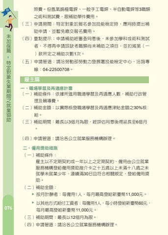 %u7bc7%u4fdd%u52a0%u672a%u52a9%u5354%u696d%u5c31%u4e4b%u9593%u671f%u696d%u5931%u8c61%u5c0d%u5b9a%u7279%u96c7%u4e3b%u7bc7%u4e00%u3001%u8077%u5834%u5b78%u7fd2%u53ca%u518d%u9069%u61c9%u8a08%u756b%uff08%u4e09%uff09%u7533%u8acb%u671f%u9593%uff1a%u7279%u5b9a%u5c0d%u8c61%u65bc%u5831%u540d%u53c3%u52a0%u6280%u80fd%u6aa2%u5b9a%u6642%uff0c%u61c9%u540c%u6642%u63d0%u51fa%u88dc%u52a9%u7533%u8acb%uff0c%u4e26%u66ab%u514d%u7e73%u4ea4%u5831%u540d%u8cbb%u7528%u3002%uff08%u56db%uff09%u91cd%u9ede%u63d0%u793a%uff1a%u7533%u8acb%u88dc%u52a9%u7d93%u5be9%u67e5%u540c%u610f%u5f8c%uff0c%u672a%u53c3%u52a0%u5b78%u79d1%u6216%u8853%u79d1%u6e2c%u8a66%u8005%uff0c%u4e0d%u5f97%u518d%u7533%u8acb%u8a72%u7f3a%u8003%u8077%u985e%u5c1a%u672a%u88dc%u52a9%u4e4b%u9805%u76ee%uff0c%u4e26%u6263%u6e1b%u7b2c%uff08%u4e00%uff09%u6b3e%u6240%u5b9a%u4e4b%u88dc%u52a9%u6b21%u65781%u6b21%u3002%uff08%u4e94%uff09%u7533%u8acb%u7ba1%u9053%uff1a%u8acb%u6d3d%u52de%u52d5%u90e8%u52de%u52d5%u529b%u767c%u5c55%u7f72%u6280%u80fd%u6aa2%u5b9a%u4e2d%u5fc3%uff0c%u6d3d%u8a62%u5c08%u7dda%uff1a04-22500708%u3002%u4e8c%u3001%u50f1%u7528%u734e%u52a9%u63aa%u65bd%uff08%u4e00%uff09%u88dc%u52a9%u689d%u4ef6%uff1a%u3000%u3000%u3000%u96c7%u4e3b%u4ee5%u4e0d%u5b9a%u671f%u5951%u7d04%u6216%u4e00%u5e74%u4ee5%u4e0a%u4e4b%u5b9a%u671f%u5951%u7d04%uff0c%u50f1%u7528%u7531%u516c%u7acb%u5c31%u696d%u3000%u3000%u3000%u670d%u52d9%u6a5f%u69cb%u767c%u7d66%u50f1%u7528%u734e%u52a9%u63a8%u4ecb%u5361%u4e4b%u5341%u4e94%u6b72%u4ee5%u4e0a%u672a%u6eff%u5341%u516b%u6b72%u4e4b%u672a%u3000%u3000%u3000%u5c31%u5b78%u672a%u5c31%u696d%u5c11%u5e74%uff0c%u9023%u7e8c%u6eff30%u65e5%u4e14%u7b26%u5408%u76f8%u95dc%u898f%u5b9a%uff0c%u767c%u7d66%u50f1%u7528%u734e%u3000%u3000%u3000%u52a9%u3002%uff08%u4e00%uff09%u88dc%u52a9%u689d%u4ef6%uff1a%u4f9d%u64da%u6240%u9032%u7528%u8077%u5834%u5b78%u7fd2%u53ca%u518d%u9069%u61c9%u4eba%u6578%uff0c%u88dc%u52a9%u884c%u653f%u7ba1%u7406%u53ca%u8f14%u5c0e%u8cbb%u3002%uff08%u4e8c%uff09%u88dc%u52a9%u91d1%u984d%uff1a%u4ee5%u5be6%u969b%u6838%u767c%u8077%u5834%u5b78%u7fd2%u53ca%u518d%u9069%u61c9%u6d25%u8cbc%u91d1%u984d%u4e4b30%%u6838%u7d66%u3002%uff08%u4e09%uff09%u88dc%u52a9%u671f%u9593%uff1a%u6700%u9577%u4ee53%u500b%u6708%u70ba%u9650%uff0c%u7d93%u8a55%u4f30%u540c%u610f%u5f8c%u5f97%u5ef6%u9577%u81f36%u500b%u6708%u3002%uff08%u4e8c%uff09%u88dc%u52a9%u91d1%u984d%uff1a%u6309%u6708%u8a08%u916c%u8005%uff1a%u6bcf%u50f1%u75281%u4eba%uff0c%u6bcf%u6708%u6700%u9ad8%u767c%u7d66%u65b0%u81fa%u5e6311,000%u5143%u3002%u4ee5%u5176%u4ed6%u65b9%u5f0f%u7d66%u4ed8%u5de5%u8cc7%u8005%uff1a%u6bcf%u50f1%u75281%u4eba%uff0c%u6bcf%u5c0f%u6642%u767c%u7d66%u65b0%u81fa%u5e6360%u5143%uff0c%u6bcf%u6708%u6700%u9ad8%u767c%u7d66%u65b0%u81fa%u5e6311,000%u5143%u3002%uff08%u4e09%uff09%u88dc%u52a9%u671f%u9593%uff1a%u6700%u9577%u4ee512%u500b%u6708%u70ba%u9650%u3002%uff08%u56db%uff09%u7533%u8acb%u7ba1%u9053%uff1a%u8acb%u6d3d%u5404%u516c%u7acb%u5c31%u696d%u670d%u52d9%u6a5f%u69cb%u8fa6%u7406%u3002%uff08%u56db%uff09%u7533%u8acb%u7ba1%u9053%uff1a%u8acb%u6d3d%u5404%u516c%u7acb%u5c31%u696d%u670d%u52d9%u6a5f%u69cb%u8fa6%u7406%u3002%u4e4b%u8853%u79d1%u6e2c%u8a66%u8cbb%uff0c%u9650%u88dc%u52a9%u55ae%u4ef6%u8cbb%u7528%u3002%u7167%u8cbb%u3002%u4f46%u6c2c%u6c23%u93a2%u6975%u96fb%u92b2%u3001%u4e00%u822c%u624b%u5de5%u96fb%u92b2%u3001%u534a%u81ea%u52d5%u96fb%u92b2%u7b493%u8077%u985e%u7bc7%u4fdd%u52a0%u672a%u52a9%u5354%u696d%u5c31%u4e4b%u9593%u671f%u696d%u5931%u8c61%u5c0d%u5b9a %u52de%u5de5%u7bc7 %u7279%u4e00%u3001%u8077%u5834%u5b78%u7fd2%u53ca%u518d%u9069%u61c9%u8a08%u756b%u8077%u696d%u707d%u5bb3%u5931%u80fd%u52de%u5de5%u9069%u7528%u5c0d%u8c61%uff1a%u8077%u696d%u707d%u5bb3%u5931%u80fd%u52de%u5de5%u6aa2%u9644%u8cc7%u6599%uff1a%u52de%u52d5%u90e8%u52de%u5de5%u4fdd%u96aa%u5c40%u8077%u696d%u707d%u5bb3%u5931%u80fd%u7d66%u4ed8%u6838%u5b9a%u516c%u6587%u53ca%u8eab%u5206%u8b49%u660e%u6587%u4ef6%u3002%uff08%u4e00%uff09%u88dc%u52a9%u689d%u4ef6%uff1a%u7d93%u516c%u7acb%u5c31%u696d%u670d%u52d9%u6a5f%u69cb%u63a8%u4ecb%u53c3%u8207%u7b26%u5408%u672c%u8a08%u756b%u898f%u5b9a%u4e4b%u5f31%u52e2%u5931%u696d%u8005%u3002%uff08%u4e8c%uff09%u88dc%u52a9%u91d1%u984d%uff1a%u6309%u4e2d%u592e%u4e3b%u7ba1%u6a5f%u95dc%u516c%u544a%u4e4b%u6bcf%u5c0f%u6642%u6700%u4f4e%u5de5%u8cc7%u6838%u7d66%uff0c%u3000%u3000%u3000%u4e0d%u8d85%u904e%u6bcf%u6708%u6700%u4f4e%u5de5%u8cc7%u3002%u3000%u3000%u3000(115%u5e74%u5ea6%u6700%u4f4e%u5de5%u8cc7%u70ba%u6708%u85aa29,500%u5143%uff0c%u6642%u85aa196%u5143%u3002)%uff08%u4e09%uff09%u88dc%u52a9%u671f%u9593%uff1a%u6700%u9577%u4ee53%u500b%u6708%u70ba%u9650%u3002%uff08%u56db%uff09%u7533%u8acb%u7ba1%u9053%uff1a%u8acb%u6d3d%u5404%u516c%u7acb%u5c31%u696d%u670d%u52d9%u6a5f%u69cb%u8fa6%u7406%u3002%u4e8c%u3001%u6c42%u8077%u4ea4%u901a%u88dc%u52a9%uff08%u4e00%uff09%u88dc%u52a9%u689d%u4ef6%uff1a%u4f9d%u300c%u5c31%u696d%u4fc3%u9032%u6d25%u8cbc%u5be6%u65bd%u8fa6%u6cd5%u300d%uff0c%u88dc%u52a9%u5931%u696d%u52de%u5de5%u7d93%u516c%u7acb%u5c31%u696d%u670d%u52d9%u6a5f%u69cb%u8aee%u8a62%u4e26%u958b%u7acb%u4ecb%u7d39%u5361%u63a8%u4ecb%u5c31%u696d%uff0c%u5176%u63a8%u4ecb%u5730%u9ede%u8207%u65e5%u5e38%u5c45%u4f4f%u8655%u6240%u8ddd%u96e230%u516c%u91cc%u4ee5%u4e0a%u6216%u70ba%u4f4e%u6536%u5165%u6236%u3001%u4e2d%u4f4e%u6536%u5165%u6236%u6216%u5bb6%u5ead%u66b4%u529b%u88ab%u5bb3%u4eba%u3002%uff08%u4e8c%uff09%u88dc%u52a9%u91d1%u984d%uff1a%u6bcf%u4eba%u6bcf%u6b21%u5f97%u767c%u7d66%u65b0%u81fa%u5e63500%u5143%u3002%u4f46%u60c5%u5f62%u7279%u6b8a%u8005%uff0c%u5f97%u6838%u5be6%u767c%u7d66%uff0c%u6bcf%u6b21%u4e0d%u5f97%u8d85%u904e%u65b0%u81fa%u5e631,250%u5143%u3002%uff08%u4e09%uff09%u88dc%u52a9%u671f%u9593%uff1a%u6bcf%u4eba%u6bcf%u5e74%u5ea6%u4ee5%u767c%u7d664%u6b21%u70ba%u9650%u3002%uff08%u56db%uff09%u7533%u8acb%u7ba1%u9053%uff1a%u8acb%u6d3d%u5404%u516c%u7acb%u5c31%u696d%u670d%u52d9%u6a5f%u69cb%u8fa6%u7406%u3002%u4e09%u3001%u8077%u696d%u8a13%u7df4%u751f%u6d3b%u6d25%u8cbc%uff08%u4e00%uff09%u88dc%u52a9%u689d%u4ef6%u7d93%u516c%u7acb%u5c31%u696d%u670d%u52d9%u6a5f%u69cb%u5c31%u696d%u8aee%u8a62%u4e4b%u63a8%u4ecb%u53c3%u8a13%uff0c%u6216%u7d93%u653f%u5e9c%u6a5f%u95dc%u4e3b%u8fa6%u6216%u59d4%u8a17