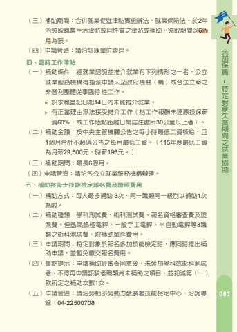 %u7bc7%u4fdd%u52a0%u672a%u52a9%u5354%u696d%u5c31%u4e4b%u9593%u671f%u696d%u5931%u8c61%u5c0d%u5b9a%u7279%u52de%u5de5%u7bc7%u4e00%u3001%u8077%u5834%u5b78%u7fd2%u518d%u9069%u61c9%u8a08%u756b%uff08%u4e00%uff09%u88dc%u52a9%u689d%u4ef6%uff1a%u7d93%u516c%u7acb%u5c31%u696d%u670d%u52d9%u6a5f%u69cb%u63a8%u4ecb%u53c3%u8207%u7b26%u5408%u672c%u8a08%u756b%u898f%u5b9a%u4e4b%u5f31%u52e2%u5931%u696d%u8005%u3002%uff08%u4e8c%uff09%u88dc%u52a9%u91d1%u984d%uff1a%u6309%u4e2d%u592e%u4e3b%u7ba1%u6a5f%u95dc%u516c%u544a%u4e4b%u6bcf%u5c0f%u6642%u6700%u4f4e%u5de5%u8cc7%u6838%u7d66%uff0c%u4e14%u4e0d%u8d85%u904e%u6bcf%u6708%u6700%u4f4e%u5de5%u8cc7%u3002%uff08115%u5e74%u5ea6%u6700%u4f4e%u5de5%u8cc7%u70ba%u6708%u85aa29,500%u5143%uff0c%u6642%u85aa196%u5143%u3002%uff09%uff08%u4e09%uff09%u88dc%u52a9%u671f%u9593%uff1a%u6700%u9577%u4ee53%u500b%u6708%u70ba%u9650%u3002%uff08%u56db%uff09%u7533%u8acb%u7ba1%u9053%uff1a%u8acb%u6d3d%u5404%u516c%u7acb%u5c31%u696d%u670d%u52d9%u6a5f%u69cb%u8fa6%u7406%u3002%u4e8c%u3001%u6c42%u8077%u4ea4%u901a%u88dc%u52a9%u91d1%uff08%u4e00%uff09%u88dc%u52a9%u689d%u4ef6%uff1a%u4f9d%u300c%u5c31%u696d%u4fc3%u9032%u6d25%u8cbc%u5be6%u65bd%u8fa6%u6cd5%u300d%uff0c%u88dc%u52a9%u5931%u696d%u52de%u5de5%u7d93%u516c%u7acb%u5c31%u696d%u670d%u52d9%u6a5f%u69cb%u8aee%u8a62%u4e26%u958b%u7acb%u4ecb%u7d39%u5361%u63a8%u4ecb%u5c31%u696d%uff0c%u5176%u63a8%u4ecb%u5730%u9ede%u8207%u65e5%u5e38%u5c45%u4f4f%u8655%u6240%u8ddd%u96e230%u516c%u91cc%u4ee5%u4e0a%u6216%u70ba%u4f4e%u6536%u5165%u6236%u3001%u4e2d%u4f4e%u6536%u5165%u6236%u6216%u5bb6%u5ead%u66b4%u529b%u88ab%u5bb3%u4eba%u3002%uff08%u4e8c%uff09%u88dc%u52a9%u91d1%u984d%uff1a%u6bcf%u4eba%u6bcf%u6b21%u5f97%u767c%u7d66500%u5143%u3002%u4f46%u60c5%u5f62%u7279%u6b8a%u8005%uff0c%u5f97%u6838%u5be6%u767c%u7d66%uff0c%u6bcf%u6b21%u4e0d%u5f97%u8d85%u904e1,250%u5143%u3002%uff08%u56db%uff09%u7533%u8acb%u7ba1%u9053%uff1a%u8acb%u6d3d%u5404%u516c%u7acb%u5c31%u696d%u670d%u52d9%u6a5f%u69cb%u8fa6%u7406%u3002%uff08%u4e09%uff09%u88dc%u52a9%u671f%u9593%uff1a%u6bcf%u4eba%u6bcf%u5e74%u5ea6%u4ee5%u767c%u7d664%u6b21%u70ba%u9650%u3002%u9069%u7528%u5c0d%u8c61%uff1a%u76f4%u8f44%u5e02%u3001%u7e23%uff08%u5e02%uff09%u653f%u5e9c%u5217%u518a%u8f14%u5c0e%u4e4b%u8857%u53cb%u3002%u76f4%u8f44%u5e02%u3001%u7e23%uff08%u5e02%uff09%u653f%u5e9c%u5217%u518a%u8f14%u5c0e%u4e4b%u8857%u53cb%u4e09%u3001%u8077%u696d%u8a13%u7df4%u751f%u6d3b%u6d25%u8cbc%uff08%u4e00%uff09%u88dc%u52a9%u689d%u4ef6%u7d93%u516c%u7acb%u5c31%u696d%u670d%u52d9%u6a5f%u69cb%u5c31%u696d%u8aee%u8a62%u4e4b%u63a8%u4ecb%u53c3%u8a13%uff0c%u6216%u7d93%u653f%u5e9c%u6a5f%u95dc %u4e3b%u8fa6%u6216%u59d4%u8a17%u8fa6%u7406%u4e4b%u8077%u696d%u8a13%u7df4%u55ae%u4f4d%u7504%u9078%u9304%u8a13%u8005%u3002%u53c3%u8a13%u6027%u8cea%u70ba%u5404%u985e%u5168%u65e5%u5236%u8077%u696d%u8a13%u7df4%u3002%uff08%u4e8c%uff09%u88dc%u52a9%u91d1%u984d%uff1a%u6309%u4e2d%u592e%u4e3b%u7ba1%u6a5f%u95dc%u516c%u544a%u4e4b%u6bcf%u6708%u6700%u4f4e%u5de5%u8cc7%u768460%%u767c%u7d66%u3002%u3000%u3000%u3000%uff08115%u5e74%u5ea6%u6700%u4f4e%u5de5%u8cc7%u70ba%u6708%u85aa29,500%u5143%uff0c%u6642%u85aa196%u5143%u3002%uff09%u7bc7%u4fdd%u52a0%u672a%u52a9%u5354%u696d%u5c31%u4e4b%u9593%u671f%u696d%u5931%u8c61%u5c0d%u5b9a%u7279%uff08%u4e09%uff09%u88dc%u52a9%u671f%u9593%uff1a%u5408%u4f75%u5c31%u696d%u4fc3%u9032%u6d25%u8cbc%u5be6%u65bd%u8fa6%u6cd5%u3001%u5c31%u696d%u4fdd%u96aa%u6cd5%uff0c%u65bc2%u5e74%u5167%u9818%u53d6%u8077%u696d%u751f%u6d3b%u6d25%u8cbc%u6216%u540c%u6027%u8cea%u4e4b%u6d25%u8cbc%u6216%u88dc%u52a9%uff0c%u9818%u53d6%u671f%u9593%u4ee56%u500b%u6708%u70ba%u9650%u3002%uff08%u56db%uff09%u7533%u8acb%u7ba1%u9053%uff1a%u8acb%u6d3d%u8a13%u7df4%u55ae%u4f4d%u8fa6%u7406%u3002%u56db%u3001%u81e8%u6642%u5de5%u4f5c%u6d25%u8cbc%uff08%u4e00%uff09%u88dc%u52a9%u689d%u4ef6%uff1a%u7d93%u5c31%u696d%u8aee%u8a62%u4e26%u63a8%u4ecb%u5c31%u696d%u6709%u4e0b%u5217%u60c5%u5f62%u4e4b%u4e00%u8005%uff0c%u516c%u7acb%u5c31%u696d%u670d%u52d9%u6a5f%u69cb%u5f97%u6307%u6d3e%u7533%u8acb%u4eba%u81f3%u653f%u5e9c%u6a5f%u95dc%uff08%u69cb%uff09%u6216%u5408%u6cd5%u7acb%u6848%u4e4b%u975e%u71df%u5229%u5718%u9ad4%u5f9e%u4e8b%u81e8%u6642 %u6027%u5de5%u4f5c%u3002%uff08%u4e00%uff09%u88dc%u52a9%u65b9%u5f0f%uff1a%u6bcf%u4eba%u6700%u591a%u88dc%u52a9 3%u6b21%uff0c%u540c%u4e00%u8077%u985e%u540c%u4e00%u7d1a%u5225%u4ee5%u88dc%u52a91%u6b21%u70ba%u9650%u3002%uff08%u4e8c%uff09%u88dc%u52a9%u7a2e%u985e%uff1a%u5b78%u79d1%u6e2c%u8a66%u8cbb%u3001%u8853%u79d1%u6e2c%u8a66%u8cbb%u3001%u5831%u540d%u8cc7%u683c%u5be9%u67e5%u8cbb%u53ca%u8b49%u7167%u8cbb%u3002%u4f46%u6c2c%u6c23%u93a2%u6975%u96fb%u92b2%u3001%u4e00%u822c%u624b%u5de5%u96fb%u92b2%u3001%u534a%u81ea%u52d5%u96fb%u92b2%u7b493%u8077%u985e%u4e4b%u8853%u79d1%u6e2c%u8a66%u8cbb%uff0c%u9650%u88dc%u52a9%u55ae%u4ef6%u8cbb%u7528%u3002%uff08%u4e09%uff09%u7533%u8acb%u671f%u9593%uff1a%u7279%u5b9a%u5c0d%u8c61%u65bc%u5831%u540d%u53c3%u52a0%u6280%u80fd%u6aa2%u5b9a%u6642%uff0c%u61c9%u540c%u6642%u63d0%u51fa%u88dc%u52a9%u7533%u8acb%uff0c%u4e26%u66ab%u514d%u7e73%u4ea4%u5831%u540d%u8cbb%u7528%u3002%uff08%u56db%uff09%u91cd%u9ede%u63d0%u793a%uff1a%u7533%u8acb%u88dc%u52a9%u7d93%u5be9%u67e5%u540c%u610f%u5f8c%uff0c%u672a%u53c3%u52a0%u5b78%u79d1%u6216%u8853%u79d1%u6e2c%u8a66%u8005%uff0c%u4e0d%u5f97%u518d%u7533%u8acb%u8a72%u7f3a%u8003%u8077%u985e%u5c1a%u672a%u88dc%u52a9%u4e4b%u9805%u76ee%uff0c%u4e26%u6263%u6e1b%u7b2c%uff08%u4e00%uff09%u6b3e%u6240%u5b9a%u4e4b%u88dc%u52a9%u6b21%u65781%u6b21%u3002%uff08%u4e94%uff09%u7533%u8acb%u7ba1%u9053%uff1a%u8acb%u6d3d%u52de%u52d5%u90e8%u52de%u52d5%u529b%u767c%u5c55%u7f72%u6280%u80fd%u6aa2%u5b9a%u4e2d%u5fc3%uff0c%u6d3d%u8a62%u5c08%u7dda%uff1a04-22500708 %u65bc%u6c42%u8077%u767b%u8a18%u65e5%u8d7714%u65e5%u5167%u672a%u80fd%u63a8%u4ecb%u5c31%u696d%u3002 %u6709%u6b63%u7576%u7406%u7531%u7121%u6cd5%u63a5%u53d7%u63a8%u4ecb%u5de5%u4f5c%uff08%u6307%u5de5%u4f5c%u5831%u916c%u672a%u9054%u539f%u6295%u4fdd%u85aa%u8cc760%%uff0c%u6216%u5de5%u4f5c%u5730%u9ede%u8ddd%u96e2%u65e5%u5e38%u5c45%u4f4f%u8655%u624030%u516c%u91cc%u4ee5%u4e0a%u8005%uff09%u3002%uff08%u4e8c%uff09%u88dc%u52a9%u91d1%u984d%uff1a%u6309%u4e2d%u592e%u4e3b%u7b