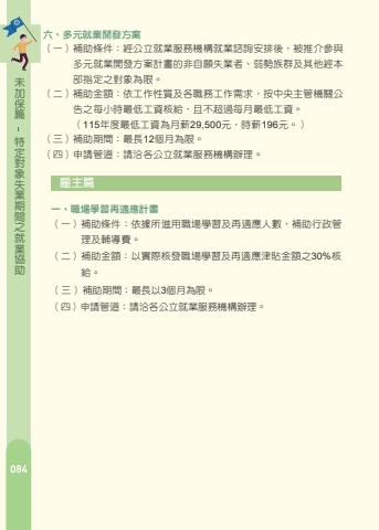 %u7bc7%u4fdd%u52a0%u672a%u52a9%u5354%u696d%u5c31%u4e4b%u9593%u671f%u696d%u5931%u8c61%u5c0d%u5b9a%u7279%u516d%u3001%u591a%u5143%u5c31%u696d%u958b%u767c%u65b9%u6848%uff08%u4e00%uff09%u88dc%u52a9%u689d%u4ef6%uff1a%u7d93%u516c%u7acb%u5c31%u696d%u670d%u52d9%u6a5f%u69cb%u5c31%u696d%u8aee%u8a62%u5b89%u6392%u5f8c%uff0c%u88ab%u63a8%u4ecb%u53c3%u8207%u3000%u3000%u3000%u591a%u5143%u5c31%u696d%u958b%u767c%u65b9%u6848%u8a08%u756b%u7684%u975e%u81ea%u9858%u5931%u696d%u8005%u3001%u5f31%u52e2%u65cf%u7fa4%u53ca%u5176%u4ed6%u7d93%u672c%u3000%u3000%u3000%u90e8%u6307%u5b9a%u4e4b%u5c0d%u8c61%u70ba%u9650%u3002%uff08%u4e8c%uff09%u88dc%u52a9%u91d1%u984d%uff1a%u4f9d%u5de5%u4f5c%u6027%u8cea%u53ca%u5404%u8077%u52d9%u5de5%u4f5c%u9700%u6c42%uff0c%u6309%u4e2d%u592e%u4e3b%u7ba1%u6a5f%u95dc%u516c%u3000%u3000%u3000%u544a%u4e4b%u6bcf%u5c0f%u6642%u6700%u4f4e%u5de5%u8cc7%u6838%u7d66%uff0c%u4e14%u4e0d%u8d85%u904e%u6bcf%u6708%u6700%u4f4e%u5de5%u8cc7%u3002%u3000%u3000%u3000%uff08115%u5e74%u5ea6%u6700%u4f4e%u5de5%u8cc7%u70ba%u6708%u85aa29,500%u5143%uff0c%u6642%u85aa196%u5143%u3002%uff09%uff08%u4e09%uff09%u88dc%u52a9%u671f%u9593%uff1a%u6700%u957712%u500b%u6708%u70ba%u9650%u3002%uff08%u56db%uff09%u7533%u8acb%u7ba1%u9053%uff1a%u8acb%u6d3d%u5404%u516c%u7acb%u5c31%u696d%u670d%u52d9%u6a5f%u69cb%u8fa6%u7406%u3002%u96c7%u4e3b%u7bc7%u4e00%u3001%u8077%u5834%u5b78%u7fd2%u518d%u9069%u61c9%u8a08%u756b%uff08%u4e00%uff09%u88dc%u52a9%u689d%u4ef6%uff1a%u4f9d%u64da%u6240%u9032%u7528%u8077%u5834%u5b78%u7fd2%u53ca%u518d%u9069%u61c9%u4eba%u6578%uff0c%u88dc%u52a9%u884c%u653f%u7ba1%u7406%u53ca%u8f14%u5c0e%u8cbb%u3002%uff08%u4e8c%uff09%u88dc%u52a9%u91d1%u984d%uff1a%u4ee5%u5be6%u969b%u6838%u767c%u8077%u5834%u5b78%u7fd2%u53ca%u518d%u9069%u61c9%u6d25%u8cbc%u91d1%u984d%u4e4b30%%u6838%u7d66%u3002%uff08%u4e09%uff09%u88dc%u52a9%u671f%u9593%uff1a%u6700%u9577%u4ee53%u500b%u6708%u70ba%u9650%u3002%uff08%u56db%uff09%u7533%u8acb%u7ba1%u9053%uff1a%u8acb%u6d3d%u5404%u516c%u7acb%u5c31%u696d%u670d%u52d9%u6a5f%u69cb%u8fa6%u7406%u3002%u7bc7%u4fdd%u52a0%u672a%u52a9%u5354%u696d%u5c31%u4e4b%u9593%u671f%u696d%u5931%u8c61%u5c0d%u5b9a%u7279%u4e8c%u3001%u50f1%u7528%u734e%u52a9%u63aa%u65bd%uff08%u4e00%uff09%u88dc%u52a9%u689d%u4ef6%uff1a%u96c7%u4e3b%u4ee5%u4e0d%u5b9a%u671f%u5951%u7d04%u62161%u5e74%u4ee5%u4e0a%u4e4b%u5b9a%u671f%u5951%u7d04%uff0c%u50f1%u7528%u7531%u516c%u7acb%u5c31%u696d%u670d%u52d9%u6a5f%u69cb%u767c%u7d66%u50f1%u7528%u734e%u52a9%u63a8%u4ecb%u5361%u4e4b%u76f4%u8f44%u5e02%u3001%u7e23%uff08%u5e02%uff09%u653f%u5e9c%u5217%u518a%u8f14%u5c0e%u4e4b%u8857%u53cb%uff0c%u9023%u7e8c%u6eff30%u65e5%u4e14%u7b26%u5408%u76f8%u95dc%u898f%u5b9a%uff0c%u767c%u7d66%u50f1%u7528%u734e%u52a9%u3002 %uff08%u4e8c%uff09%u88dc%u52a9%u91d1%u984d%uff1a%uff08%u4e09%uff09%u88dc%u52a9%u671f%u9593%uff1a%u6700%u9577%u4ee512%u500b%u6708%u70ba%u9650%u3002%uff08%u56db%uff09%u7533%u8acb%u7ba1%u9053%uff1a%u8acb%u6d3d%u5404%u516c%u7acb%u5c31%u696d%u670d%u52d9%u6a5f%u69cb%u8fa6%u7406%u3002%u6309%u6708%u8a08%u916c%u8005%uff1a%u6bcf%u50f1%u75281%u4eba%uff0c%u6bcf%u6708%u6700%u9ad8%u767c%u7d6611,000%u5143%u3002%u4ee5%u5176%u4ed6%u65b9%u5f0f%u7d66%u4ed8%u5de5%u8cc7%u8005%uff1a%u6bcf%u50f1%u75281%u4eba%uff0c%u6bcf%u5c0f%u6642%u767c%u7d6660%u5143%uff0c%u6bcf%u6708%u6700%u9ad8%u767c%u7d66%u65b0%u81fa%u5e6311,000%u5143%u3002 085