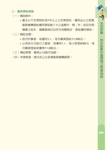 %u7bc7%u4fdd%u52a0%u672a%u52a9%u5354%u696d%u5c31%u4e4b%u9593%u671f%u696d%u5931%u8c61%u5c0d%u5b9a%u7279%u516d%u3001%u591a%u5143%u5c31%u696d%u958b%u767c%u65b9%u6848%uff08%u4e00%uff09%u88dc%u52a9%u689d%u4ef6%uff1a%u7d93%u516c%u7acb%u5c31%u696d%u670d%u52d9%u6a5f%u69cb%u5c31%u696d%u8aee%u8a62%u5b89%u6392%u5f8c%uff0c%u88ab%u63a8%u4ecb%u53c3%u8207%u3000%u3000%u3000%u591a%u5143%u5c31%u696d%u958b%u767c%u65b9%u6848%u8a08%u756b%u7684%u975e%u81ea%u9858%u5931%u696d%u8005%u3001%u5f31%u52e2%u65cf%u7fa4%u53ca%u5176%u4ed6%u7d93%u672c%u3000%u3000%u3000%u90e8%u6307%u5b9a%u4e4b%u5c0d%u8c61%u70ba%u9650%u3002%uff08%u4e8c%uff09%u88dc%u52a9%u91d1%u984d%uff1a%u4f9d%u5de5%u4f5c%u6027%u8cea%u53ca%u5404%u8077%u52d9%u5de5%u4f5c%u9700%u6c42%uff0c%u6309%u4e2d%u592e%u4e3b%u7ba1%u6a5f%u95dc%u516c%u3000%u3000%u3000%u544a%u4e4b%u6bcf%u5c0f%u6642%u6700%u4f4e%u5de5%u8cc7%u6838%u7d66%uff0c%u4e14%u4e0d%u8d85%u904e%u6bcf%u6708%u6700%u4f4e%u5de5%u8cc7%u3002%u3000%u3000%u3000%uff08115%u5e74%u5ea6%u6700%u4f4e%u5de5%u8cc7%u70ba%u6708%u85aa29,500%u5143%uff0c%u6642%u85aa196%u5143%u3002%uff09%uff08%u4e09%uff09%u88dc%u52a9%u671f%u9593%uff1a%u6700%u957712%u500b%u6708%u70ba%u9650%u3002%uff08%u56db%uff09%u7533%u8acb%u7ba1%u9053%uff1a%u8acb%u6d3d%u5404%u516c%u7acb%u5c31%u696d%u670d%u52d9%u6a5f%u69cb%u8fa6%u7406%u3002%u96c7%u4e3b%u7bc7%u4e00%u3001%u8077%u5834%u5b78%u7fd2%u518d%u9069%u61c9%u8a08%u756b%uff08%u4e00%uff09%u88dc%u52a9%u689d%u4ef6%uff1a%u4f9d%u64da%u6240%u9032%u7528%u8077%u5834%u5b78%u7fd2%u53ca%u518d%u9069%u61c9%u4eba%u6578%uff0c%u88dc%u52a9%u884c%u653f%u7ba1%u7406%u53ca%u8f14%u5c0e%u8cbb%u3002%uff08%u4e8c%uff09%u88dc%u52a9%u91d1%u984d%uff1a%u4ee5%u5be6%u969b%u6838%u767c%u8077%u5834%u5b78%u7fd2%u53ca%u518d%u9069%u61c9%u6d25%u8cbc%u91d1%u984d%u4e4b30%%u6838%u7d66%u3002%uff08%u4e09%uff09%u88dc%u52a9%u671f%u9593%uff1a%u6700%u9577%u4ee53%u500b%u6708%u70ba%u9650%u3002%uff08%u56db%uff09%u7533%u8acb%u7ba1%u9053%uff1a%u8acb%u6d3d%u5404%u516c%u7acb%u5c31%u696d%u670d%u52d9%u6a5f%u69cb%u8fa6%u7406%u3002%u7bc7%u4fdd%u52a0%u672a%u52a9%u5354%u696d%u5c31%u4e4b%u9593%u671f%u696d%u5931%u8c61%u5c0d%u5b9a%u7279%u4e8c%u3001%u50f1%u7528%u734e%u52a9%u63aa%u65bd%uff08%u4e00%uff09%u88dc%u52a9%u689d%u4ef6%uff1a%u96c7%u4e3b%u4ee5%u4e0d%u5b9a%u671f%u5951%u7d04%u62161%u5e74%u4ee5%u4e0a%u4e4b%u5b9a%u671f%u5951%u7d04%uff0c%u50f1%u7528%u7531%u516c%u7acb%u5c31%u696d%u670d%u52d9%u6a5f%u69cb%u767c%u7d66%u50f1%u7528%u734e%u52a9%u63a8%u4ecb%u5361%u4e4b%u76f4%u8f44%u5e02%u3001%u7e23%uff08%u5e02%uff09%u653f%u5e9c%u5217%u518a%u8f14%u5c0e%u4e4b%u8857%u53cb%uff0c%u9023%u7e8c%u6eff30%u65e5%u4e14%u7b26%u5408%u76f8%u95dc%u898f%u5b9a%uff0c%u767c%u7d66%u50f1%u7528%u734e%u52a9%u3002 %uff08%u4e8c%uff09%u88dc%u52a9%u91d1%u984d%uff1a%uff08%u4e09%uff09%u88dc%u52a9%u671f%u9593%uff1a%u6700%u9577%u4ee512%u500b%u6708%u70ba%u9650%u3002%uff08%u56db%uff09%u7533%u8acb%u7ba1%u9053%uff1a%u8acb%u6d3d%u5404%u516c%u7acb%u5c31%u696d%u670d%u52d9%u6a5f%u69cb%u8fa6%u7406%u3002%u6309%u6708%u8a08%u916c%u8005%uff1a%u6bcf%u50f1%u75281%u4eba%uff0c%u6bcf%u6708%u6700%u9ad8%u767c%u7d6611,000%u5143%u3002%u4ee5%u5176%u4ed6%u65b9%u5f0f%u7d66%u4ed8%u5de5%u8cc7%u8005%uff1a%u6bcf%u50f1%u75281%u4eba%uff0c%u6bcf%u5c0f%u6642%u767c%u7d6660%u5143%uff0c%u6bcf%u6708%u6700%u9ad8%u767c%u7d66%u65b0%u81fa%u5e6311,000%u5143%u3002 085