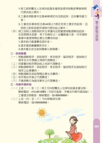 %u4e00%u3001%u53ef%u7533%u8acb%u6276%u52a9%u4e4b%u60c5%u5f62%uff08%u4e00%uff09%u52de%u5de5%u6709%u4ee5%u4e0b%u60c5%u5f62%u4e4b%u4e00%uff0c%u7d93%u4e3b%u7ba1%u6a5f%u95dc%u8abf%u89e3%u4e0d%u6210%u7acb%u800c%u5411%u6cd5%u9662%u8072%u8acb%u52de%u52d5%u8abf%u89e3%u6216%u8d77%u8a34%uff0c%u4e14%u975e%u5c6c%u6709%u8cc7%u529b%u8005%uff0c%u53ef%u7533%u8acb%u5f8b%u5e2b%u4ee3%u7406%u6276%u52a9%uff1a1.%u8207%u96c7%u4e3b%u767c%u751f%u52de%u52d5%u57fa%u6e96%u6cd5%u7d42%u6b62%u52de%u52d5%u5951%u7d04%u3001%u7a4d%u6b20%u5de5%u8cc7%u3001%u8cc7%u9063%u8cbb%u6216%u9000%u4f11%u91d1%u4e4b%u722d%u8b70%u30022.%u906d%u9047%u8077%u696d%u707d%u5bb3%uff0c%u96c7%u4e3b%u672a%u7d66%u8207%u88dc%u511f%u6216%u8ce0%u511f%u30023.%u96c7%u4e3b%u672a%u4f9d%u52de%u5de5%u4fdd%u96aa%u689d%u4f8b%u3001%u52de%u5de5%u8077%u696d%u707d%u5bb3%u4fdd%u96aa%u53ca%u4fdd%u8b77%u6cd5%u6216%u5c31%u696d%u4fdd%u96aa%u6cd5%u8fa6%u7406%u52a0%u4fdd%u6216%u6295%u4fdd%u85aa%u8cc7%u4ee5%u591a%u5831%u5c11%uff0c%u81f4%u52de%u5de5%u53d7%u6709%u640d%u5931%u30024.%u4e0d%u7576%u52de%u52d5%u884c%u70ba%u88c1%u6c7a%u59d4%u54e1%u6703%u88c1%u6c7a%u8a8d%u5b9a%u96c7%u4e3b%u6709%u4e0d%u7576%u52de%u52d5%u884c%u70ba%uff0c%u96c7%u4e3b%u4ecd%u4ee5%u52de%u5de5%u70ba%u88ab%u544a%u63d0%u8d77%u8a34%u8a1f%u8005%u3002%uff08%u5f97%u4e0d%u7d93%u8abf%u89e3%u7a0b%u5e8f%uff09%u56e0%u96c7%u4e3b%u9055%u53cd%u8077%u696d%u5b89%u5168%u885b%u751f%u6cd5%u81f4%u52de%u5de5%u767c%u751f%u8077%u696d%u707d%u5bb3%u4e4b%u5211%u4e8b%u5be9%u5224%u7a0b%u5e8f%u958b%u59cb%u524d%u4e4b%u5f8b%u5e2b%u4ee3%u7406%u30025.%u4e0a%u8ff01.2.3.%u60c5%u5f62%uff0c%u96c7%u4e3b%u672a%u5c65%u884c%u7d93%u4e3b%u7ba1%u6a5f%u95dc%u8abf%u89e3%u6210%u7acb%u4e4b%u8abf%u89e3%u5167%u5bb9%uff0c%u52de%u5de5%u8072%u8acb%u4fdd%u5168%u7a0b%u5e8f%u6216%u5f37%u5236%u57f7%u884c%u7a0b%u5e8f%u3002(%u81ea115%u5e741%u67081%u65e5%u8d77%u65bd%u884c)6.%u4e0a%u8ff01.2.3.%u60c5%u5f62%u6838%u51c6%u6276%u52a9%u5f8c%uff0c%u52de%u5de5%u7d93%u96c7%u4e3b%u65bc%u540c%u4e00%u8a34%u8a1f%u7a0b%u5e8f%u63d0%u8d77%u53cd%u8a34%u3002(%u81ea115%u5e741%u67081%u65e5%u8d77%u65bd%u884c%uff0c%u5f97%u4e0d%u7d93%u8abf%u89e3%u7a0b%u5e8f)7.%uff08%u4e8c%uff09%u5de5%u6703%u6709%u4ee5%u4e0b%u60c5%u5f62%u53ef%u7533%u8acb%u5f8b%u5e2b%u4ee3%u7406%u6276%u52a9%uff1a1.%u52de%u5de5%u6709%uff08%u4e00%uff09%u60c5%u5f62%uff0c%u4f9d%u6c11%u4e8b%u8a34%u8a1f%u6cd5%u7b2c44%u689d%u4e4b1%u7b2c1%u9805%u898f%u5b9a%uff0c%u9078%u5b9a%u5de5%u6703%u5411%u6cd5%u9662%u8d77%u8a34%uff0c%u4e14%u52de%u5de5%u975e%u5c6c%u6709%u8cc7%u529b%u8005%u30022.%u5de5%u6703%u8a8d%u96c7%u4e3b%u4fb5%u5bb3%u5176%u591a%u6578%u6703%u54e1%u5229%u76ca%uff0c%u7d93%u4e3b%u7ba1%u6a5f%u95dc%u8abf%u89e3%u4e0d%u6210%u7acb%uff0c%u4f9d%u52de%u52d5%u4e8b%u4ef6%u6cd5%u7b2c40%u689d%u7b2c1%u9805%u898f%u5b9a%u5411%u6cd5%u9662%u8d77%u8a34%uff0c%u4e14%u5de5%u6703%u975e%u5c6c%u6709%u8cc7%u529b%u8005%u3002%uff08%u4e09%uff09%u6709%u4e0b%u5217%u60c5%u5f62%u4e4b%u4e00%uff0c%u5f97%u7533%u8acb%u52de%u52d5%u8abf%u89e3%u7a0b%u5e8f%u3001%u8a34%u8a1f%u7a0b%u5e8f%u3001%u4fdd%u5168%u7a0b%u5e8f%u3001%u7763%u4fc3%u7a0b%u5e8f%u53ca%u5f37%u5236%u57f7%u884c%u7a0b%u5e8f%u4e4b%u5fc5%u8981%u8cbb%u7528(%u5982%u5224%u8cbb%u3001%u8072%u8acb%u8cbb%u6216%u6216%u57f7%u884c%u8cbb%u7b49)%uff1a%u52a9%u6276%u4e4b%u8a1f%u8a34%u5de5%u52de1.%u52de%u5de5%u7d93%u8ca1%u5718%u6cd5%u4eba%u6cd5%u5f8b%u6276%u52a9%u57fa%u91d1%u6703%u6838%u51c6%u63d0%u4f9b%u52de%u52d5%u90e8%u5c08%u6848%u5f8b%u5e2b%u4ee3%u7406%u6276%u52a9%u4e4b%u6848%u4ef6%u30022.%u5de5%u6703%u4f9d%u52de%u52d5%u4e8b%u4ef6%u6cd5%u7b2c40%u689d%u898f%u5b9a%u5411%u6cd5%u9662%u8d77%u8a34%uff0c%u4e14%u975e%u5c6c%u6709%u8cc7%u529b%u8005%u30023.%u5de5%u6703%u4f9d%u6c11%u4e8b%u8a34%u8a1f%u6cd5%u7b2c44%u689d%u4e4b1%u898f%u5b9a%u53d7%u52de%u5de5%u9078%u5b9a%u800c%u8d77%u8a34%uff0c%u4e14%u8a72%u52de%u5de5%u7d93%u6838%u51c6%u63d0%u4f9b%u5f8b%u5e2b%u4ee3%u7406%u6276%u52a9%u4e4b%u6848%u4ef6%u3002%uff08%u56db%uff09%u52de%u5de5%u56e0%u7d42%u6b62%u52de%u52d5%u5951%u7d04%u6240%u751f%u722d%u8b70%u5411%u6cd5%u9662%u8072%u8acb%u52de%u52d5%u8abf%u89e3%u6216%u8d77%u8a34%uff0c%u65bc%u8a72%u671f%u9593%u672a%u5c31%u696d%uff0c%u6709%u4e0b%u5217%u60c5%u5f62%u4e4b%u4e00%u4e14%u5c6c%u7121%u8cc7%u529b%u8005%uff0c%u53ef%u7533%u8acb%u52de%u52d5%u4e8b%u4ef6%u8655%u7406%u671f%u9593%u5fc5%u8981%u751f%u6d3b%u8cbb%u7528%u6276%u52a9%uff1a1.%u8acb%u6c42%u7d66%u4ed8%u8cc7%u9063%u8cbb%u6216%u9000%u4f11%u91d1%u30022.%u8acb%u6c42%u78ba%u8a8d%u50f1%u50ad%u95dc%u4fc2%u5b58%u5728%u30023.%u8acb%u6c42%u96c7%u4e3b%u4f9d%u6cd5%u7d66%u8207%u8077%u696d%u707d%u5bb3%u88dc%u511f%u3002%u4e8c%u3001%u6276%u52a9%u7bc4%u570d%uff08%u4e00%uff09%u52de%u52d5%u8abf%u89e3%u7a0b%u5e8f%u3001%u8a34%u8a1f%u7a0b%u5e8f%u3001%u4fdd%u5168%u7a0b%u5e8f%u3001%u7763%u4fc3%u7a0b%u5e8f%u3001%u5f37%u5236%u57f7%u884c%u7a0b%u5e8f%u53ca%u6587%u4ef6%u64b0%u64ec%u4e4b%u5f8b%u5e2b%u4ee3%u7406%u916c%u91d1%u3002%uff08%u4e8c%uff09%u5211%u4e8b%u5be9%u5224%u7a0b%u5e8f%u958b%u59cb%u524d%u4e4b%u544a%u8a34%u4ee3%u7406%u916c%u91d1%u3002%uff08%u4e09%uff09%u52de%u52d5%u8abf%u89e3%u7a0b%u5e8f%u3001%u8a34%u8a1f%u7a0b%u5e8f%u3001%u4fdd%u5168%u7a0b%u5e8f%u3001%u7763%u4fc3%u7a0b%u5e8f%u53ca%u5f37%u5236%u57f7%u884c%u7a0b%u5e8f%u4e4b%u5fc5%u8981%u8cbb%u7528%u3002%uff08%u56db%uff09%u52de%u52d5%u8abf%u89e3%u53ca%u8a34%u8a1f%u671f%u9593%u5fc5%u8981%u751f%u6d3b%u8cbb%u7528%u3002%uff08%u4e94%uff09%u4f9d%u4ef2%u88c1%u6cd5%u4ef2%u88c1%u4e4b%u4ee3%u7406%u916c%u91d1%u3002%uff08%u516d%uff09%u4e0d%u7576%u52de%u52d5%u884c%u70ba%u88c1%u6c7a%u6848%u4ef6%u4e4b%u4ee3%u7406%u916c%u91d1%u3002%u4e09%u3001%u5411%u8ab0%u7533%u8acb%u6276%u52a9%uff08%u4e00%uff09%u4e0a%u8ff0%uff08%u4e00%uff09%u81f3%uff08%u4e09%uff09%u52de%u5de5%u53ef%u5411%u8ca1%u5718%u6cd5%u4eba%u6cd5%u5f8b%u6276%u52a9%u57fa%u91d1%u6703%u6d3d%u8a62%uff0c%u806f%u7d61%u96fb%u8a71%uff1a412-8518%u8f493%uff08%u5e02%u8a71%u53ef%u76f4%u64a5%uff0c%u624b%u6a5f%u53ca%u5916%u7e23%u5e02%u8acb%u52a002%uff09%uff1b%u5de5%u6703%u8acb%u6d3d%u52de%u52d5%u90e8%uff0c%u806f%u7d61%u96fb%u8a71%uff1a02-89956866%u3002%uff08%u4e8c%uff09%u4e0a%u8ff0%uff08%u56db%uff09%u81f3%uff08%u516d%uff09%u53