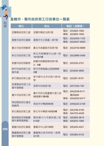 078%u9304%u9644130%u76f4%u8f44%u5e02%u3001%u7e23%u5e02%u653f%u5e9c%u52de%u5de5%u884c%u653f%u55ae%u4f4d%u4e00%u89bd%u8868%u55ae%u4f4d %u5730%u5740 %u96fb%u8a71%uff08%u6216%u50b3%u771f%uff09%u5b9c%u862d%u7e23%u653f%u5e9c%u52de%u5de5%u8655 %u5b9c%u862d%u5e02%u7e23%u653f%u5317%u8def1%u865f %u96fb%u8a71%uff1a(03)925-1000%u50b3%u771f%uff1a(03)925-1093%u57fa%u9686%u5e02%u653f%u5e9c%u793e%u6703%u8655 %u57fa%u9686%u5e02%u4e2d%u6b63%u5340%u7fa9%u4e00%u8def1%u865f %u96fb%u8a71%uff1a(02)2420-1122%u50b3%u771f%uff1a(02)2427-2620%u81fa%u5317%u5e02%u653f%u5e9c%u52de%u52d5%u5c40 %u81fa%u5317%u5e02%u4fe1%u7fa9%u5340%u5e02%u5e9c%u8def1%u865f %u96fb%u8a71%uff1a(02)2720-8889%u65b0%u5317%u5e02%u653f%u5e9c%u52de%u5de5%u5c40 %u65b0%u5317%u5e02%u677f%u6a4b%u5340%u4e2d%u5c71%u8def%u4e00%u6bb5161%u865f7%u6a13 %u96fb%u8a71%uff1a(02)2960-3456%u6843%u5712%u5e02%u653f%u5e9c%u52de%u52d5%u5c40 %u6843%u5712%u5e02%u6843%u5712%u5340%u7e23%u5e9c%u8def%u65b0%u7af9%u5e02%u6771%u5340%u9f8d%u5c71%u897f%u8def99%u865f2%u6a131%u865f3%u30014%u6a13 %u96fb%u8a71%uff1a(03)332-2101%u65b0%u7af9%u5e02%u653f%u5e9c%u52de%u5de5%u53ca%u9752%u5e74%u8655 %u96fb%u8a71%uff1a(03)532-4900%u65b0%u7af9%u7e23%u653f%u5e9c%u52de%u5de5%u8655 %u65b0%u7af9%u7e23%u7af9%u5317%u5e02%u5149%u660e%u516d%u8def10%u865f %u96fb%u8a71%uff1a(03)551-8101%u82d7%u6817%u7e23%u653f%u5e9c%u52de%u5de5%u53ca%u9752%u5e74%u767c%u5c55%u8655 %u82d7%u6817%u5e02%u5e9c%u524d%u8def1%u865f %u96fb%u8a71%uff1a(037)332-150%u81fa%u4e2d%u5e02%u653f%u5e9c%u52de%u5de5%u5c40 %u81fa%u4e2d%u5e02%u897f%u5c6f%u5340%u81fa%u7063%u5927%u9053%u4e09%u6bb599%u865f%u60e0%u4e2d%u6a134%u6a13%u96fb%u8a71%uff1a(04)2228-9111 %u8f4935009%u50b3%u771f%uff1a(04)2252-0417%u5357%u6295%u7e23%u653f%u5e9c%u793e%u6703%u53ca%u52de%u52d5%u5c40 %u5357%u6295%u5e02%u4e2d%u8208%u8def660%u865f %u96fb%u8a71%uff1a(049)222-2106 %u5f70%u5316%u7e23%u653f%u5e9c%u52de%u5de5%u8655 %u5f70%u5316%u5e02%u4e2d%u8208%u8def100%u865f8%u6a13 %u96fb%u8a71%uff1a(04)726-4150%u50b3%u771f%uff1a(04)723-4438%u96f2%u6797%u7e23%u653f%u5e9c%u52de%u52d5%u66a8%u9752%u5e74%u4e8b%u52d9%u767c%u5c55%u8655%u96f2%u6797%u7e23%u6597%u516d%u5e02%u96f2%u6797%u8def%u4e8c%u6bb5515%u865f%u96fb%u8a71%uff1a(05)552-2810%u50b3%u771f%uff1a(05)533-1080%u5609%u7fa9%u5e02%u653f%u5e9c%u793e%u6703%u8655 %u5609%u7fa9%u5e02%u4e2d%u5c71%u8def199%u865f %u96fb%u8a71%uff1a(05)225-4321%u5609%u7fa9%u7e23%u653f%u5e9c%u52de%u5de5%u66a8%u9752%u5e74%u767c%u5c55%u8655%u5609%u7fa9%u7e23%u592a%u4fdd%u5e02%u7965%u548c%u4e00%u8def%u6771%u6bb51%u865f %u96fb%u8a71%uff1a(05)362-0123079%u9304%u9644%u55ae%u4f4d %u5730%u5740 %u96fb%u8a71%uff08%u6216%u50b3%u771f%uff09%u81fa%u5357%u5e02%u653f%u5e9c%u52de%u5de5%u5c40%u81fa%u5357%u5e02%u5b89%u5e73%u5340%u6c38%u83ef%u8def%u4e8c%u6bb56%u865f8%u6a13%uff08%u6c38%u83ef%u5e02%u653f%u4e2d%u5fc3%uff09 %u96fb%u8a71%uff1a(06)298-2331 %u81fa%u5357%u5e02%u65b0%u71df%u5340%u6c11%u6cbb%u8def36%u865f7%u6a13%uff08%u5c40%u672c%u90e8%uff09%u9ad8%u96c4%u5e02%u653f%u5e9c%u52de%u5de5%u5c40 %u9ad8%u96c4%u5e02%u524d%u93ae%u5340%u93ae%u4e2d%u8def6%u865f %u96fb%u8a71%uff1a(07)812-4613 %u5c4f%u6771%u5e02%u81ea%u7531%u8def17%u865f %u96fb%u8a71%uff1a(08)755-8048%u50b3%u771f%uff1a(08)751-5390%u96fb%u8a71%uff1a(06)632-2231 (%u5206%u6a5f6295)%u82b1%u84ee%u7e23%u653f%u5e9c%u793e%u6703%u8655 %u82b1%u84ee%u5e02%u5e9c%u524d%u8def17%u865f %u96fb%u8a71%uff1a(03)822-7171%u81fa%u6771%u7e23%u653f%u5e9c%u793e%u6703%u8655 %u81fa%u6771%u5e02%u6842%u6797%u5317%u8def201%u865f %u96fb%u8a71%uff1a(089)351-834%u50b3%u771f%uff1a(089)341-296%u6f8e%u6e56%u7e23%u653f%u5e9c%u793e%u6703%u8655 %u6f8e%u6e56%u7e23%u99ac%u516c%u5e02%u6cbb%u5e73%u8def32%u865f%u96fb%u8a71%uff1a(06)927-4400 %u8f49533%u3001541%u3001560%u3001568%u50b3%u771f%uff1a(06)926-8391%u91d1%u9580%u7e23%u653f%u5e9c%u793e%u6703%u8655 %u91d1%u9580%u7e23%u91d1%u57ce%u93ae%u6c11%u6b0a%u8def173%u865f%u96fb%u8a71%uff1a(082)318-823%u50b3%u771f%uff1a(082)320-105%u9023%u6c5f%u7e23%u5357%u7aff%u9109%u4ecb%u58fd%u6751 %u9023%u6c5f%u7e23%u653f%u5e9c%u6c11%u653f%u793e%u6703%u8655 76%u865f %u96fb%u8a71%uff1a(0836)251-31%u5c4f%u6771%u7e23%u653f%u5e9c%u52de%u52d5%u66a8%u9752%u5e74%u767c%u5c55%u8655090